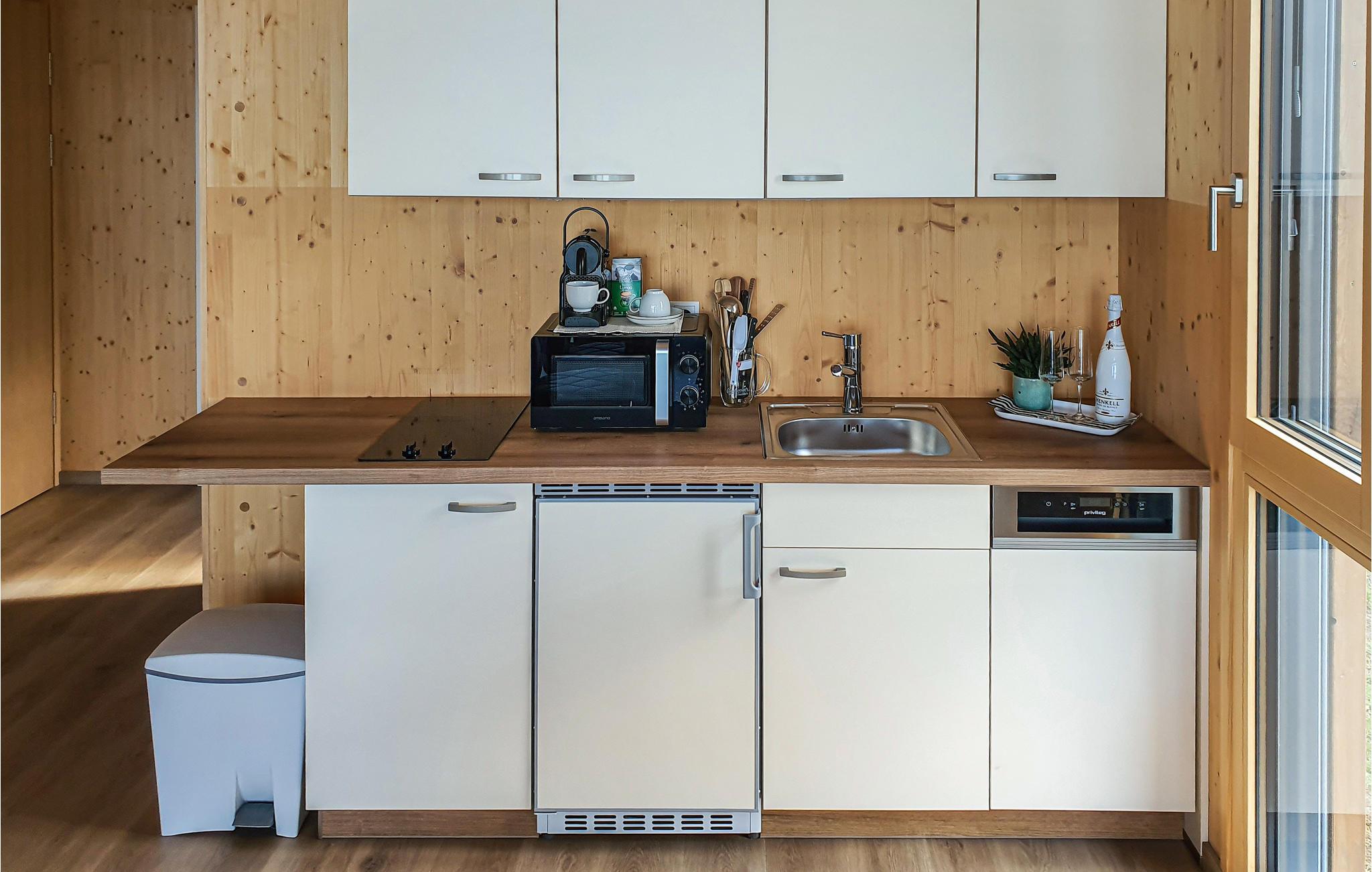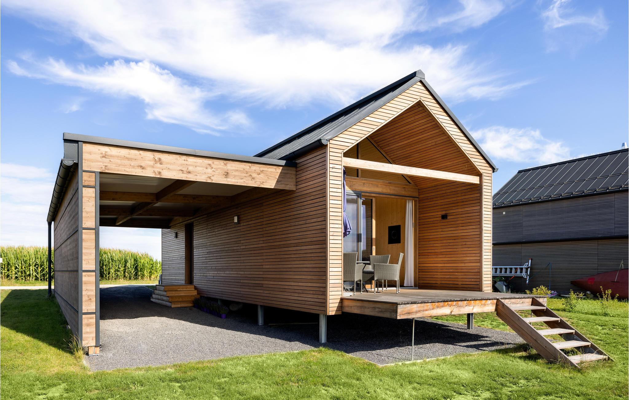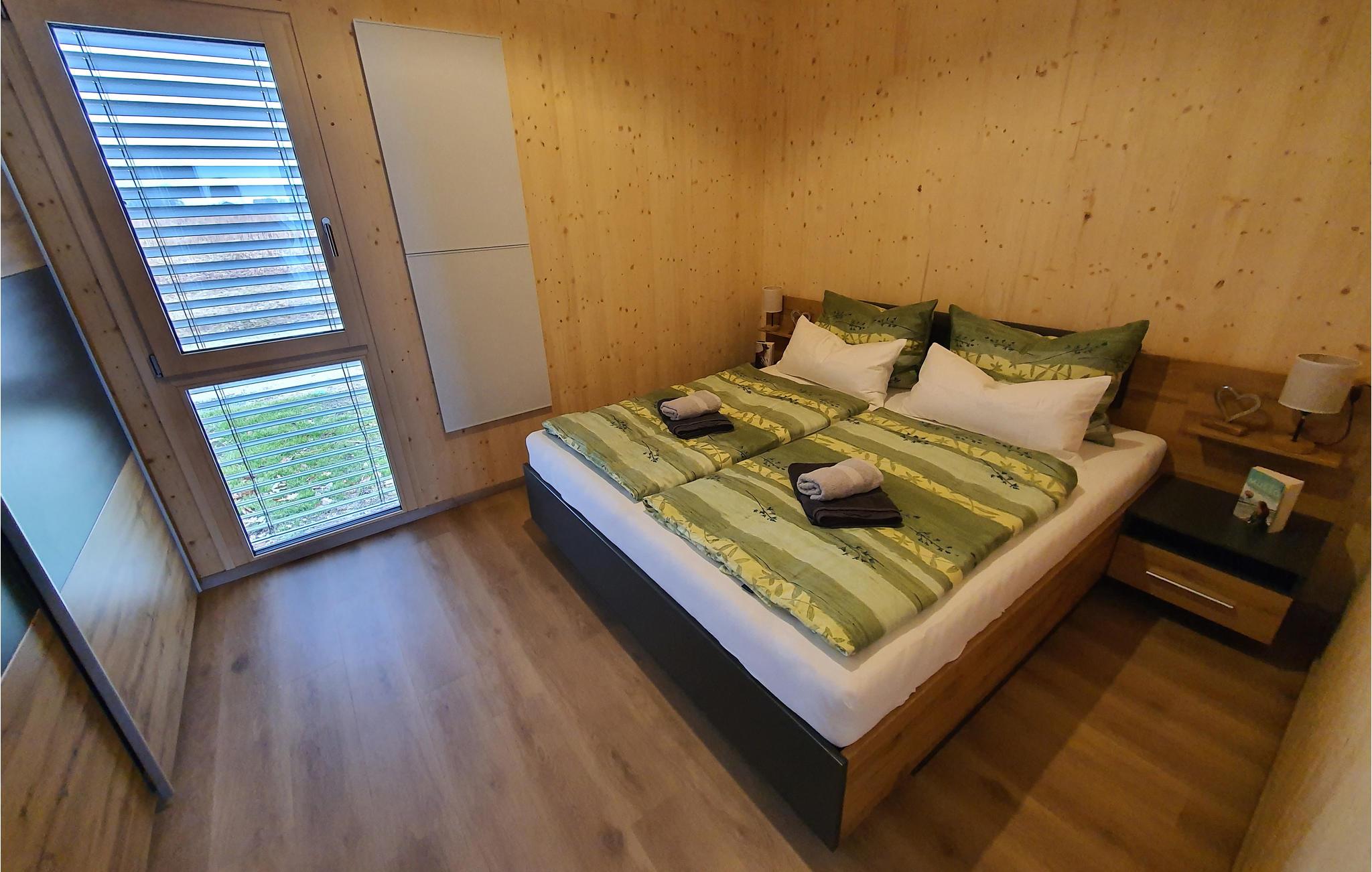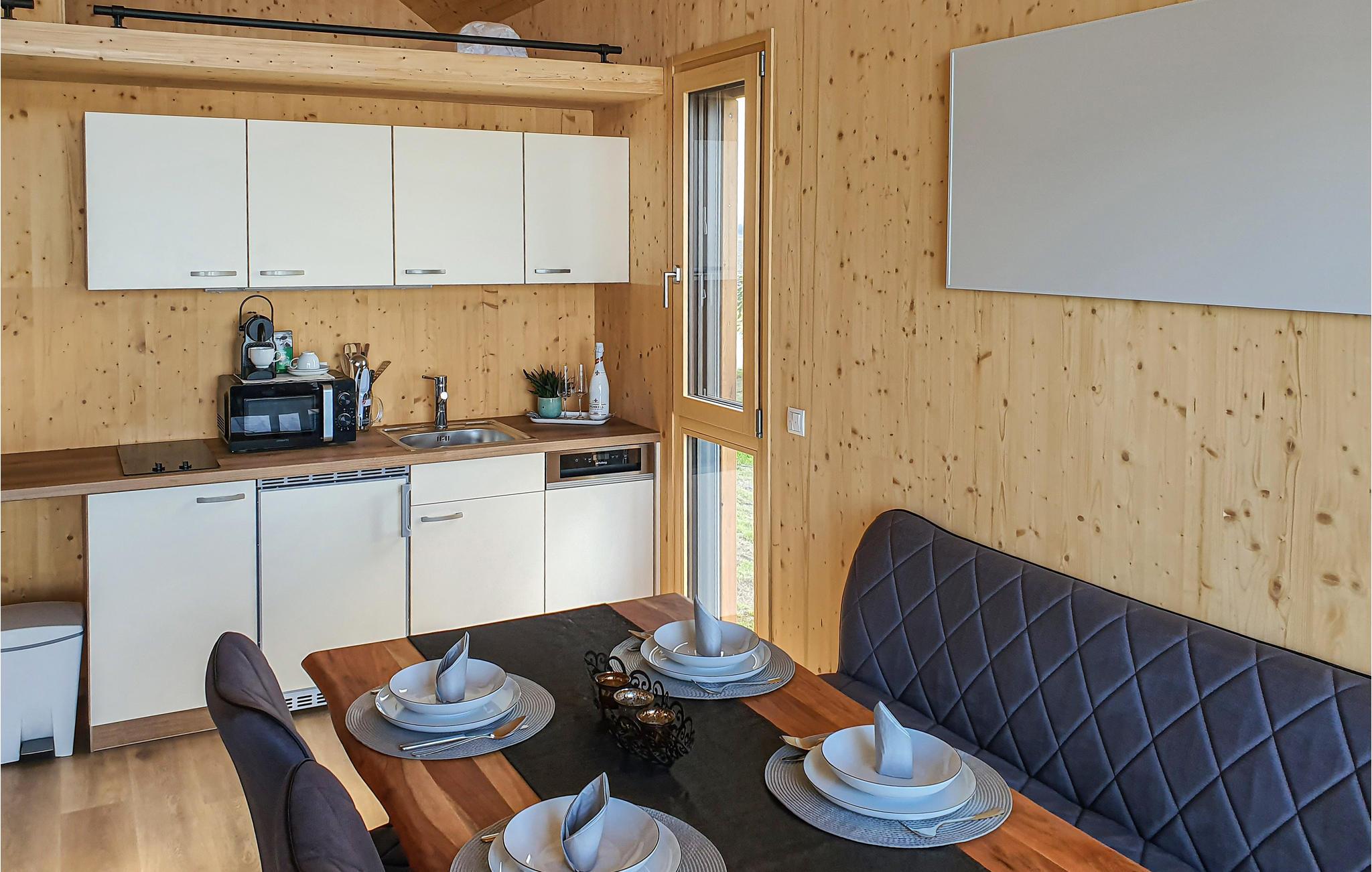 Dette skønne feriehus har plads til fem gæster og er perfekt til en hyggelig familieferie. Der er en stige op til hemsen, hvor I finder en af sengepladserne. Fra opholdsrummet er der direkte udsigt til søen gennem de store panoramavinduer, og på den overdækkede terrasse kan I sætte jer med samme skønne vue og nyde en kop kaffe eller afslutte dagen med et godt glas vin fra regionen. Der er også en grill klar til jeres sommermiddage under åben himmel.