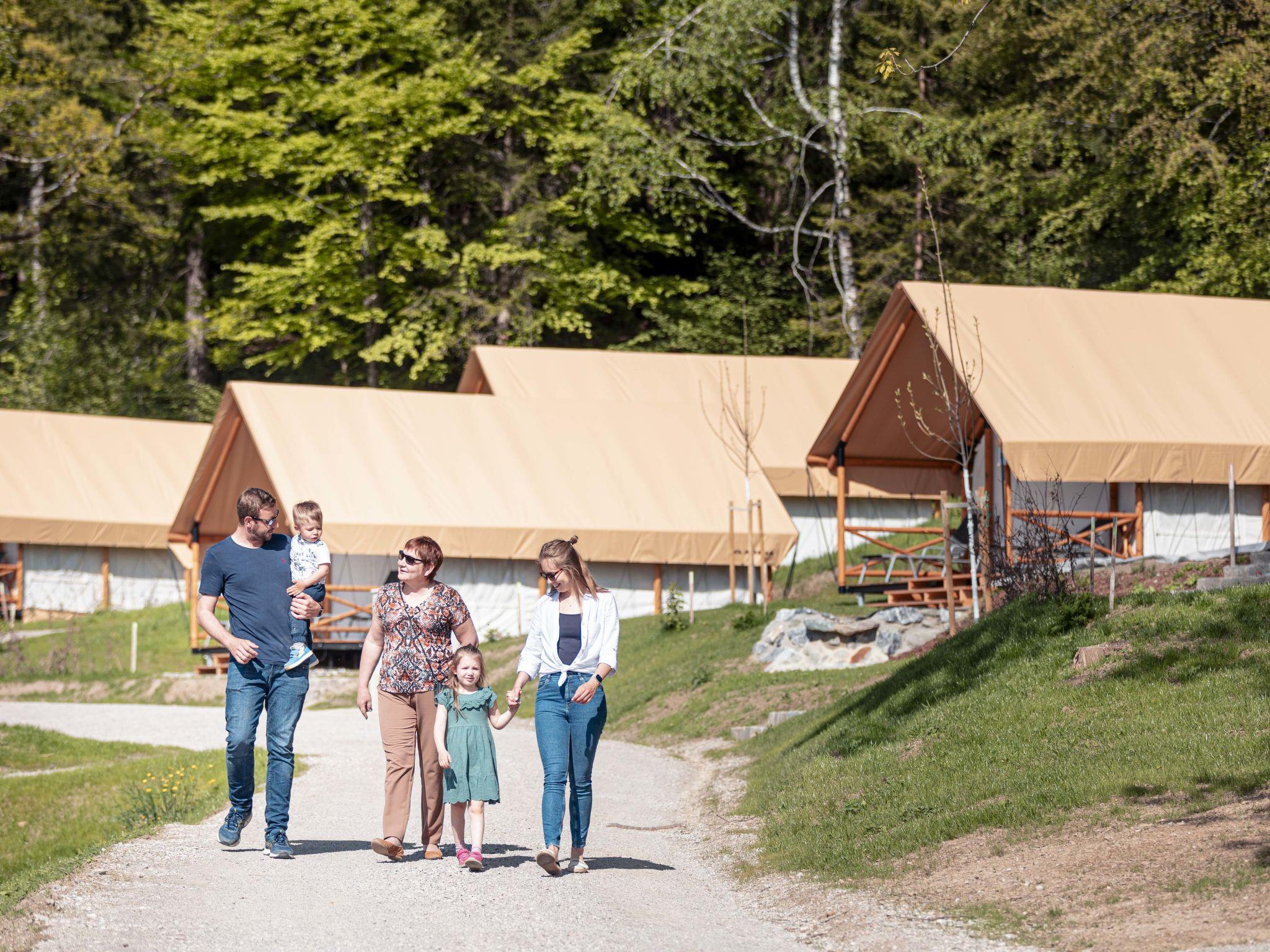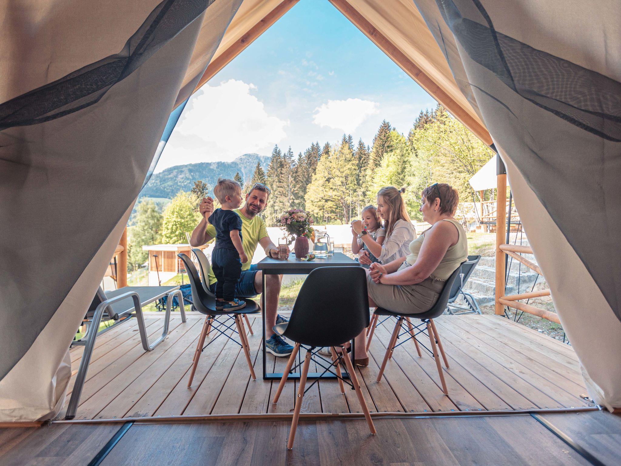 Kötschach-Mauten: Car free modern resort "Chalets/Glamping Nassfeld by AlpsR.", 700 m a.s.l.. 500 m from the centre, in a sunny position on a slope, directly by the skiing area. For shared use: children's playground. In the complex: reception, kiosk. Parking. E-charging station. Supermarket 850 m. Golf course (18 hole) 20 km, skisport facilities, ski rental 200 m. Well-known ski regions can easily be reached: Nassfeld 25 km. Well-known lakes can easily be reached: Pressegger See. Hiking paths: Nassfeld-Pressegger See. The holiday properties may differ in living space, floorplan, equipment and furnishing.