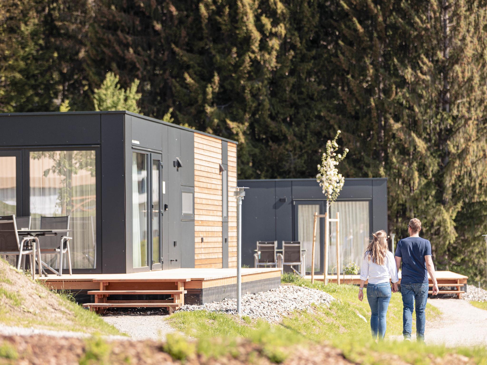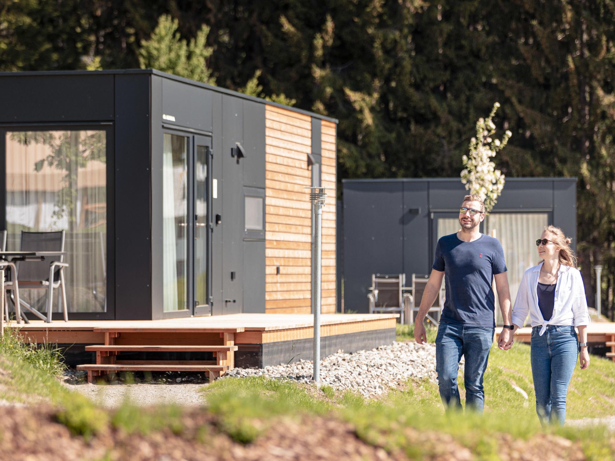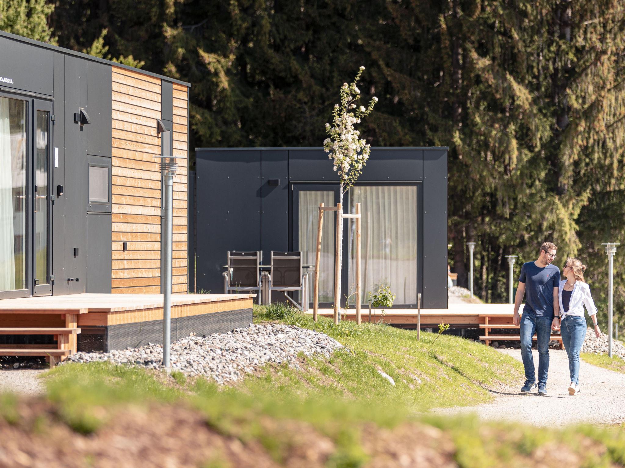 Kötschach-Mauten: Car free modern resort "Chalets/Glamping Nassfeld by AlpsR.", 700 m a.s.l.. 500 m from the centre, in a sunny position on a slope, directly by the skiing area. For shared use: children's playground. In the complex: reception, kiosk. Parking. E-charging station. Supermarket 850 m. Golf course (18 hole) 20 km, skisport facilities, ski rental 200 m. Well-known ski regions can easily be reached: Nassfeld 25 km. Well-known lakes can easily be reached: Pressegger See. Hiking paths: Nassfeld-Pressegger See. The holiday properties may differ in living space, floorplan, equipment and furnishing.