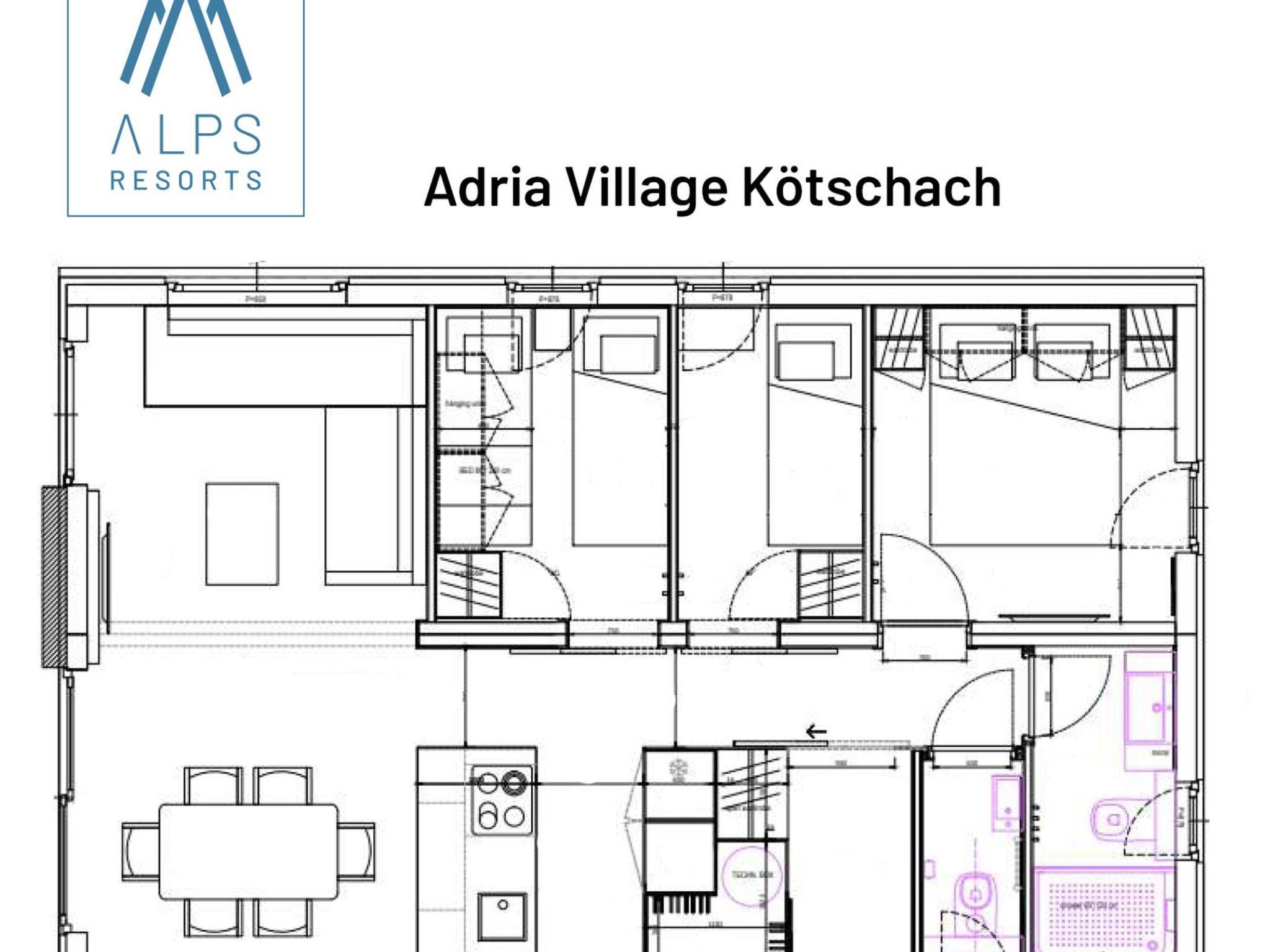 Kötschach-Mauten: Car free modern resort "Chalets/Glamping Nassfeld by AlpsR.", 700 m a.s.l.. 500 m from the centre, in a sunny position on a slope, directly by the skiing area. For shared use: children's playground. In the complex: reception, kiosk. Parking. E-charging station. Supermarket 850 m. Golf course (18 hole) 20 km, skisport facilities, ski rental 200 m. Well-known ski regions can easily be reached: Nassfeld 25 km. Well-known lakes can easily be reached: Pressegger See. Hiking paths: Nassfeld-Pressegger See. The holiday properties may differ in living space, floorplan, equipment and furnishing.
