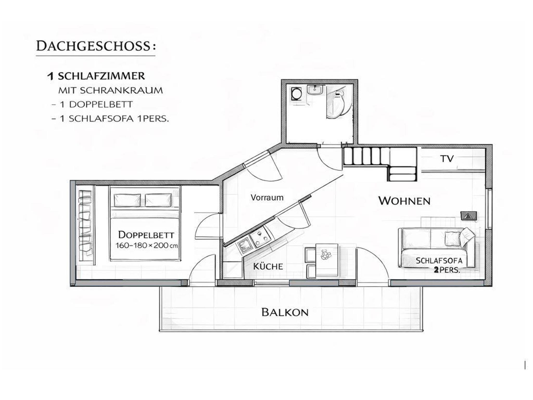 Ferienwohnung mit 2 Schlafzimmern (ein 3-Bett und ein 2-Bett), sowie einen großen Wohnbereich (ausziehbarem 2-Bett Sofa) mit Kochnische. ca. 80 m² groß, geht über 2 Etagen und hat einen eigenen großen Balkon. 2 Etagen für Sie und Ihre Familie oder Freunde.