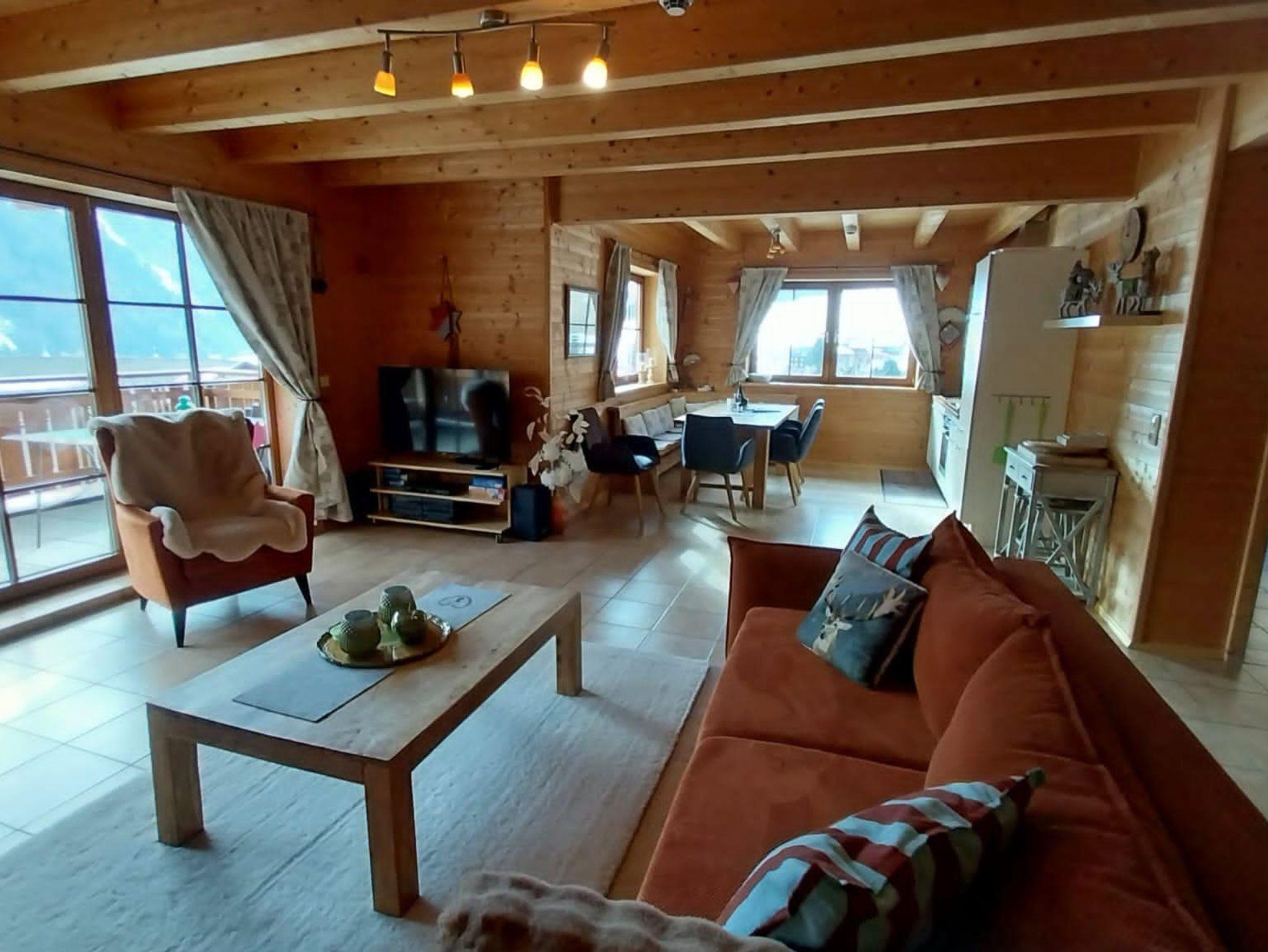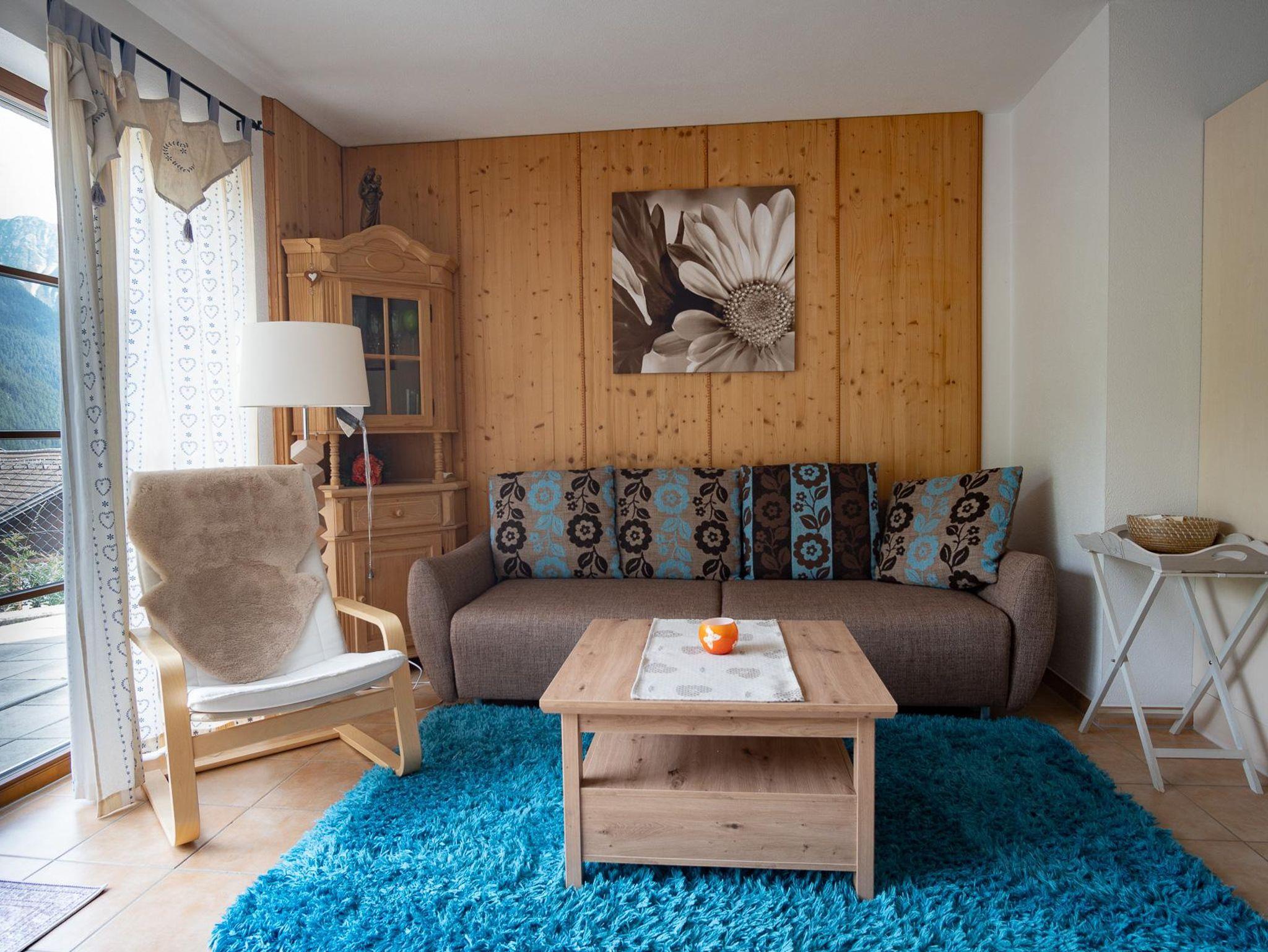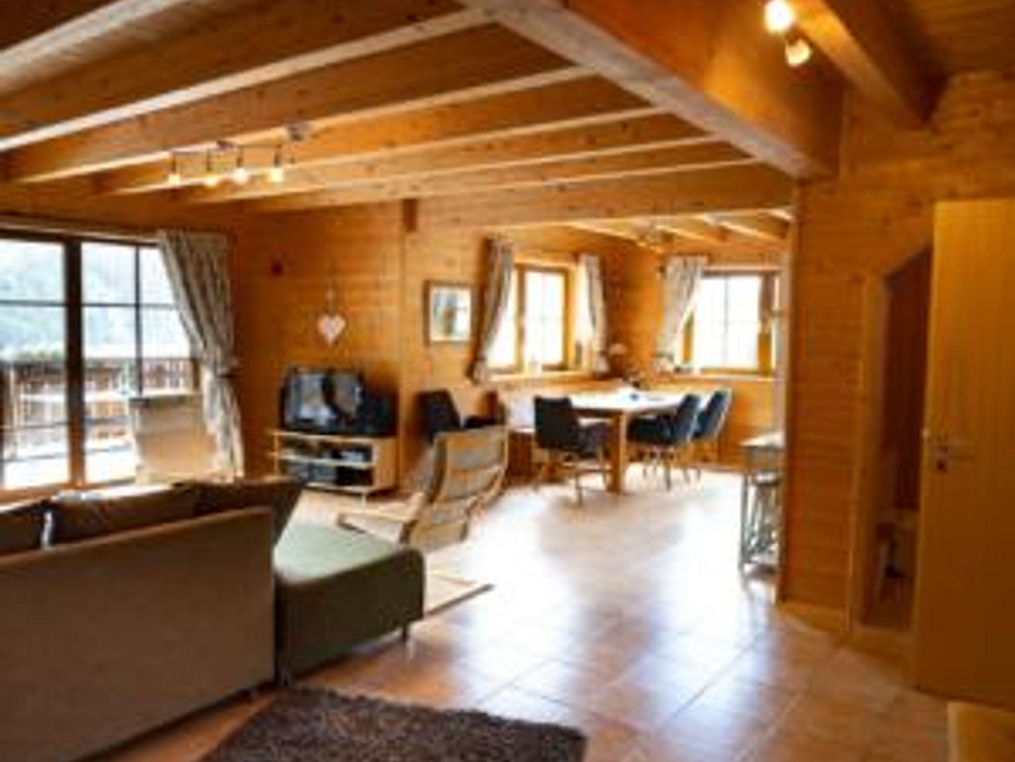 In gemütlicher Holzhausatmosphäre, geräumige Wohnung (95 m²), mit großzügigem Wohnraum, Balkon mit Blick ins Tal.