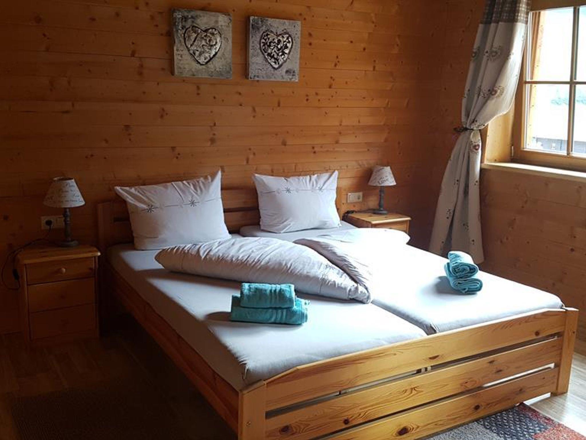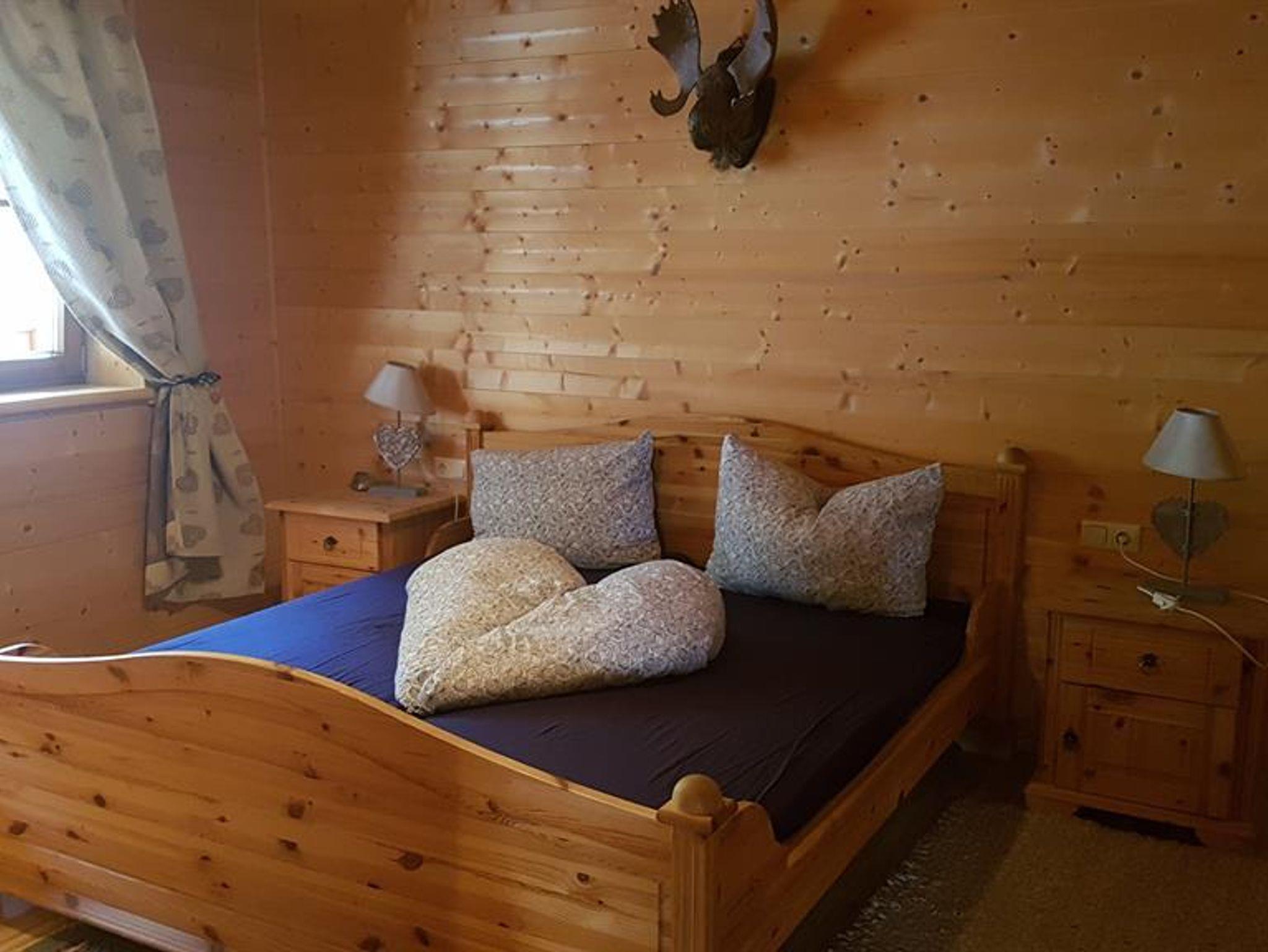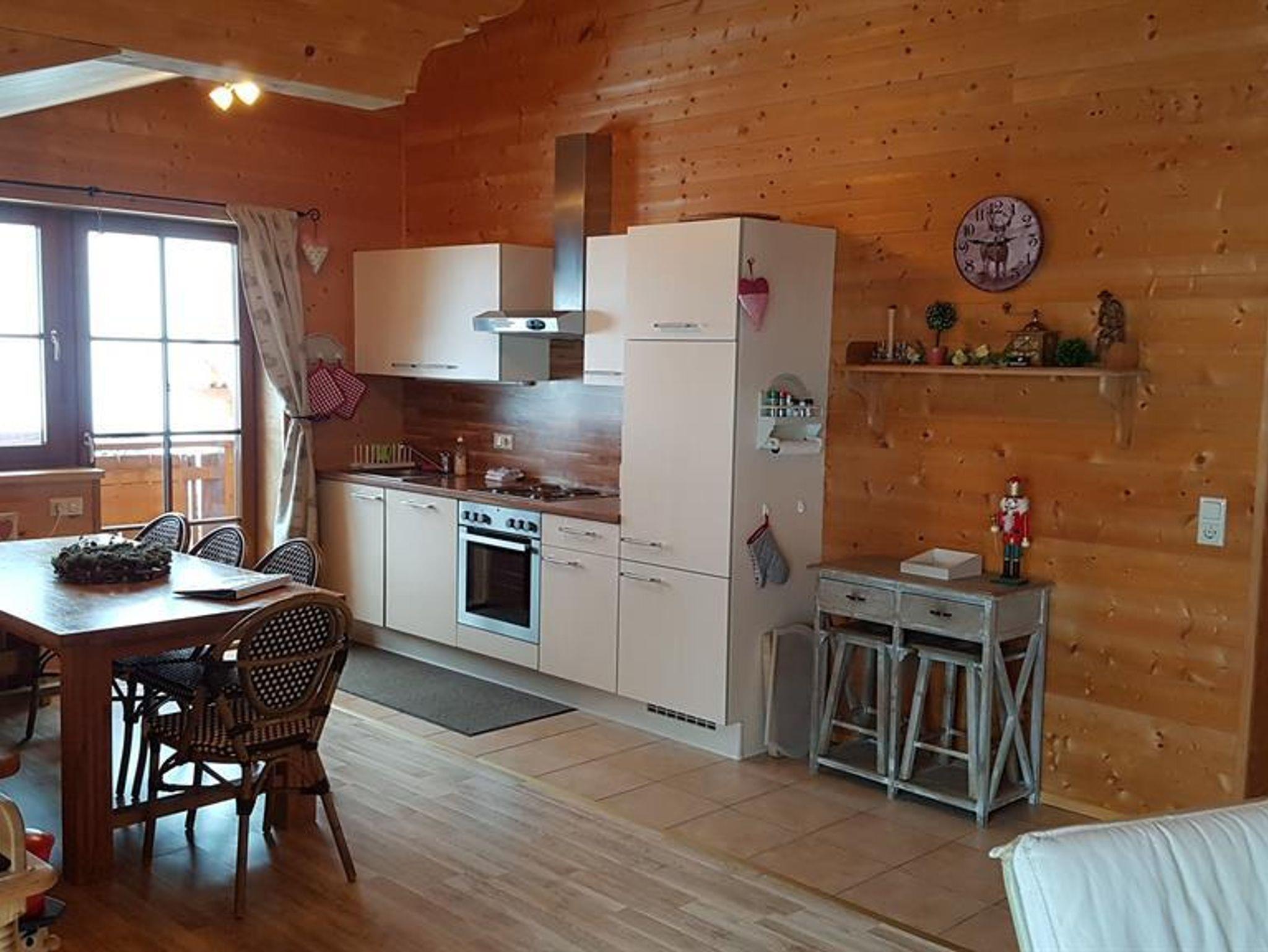 In gemütlicher Holzhausatmosphäre, geräumige Wohnung (95 m²), mit großzügigem Wohnraum, Balkon mit Blick ins Tal.