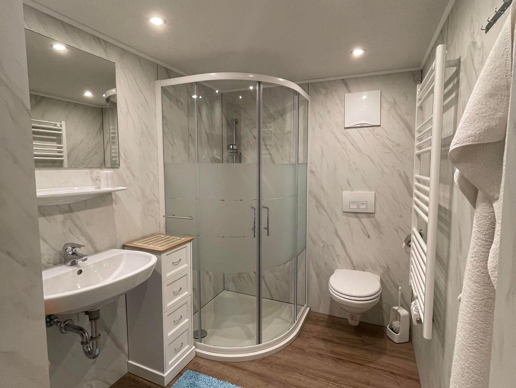 Großes Doppelbettzimmer im Altholzstil. Geräumiges Badezimmer. Blick Richtung Süden.