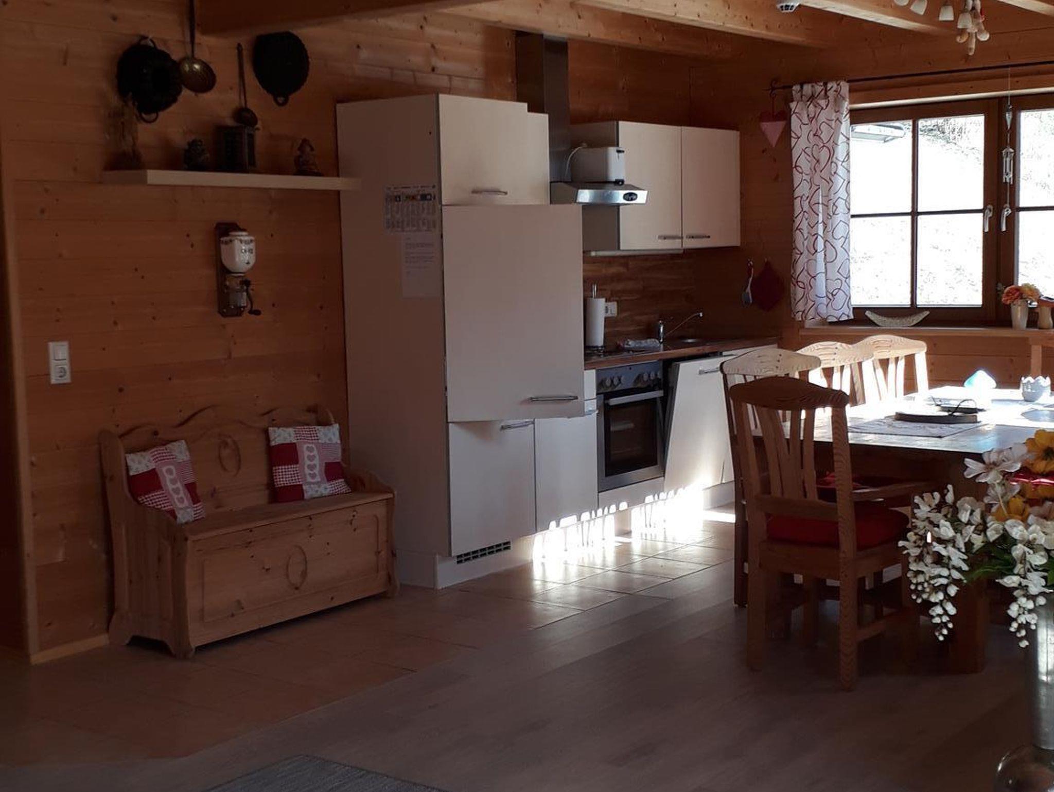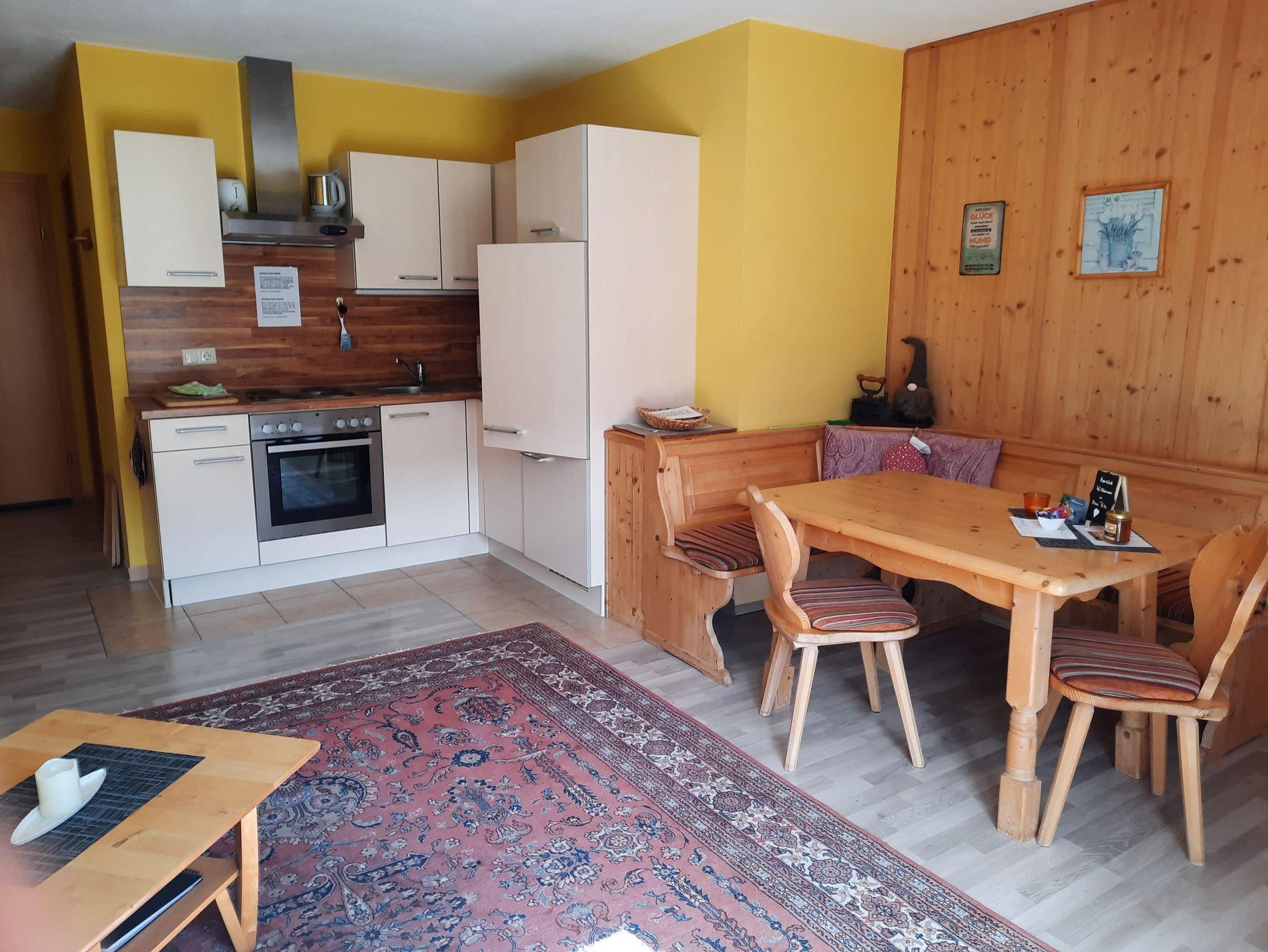 Gemütliche Erdgeschoßwohnung (50 qm) mit Terrasse und Blick über Kals. Voll eingerichtete Einbauküche im großen Wohn/Essbereich, Sitzecke und Schlafsofa für 2. Duschbad mit WC sowie Schlafzimmer mit Doppelbett und großem Kleiderschrank, Gartenmöbel.