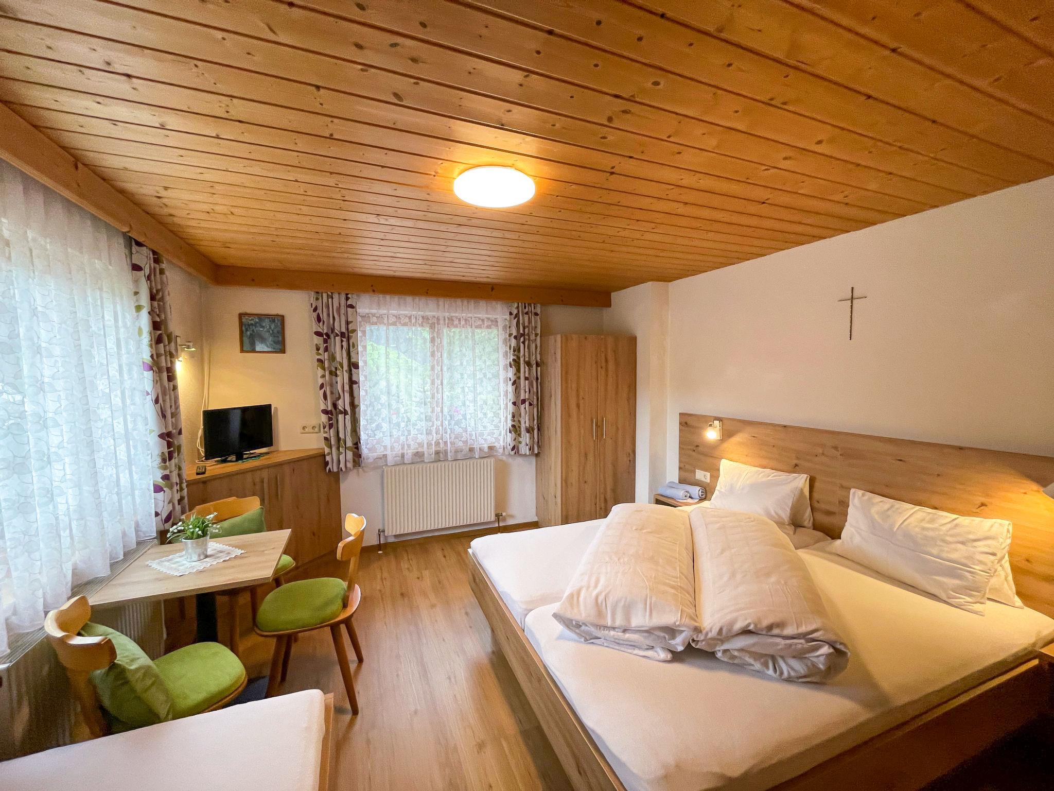 "Maria", 3-room apartment 50 m2, on the ground floor. Cosy furnishings: 1 open double bedroom with satellite TV. 1 room with 1 bed, 1 double bed and satellite TV. Small kitchen-/living room (4 hot plates, oven, toaster, kettle, microwave, electric coffee machine) with dining nook. Shower/WC. Carpet. Patio. Terrace furniture, deck chairs. Beautiful panoramic view of the mountains and the valley. Facilities: baby cot. Please note: one double bedroom is outside the apartment. Non-smokers only. Smoke alarm, fire extinguisher.