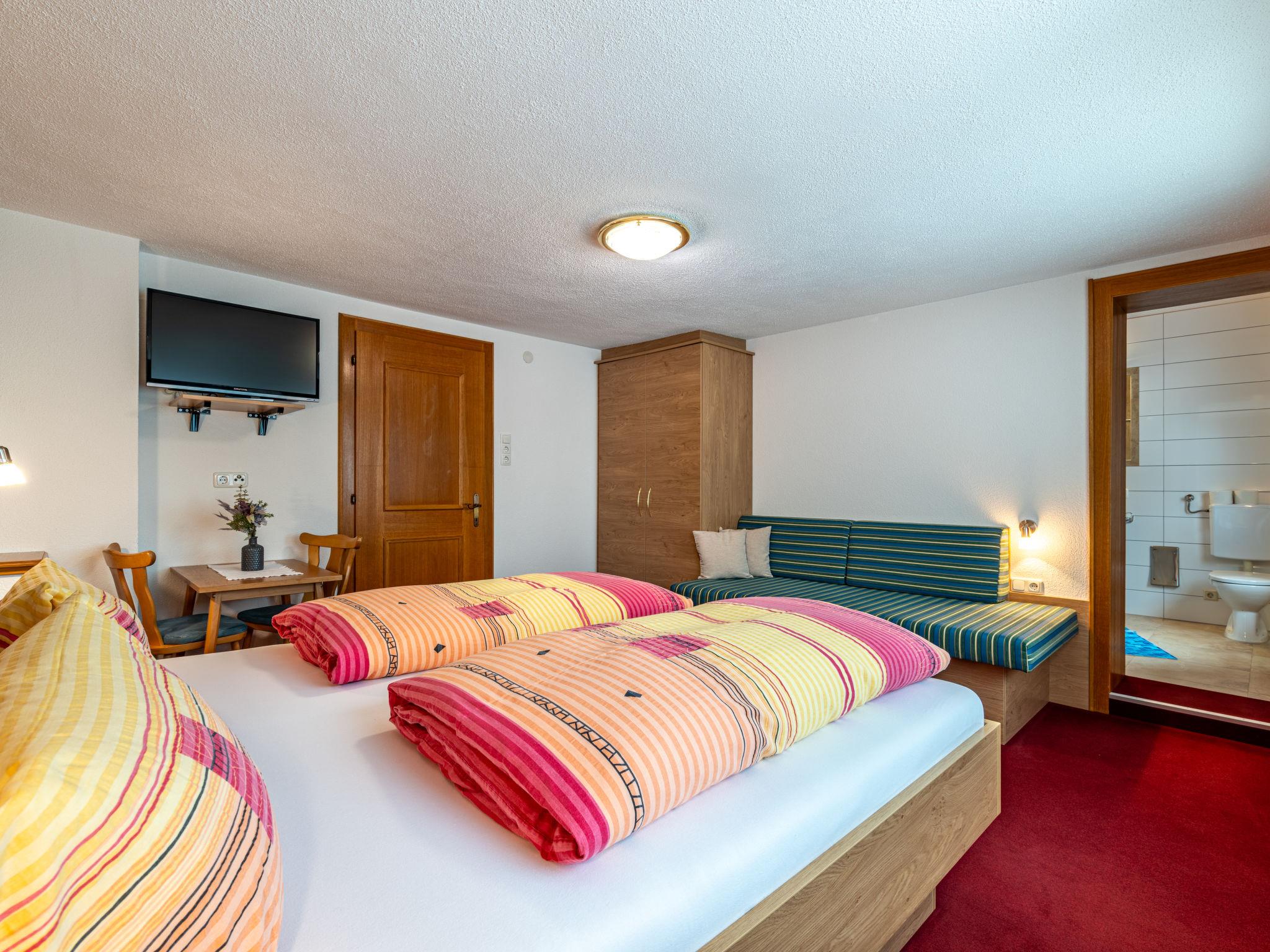 "Grissemann", 5-room apartment 120 m2 on 2 levels. Bright, beautiful and rustic furnishings: upper floor: (exterior staircase), 1 room with 1 sofabed, 1 double bed, bath/WC and satellite TV. 1 room with 1 bed, 1 double bed, hand-basin and satellite TV. Kitchen-/living room (oven, dishwasher, 4 ceramic glass hob hotplates, kettle, microwave, electric coffee machine) with dining table, satellite TV. Shower, sep. WC. 2nd upper floor: 2 rooms, each room with 1 sofabed, 1 double bed, hand-basin and satellite TV. Shower, sep. WC. Carpet. 2 balconies. Facilities: safe, baby cot. Internet (WiFi, free). Please note: private entrance, smoke alarm, fire extinguisher.