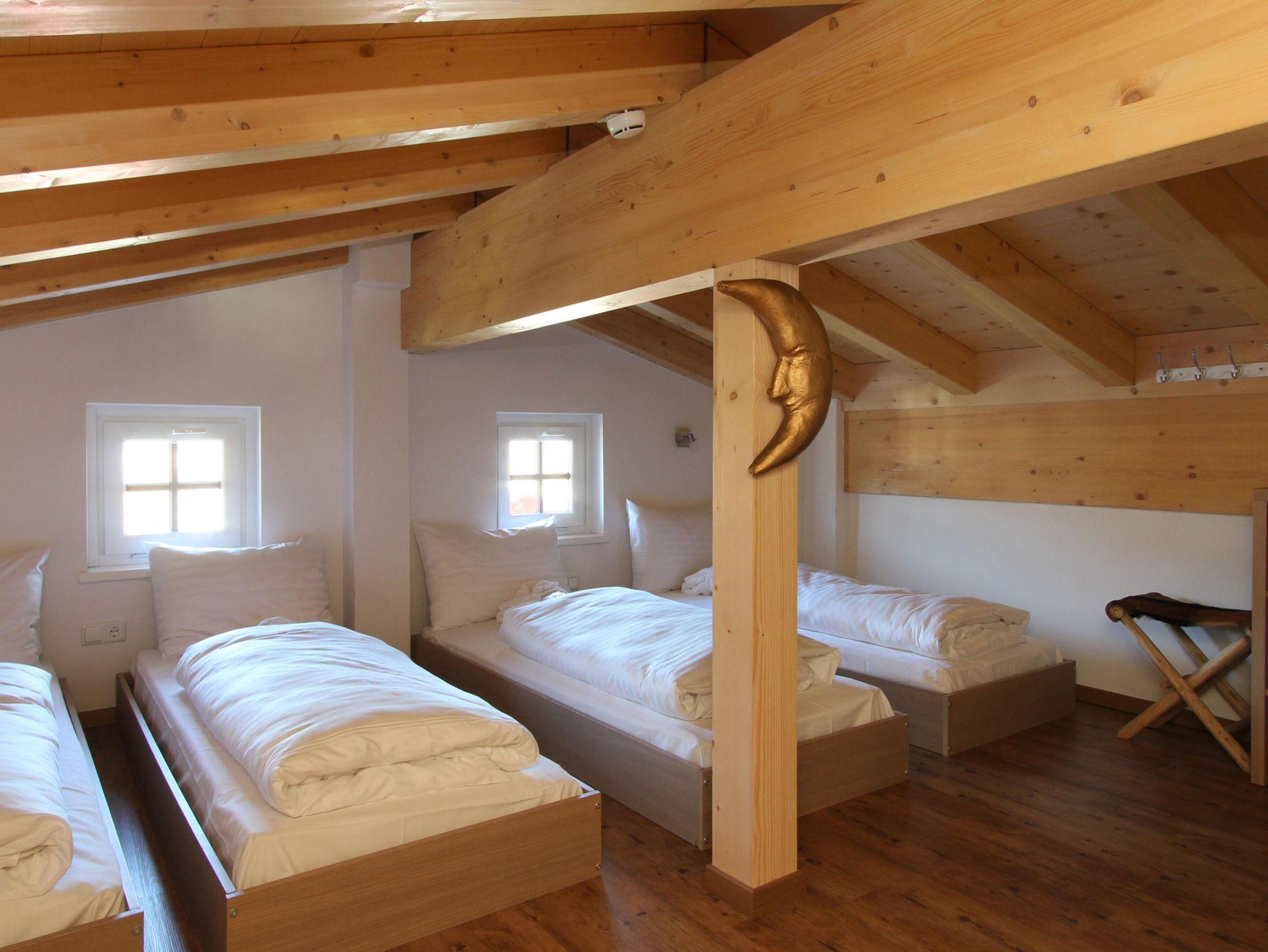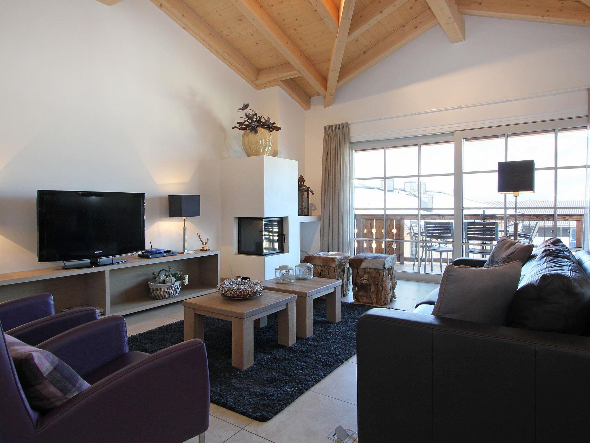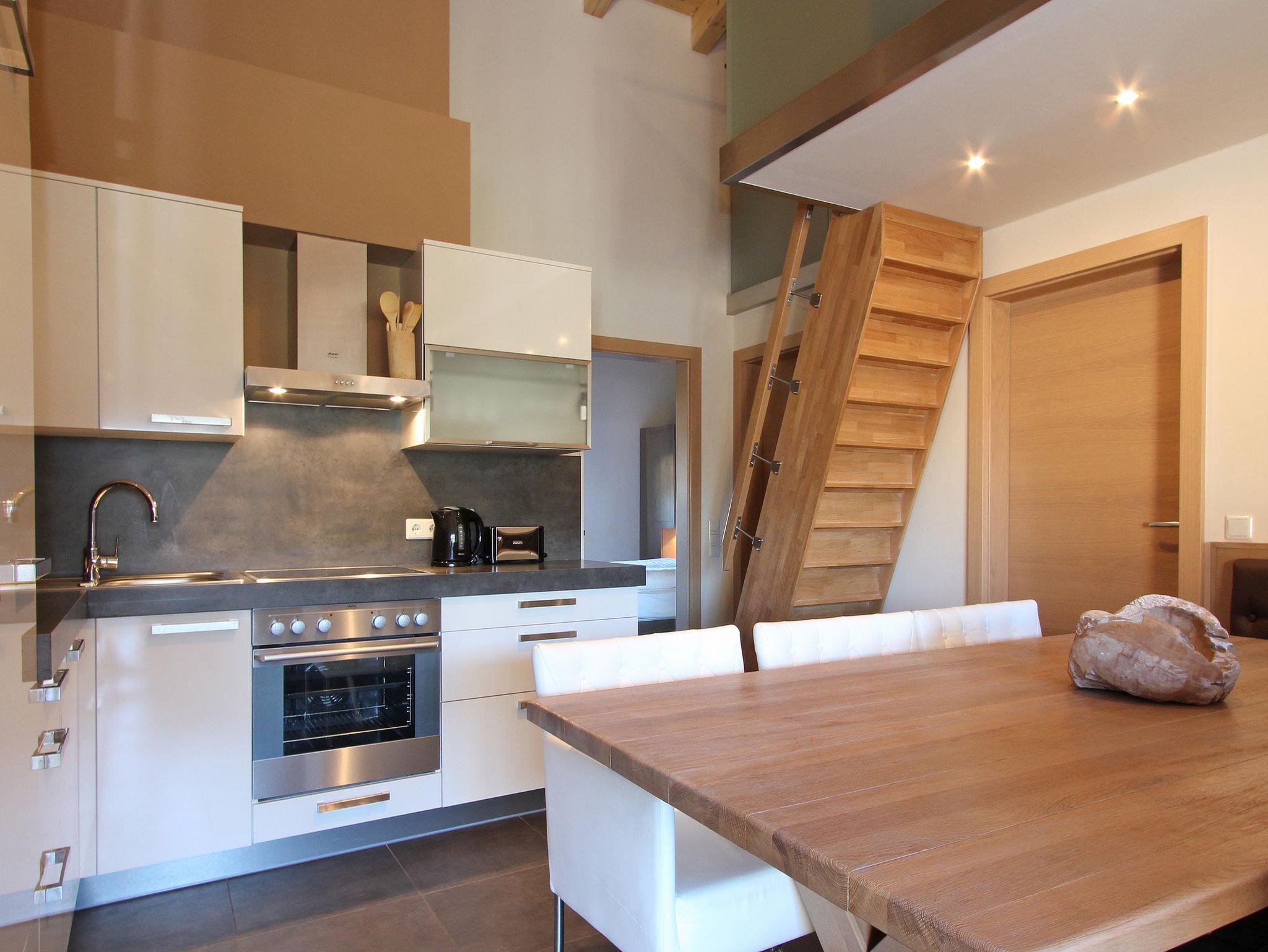 Das stilvolle Penthouse besteht aus zwei großen Schlafzimmern mit jeweils einem eigenen Badezimmer mit Dusche. Über den großen Flur gelangt man auf den “Heuboden”. Dieser Raum bietet nochmals vier zusätzliche Einzelbetten. Auch das dritte Badezimmer lässt sich über den Flur erreichen und verfügt über eine Dusche. Das Wohnzimmer ist großzügig konzipiert mit einem großen Esstisch mit Eckbank und einer offenen Design-Küche. In der Sitzecke, kann man es sich am offenen Kamin gemütlich machen. Den großen Balkon erreicht man über das Wohnzimmer.