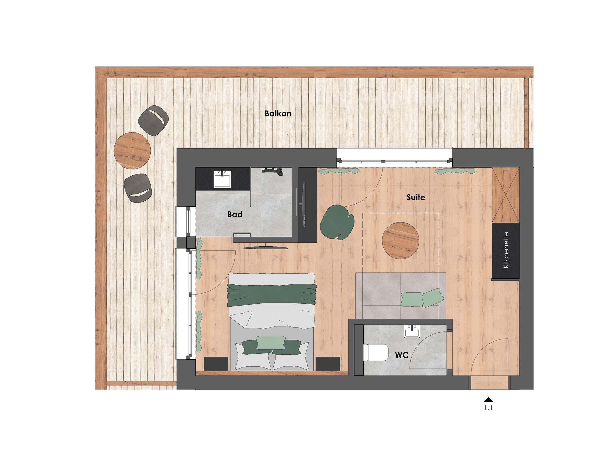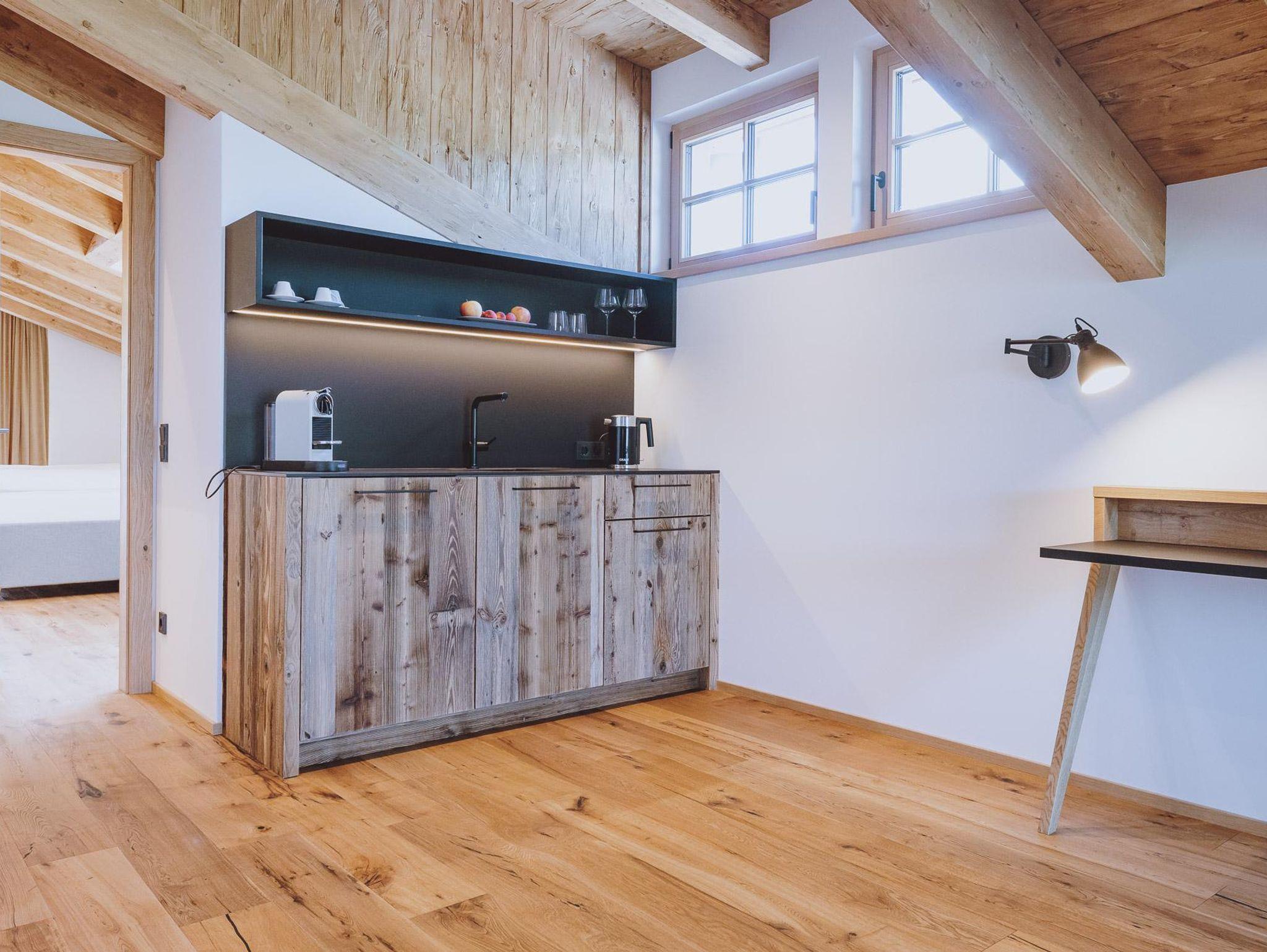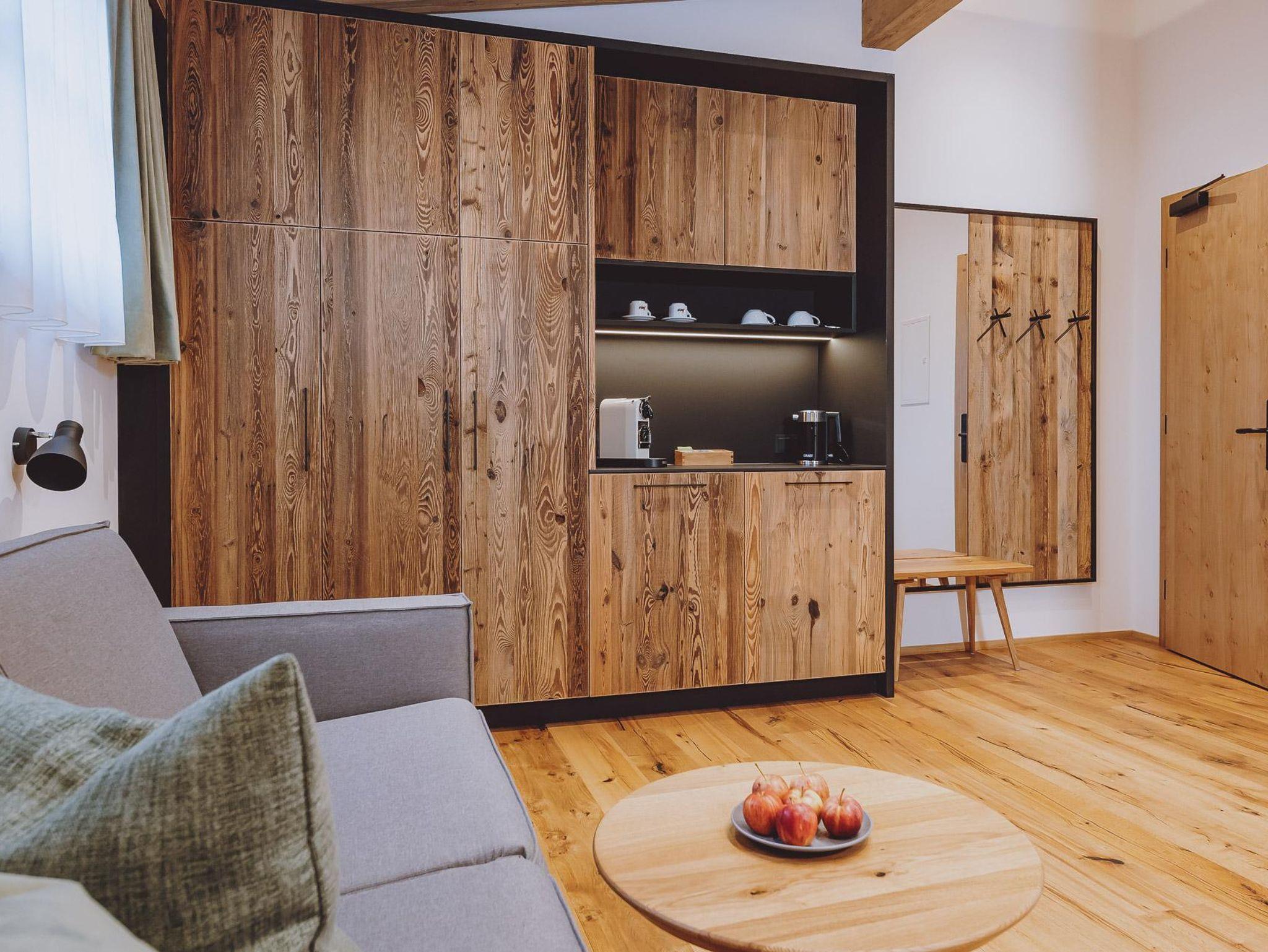 Die eleganten 1-Raum Suiten Berg befinden sich im Gutshof vom Zaglgut und sind mit edlen Eichenholzmöbel und hochwertigem Polsterbett sowie bequemen (Auszieh-)Sofa Liegefläche 150 x 195 cm) ausgestattet.