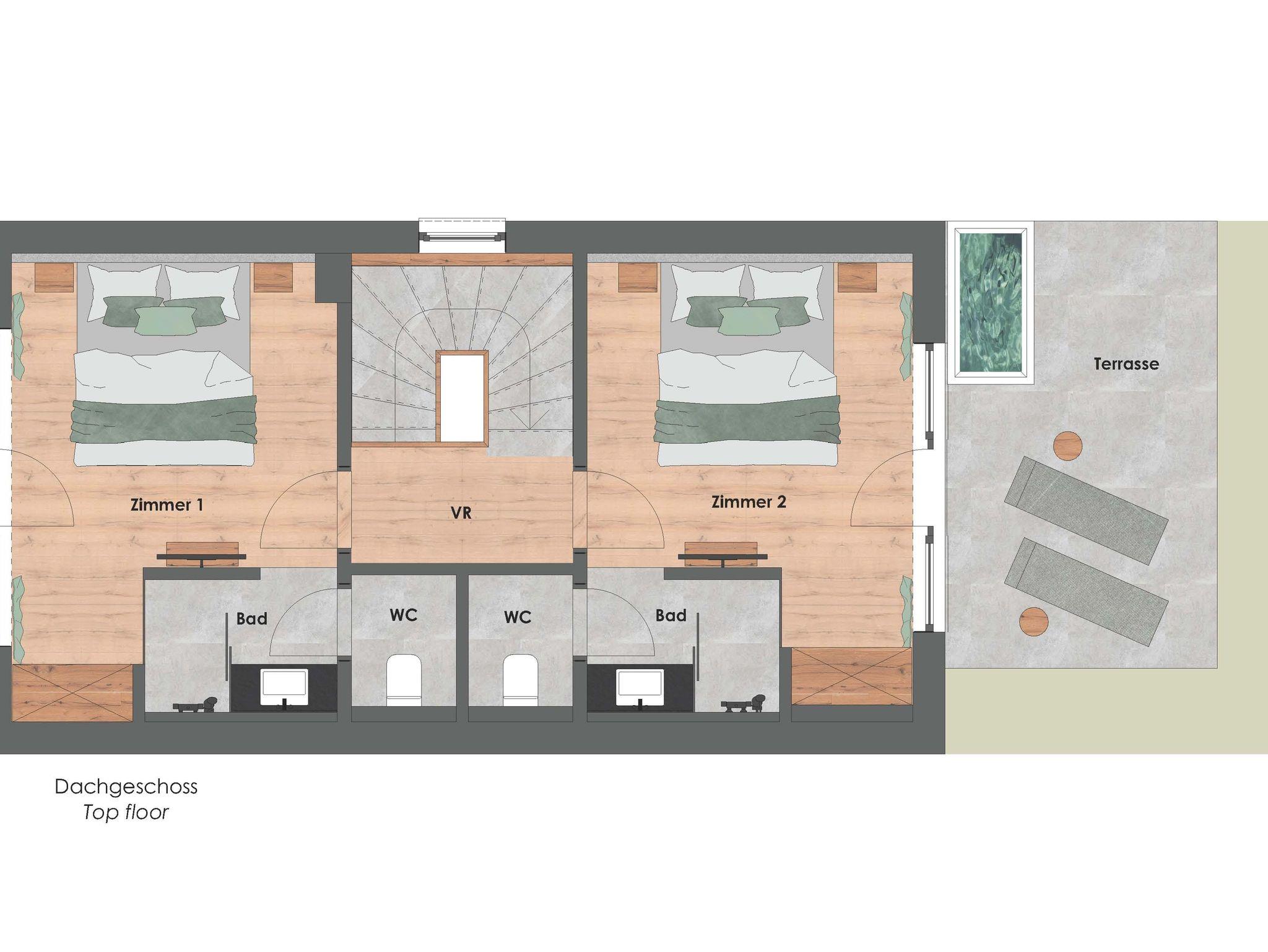 Im OG finden Sie 2 Schlafzimmer, je mit Dusche/WC. eins mit Balkon, das andere mit Terrasse inkl. Außenbadewanne.