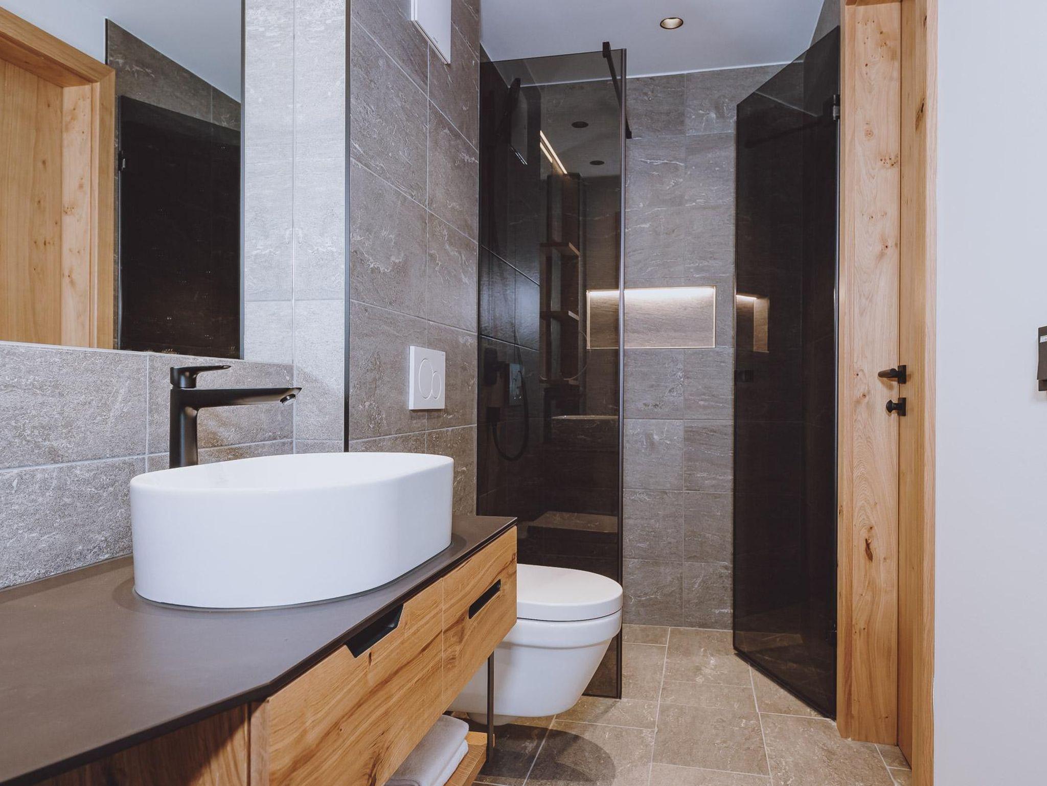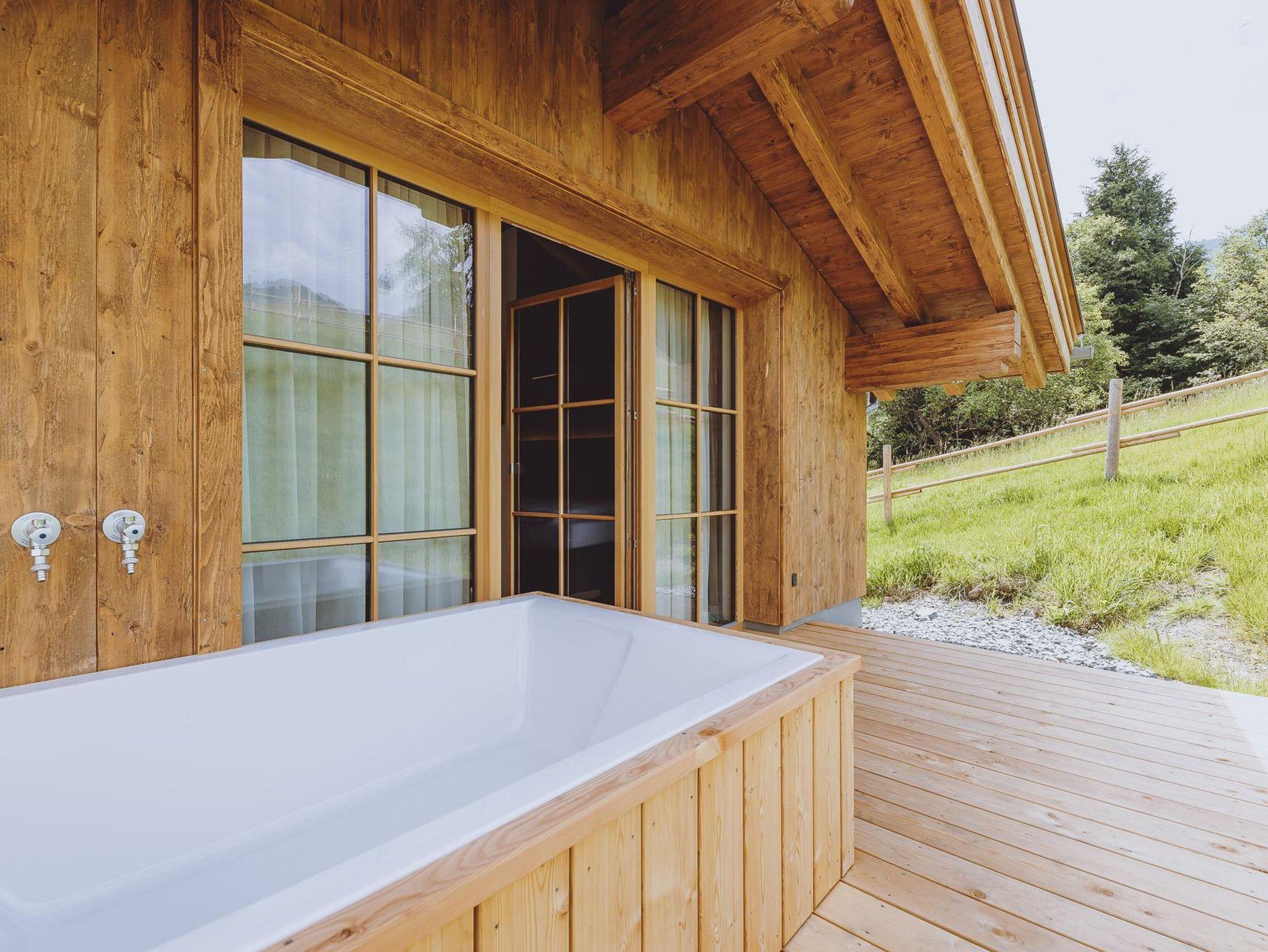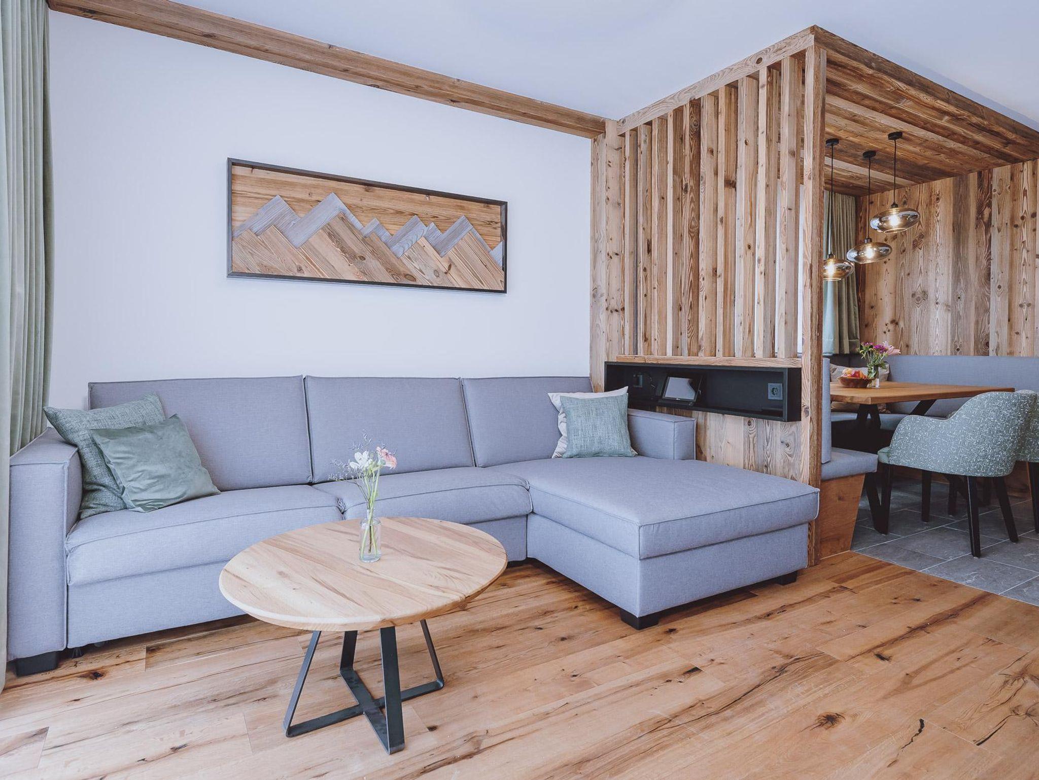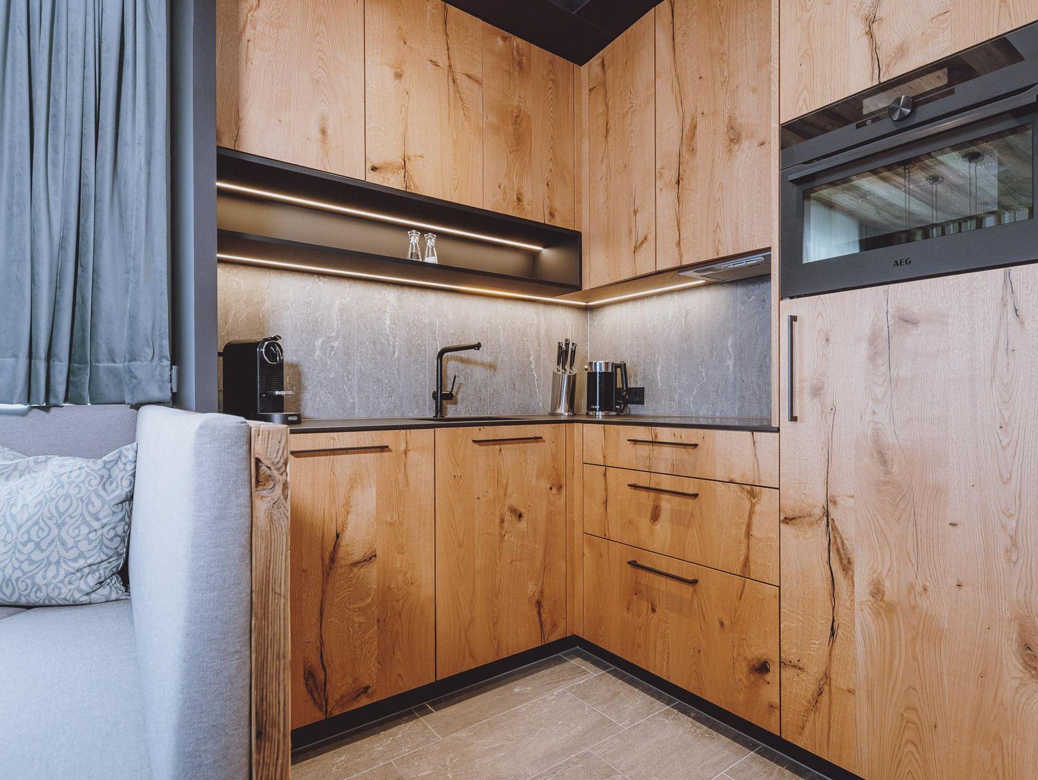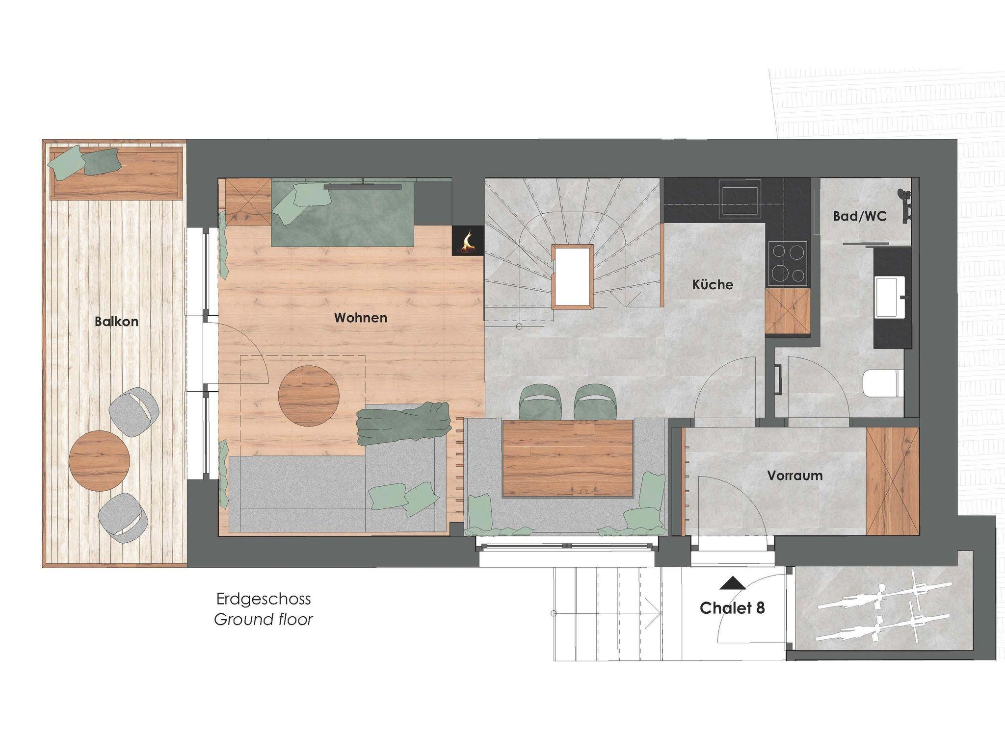 Die dreistöckigen Berg Spa Chalets bietet im Erdgeschoss eine vollausgestattete Küche, vom heimischen Tischler gefertigt mit Backofen samt Mikrowellenfunktion, Geschirrspüler, Induktionsherdplatten und Kühlschrank mit Tiefkühlfach sowie Kaffeemaschine und Wasserkocher. Der große Holz-Esstisch für gemeinsame Mahlzeiten grenz direkt an den Wohnbereich mit gemütlichem Kamin, Sofa ( auch als zusätzlicher Schlafplatz für 2 nutzbar) und einem Diwan (bequeme Liege) sowie ein Badezimmer mit Dusche & WC .