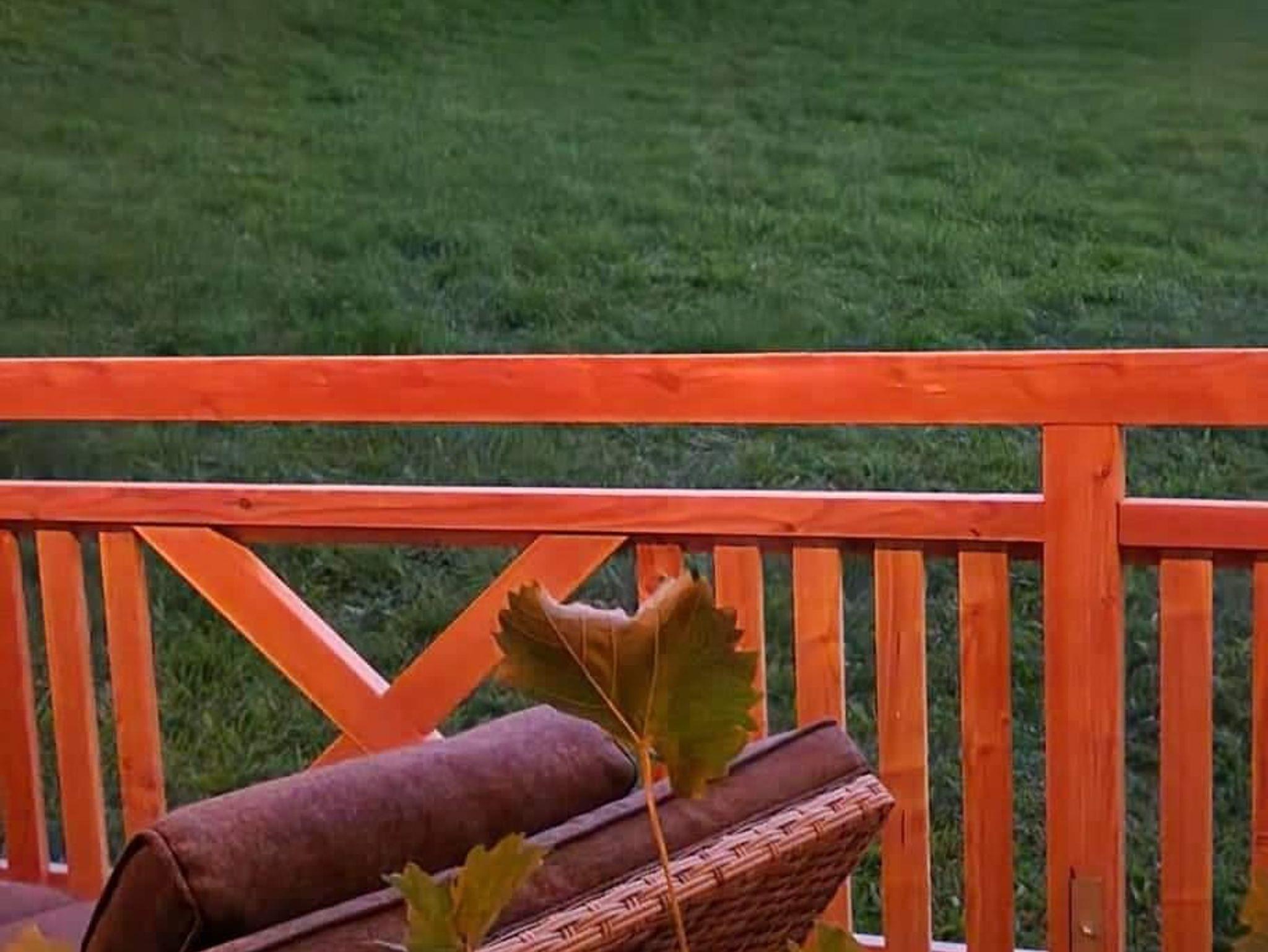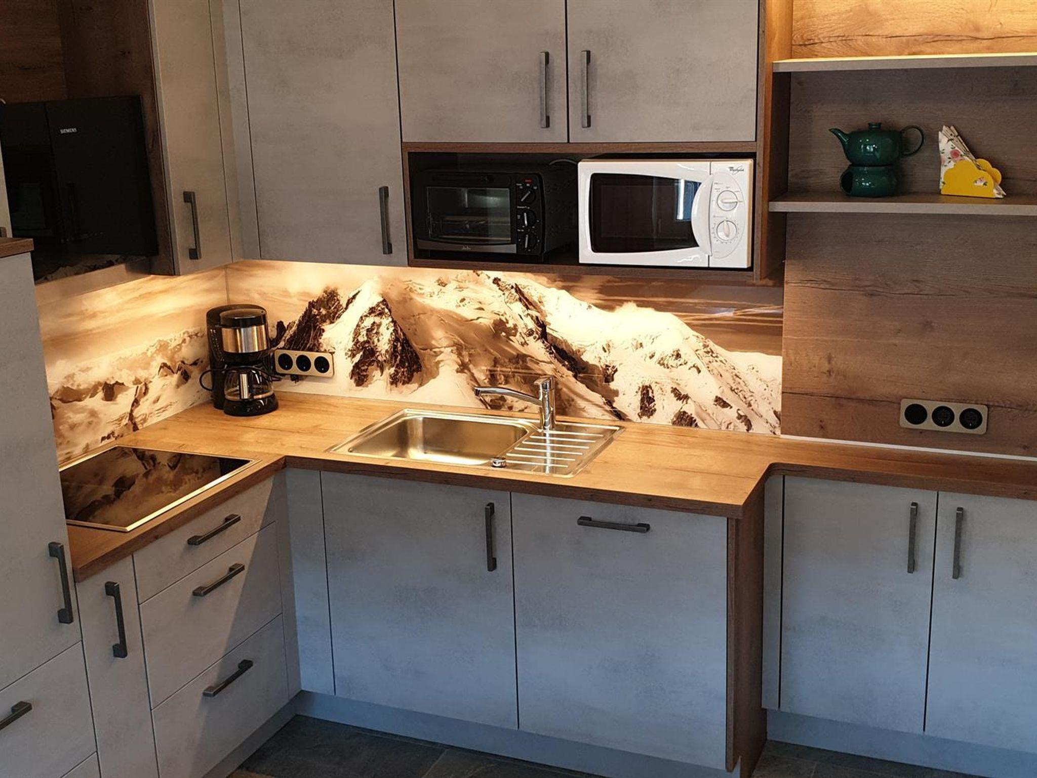 Wohn-Küche mit Eckbank, vollausgestattete Küche mit 4-Platten-Herd, Dunstabzug, Kaffemaschine, Wasserkocher, Spülmaschine, kleinen Backofen und Mikrowelle. Badezimmer mit Dusche /WC, großes Schlafzimmer und Balkon mit Blick auf die umliegenden Berge und Sicht in den Garten.