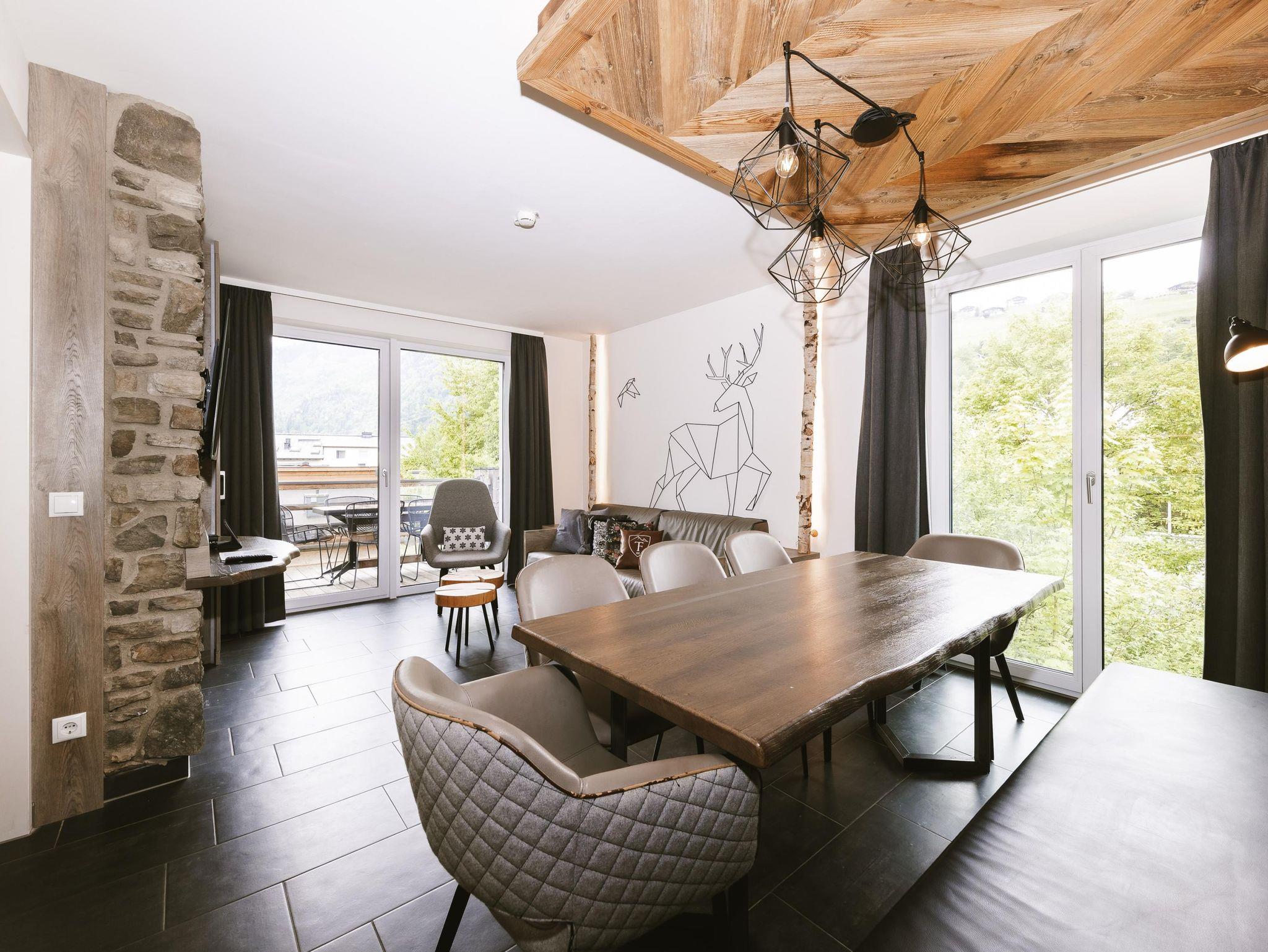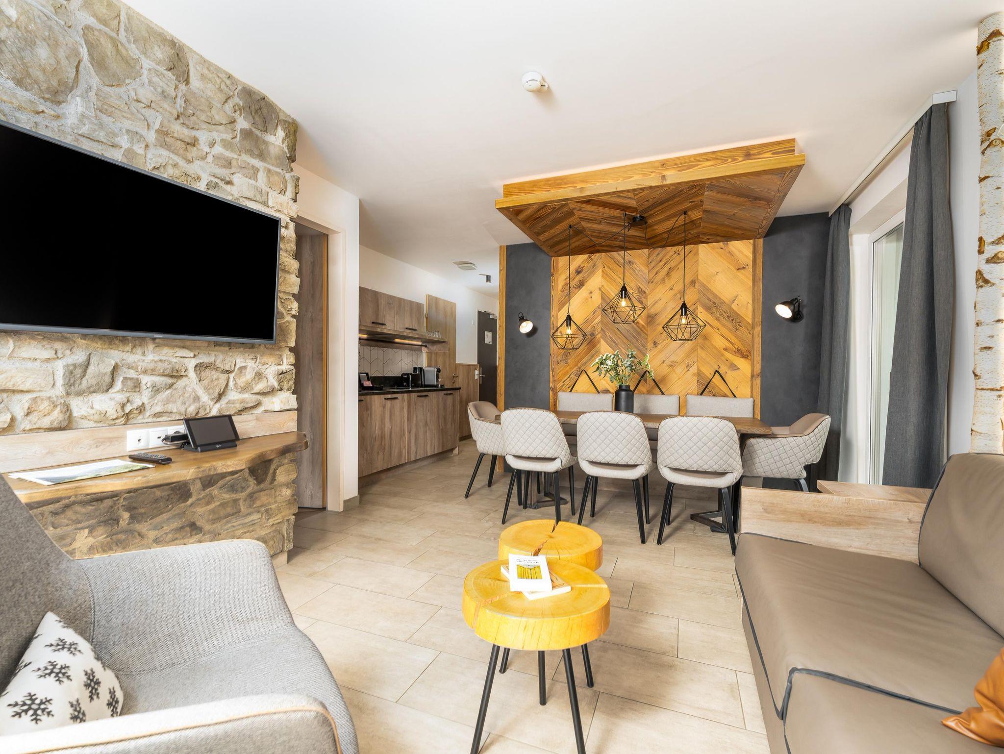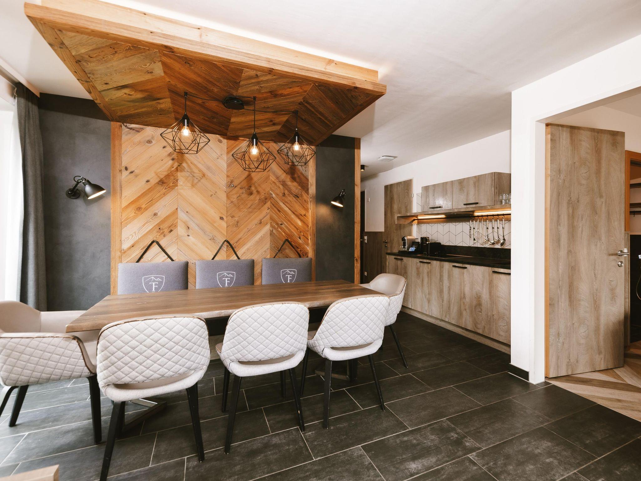 Die Doppelbetten in den beiden Schlafzimmern der Suite, sowie die integrierte Schlafcouch im Wohnbereich bieten Platz für bis zu sechs Personen. Es erwarten Sie zwei Badezimmer mit Dusche und WC und ein offener, hochwertig möblierter Wohnbereich mit einer modernen Küche. Die Holzelemente in der Suite lassen Sie den alpinen Lifestyle spüren. Der gemütliche Esstisch und der private Balkon sind der perfekte Platz, um ein gutes Glas Wein zu genießen und einen spannenden Tag in den Bergen Revue passieren zu lassen.