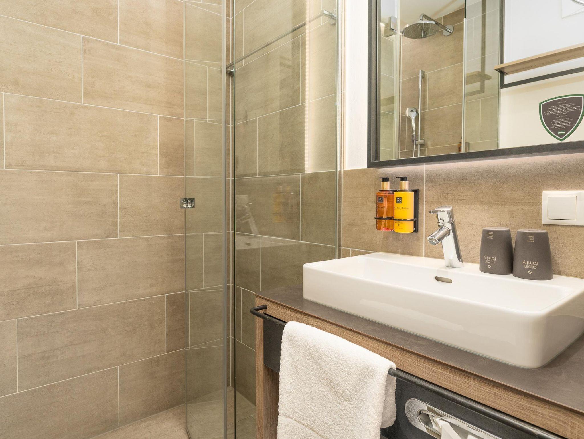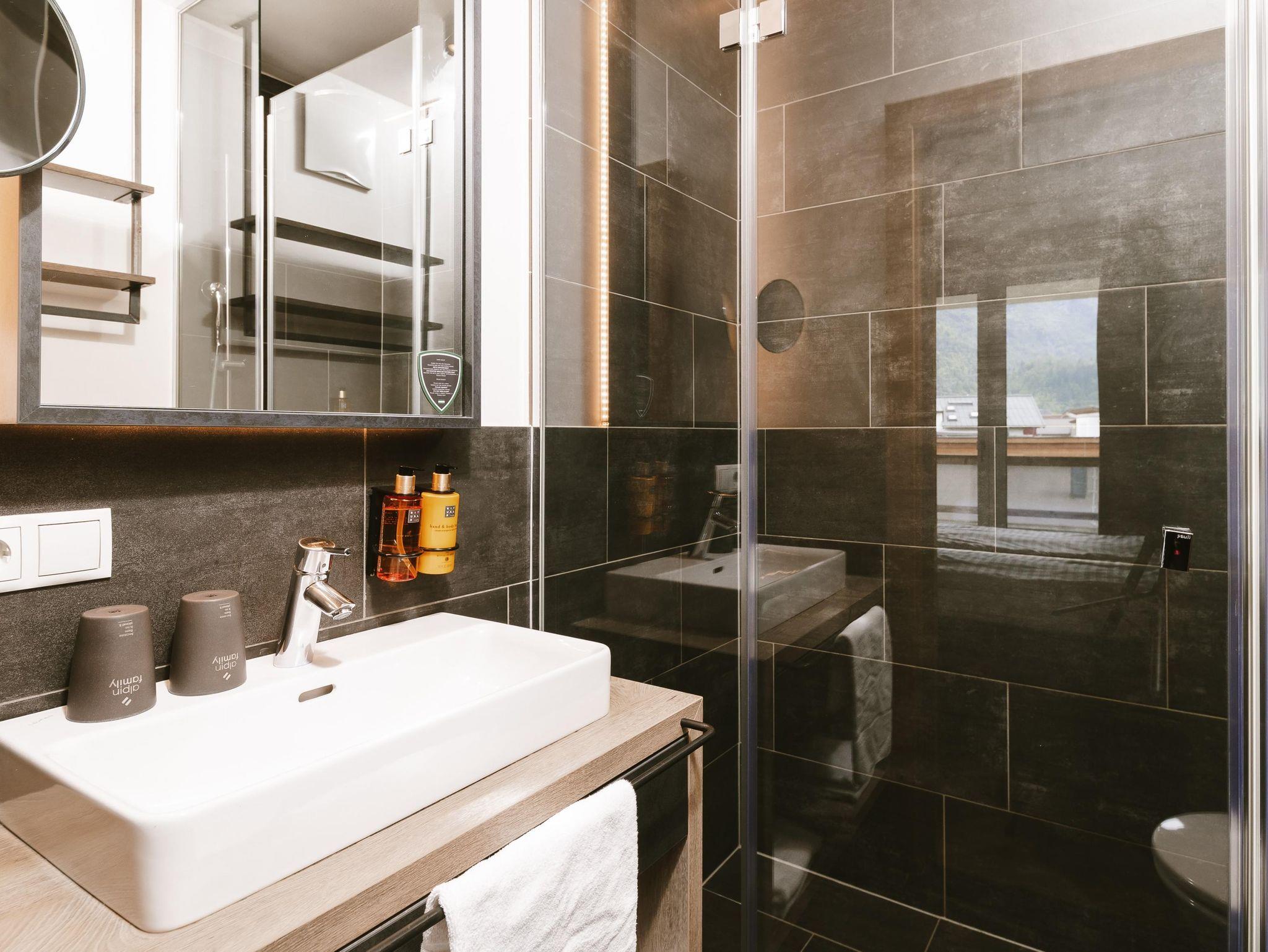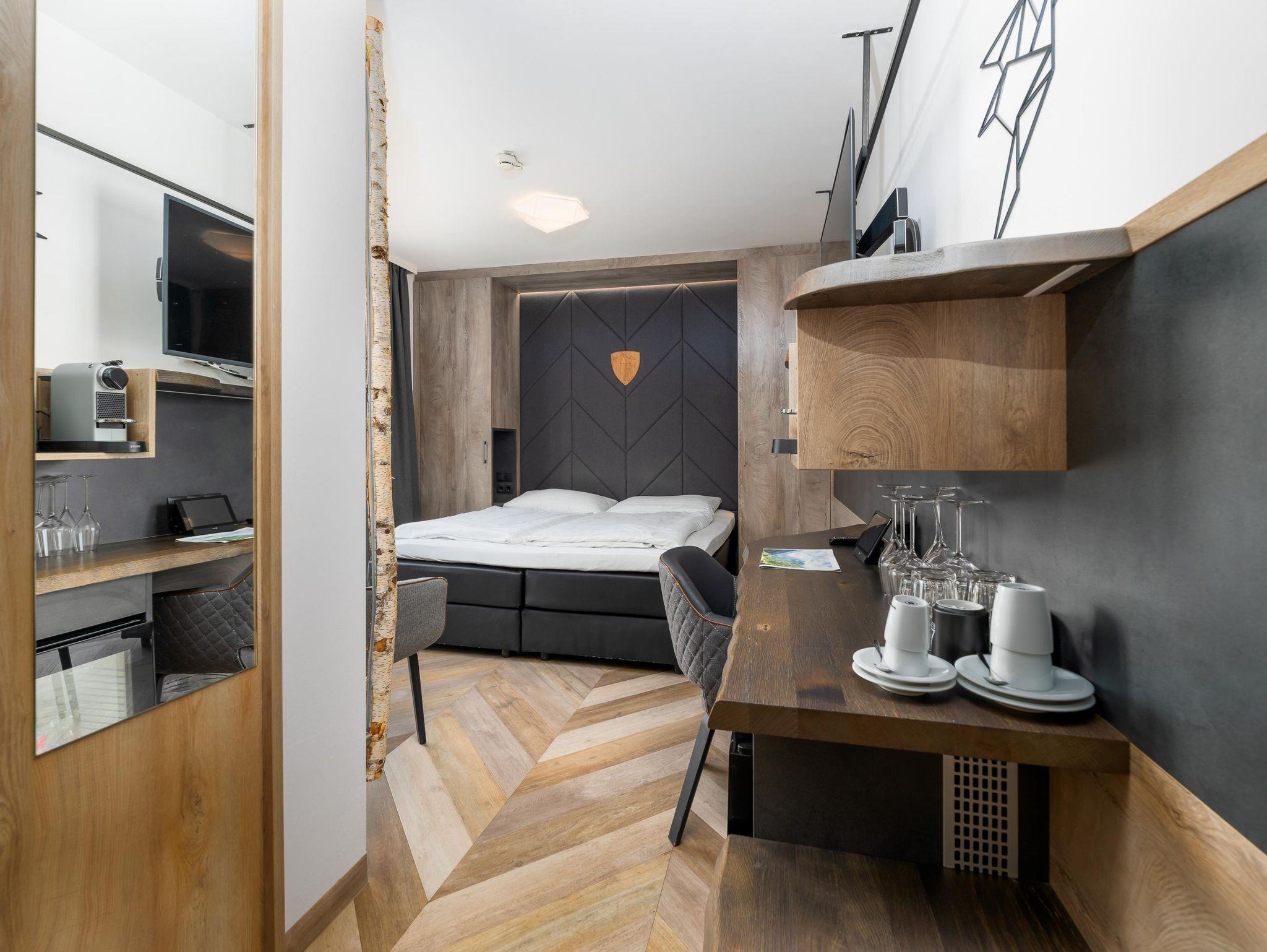 Die Doppelbetten in den beiden Schlafzimmern der Suite, sowie die integrierte Schlafcouch im Wohnbereich bieten Platz für bis zu sechs Personen. Es erwarten Sie zwei Badezimmer mit Dusche und WC und ein offener, hochwertig möblierter Wohnbereich mit einer modernen Küche. Die Holzelemente in der Suite lassen Sie den alpinen Lifestyle spüren. Der gemütliche Esstisch und der private Balkon sind der perfekte Platz, um ein gutes Glas Wein zu genießen und einen spannenden Tag in den Bergen Revue passieren zu lassen.