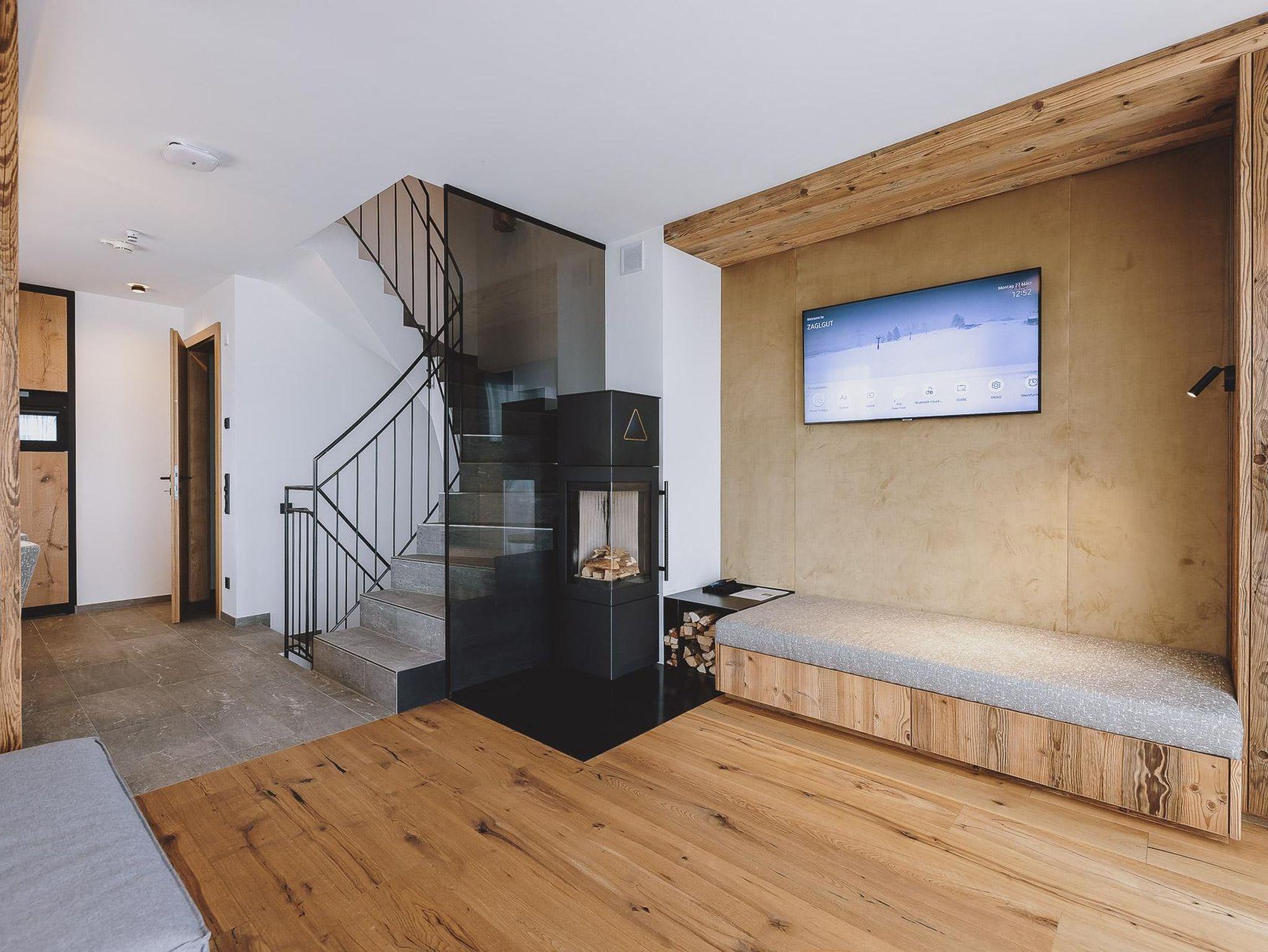 Die dreistöckigen Chalets bieten im Erdgeschoss eine vollausgestattete Küche, vom heimischen Tischler gefertigt mit Backofen samt Mikrowellenfunktion, Geschirrspüler, Induktionsherdplatten und Kühlschrank mit Tiefkühlfach sowie Kaffeemaschine und Wasserkocher. Der große Holz-Esstisch für gemeinsame Mahlzeiten grenz direkt an den Wohnbereich mit gemütlichem Kamin, Sofa ( auch als zusätzlicher Schlafplatz für 2 nutzbar) und einem Diwan (bequeme Liege) sowie ein Badezimmer mit Dusche & WC .