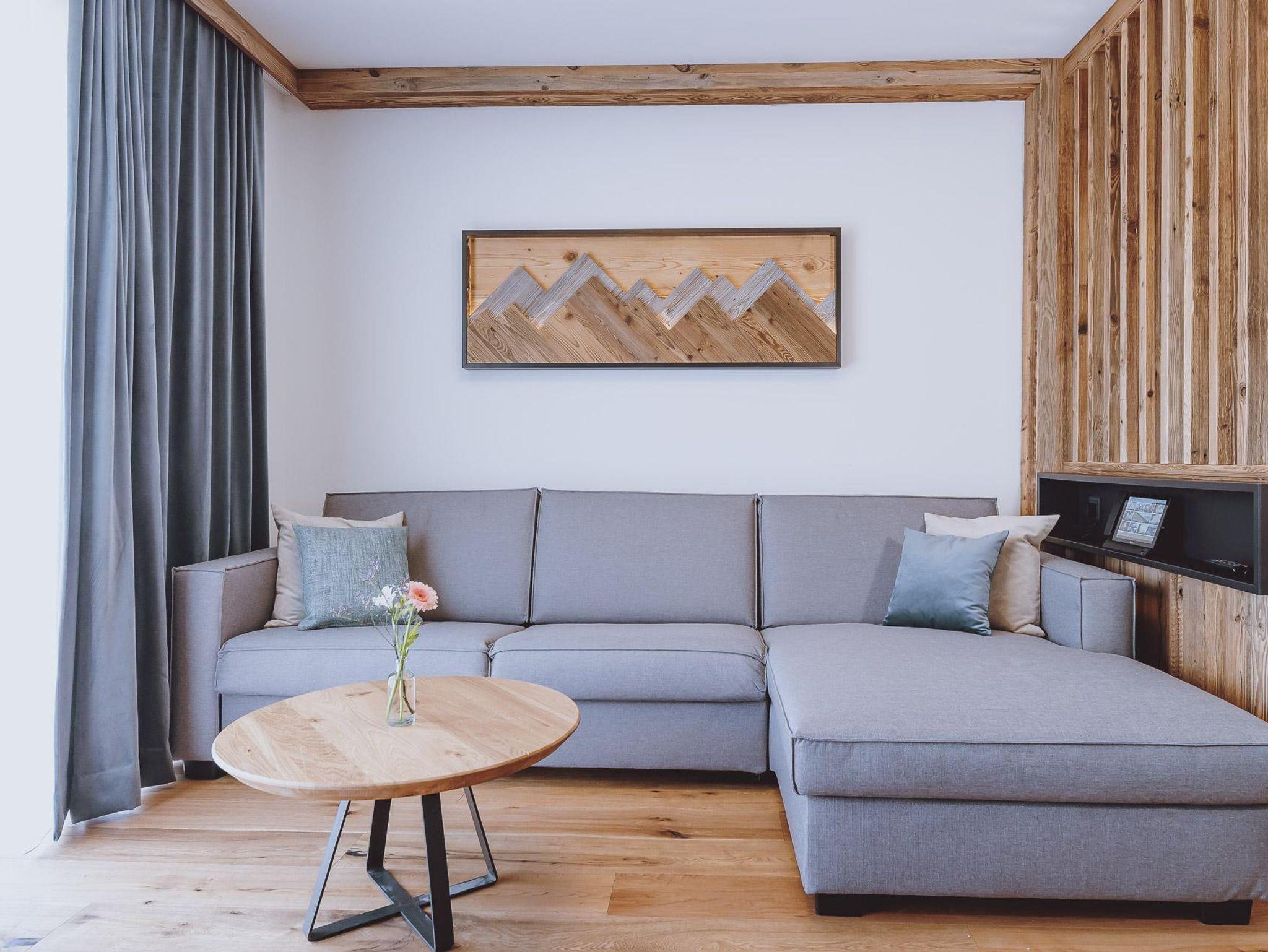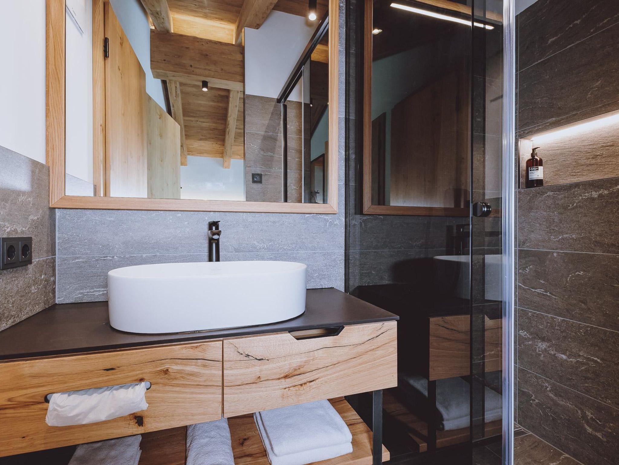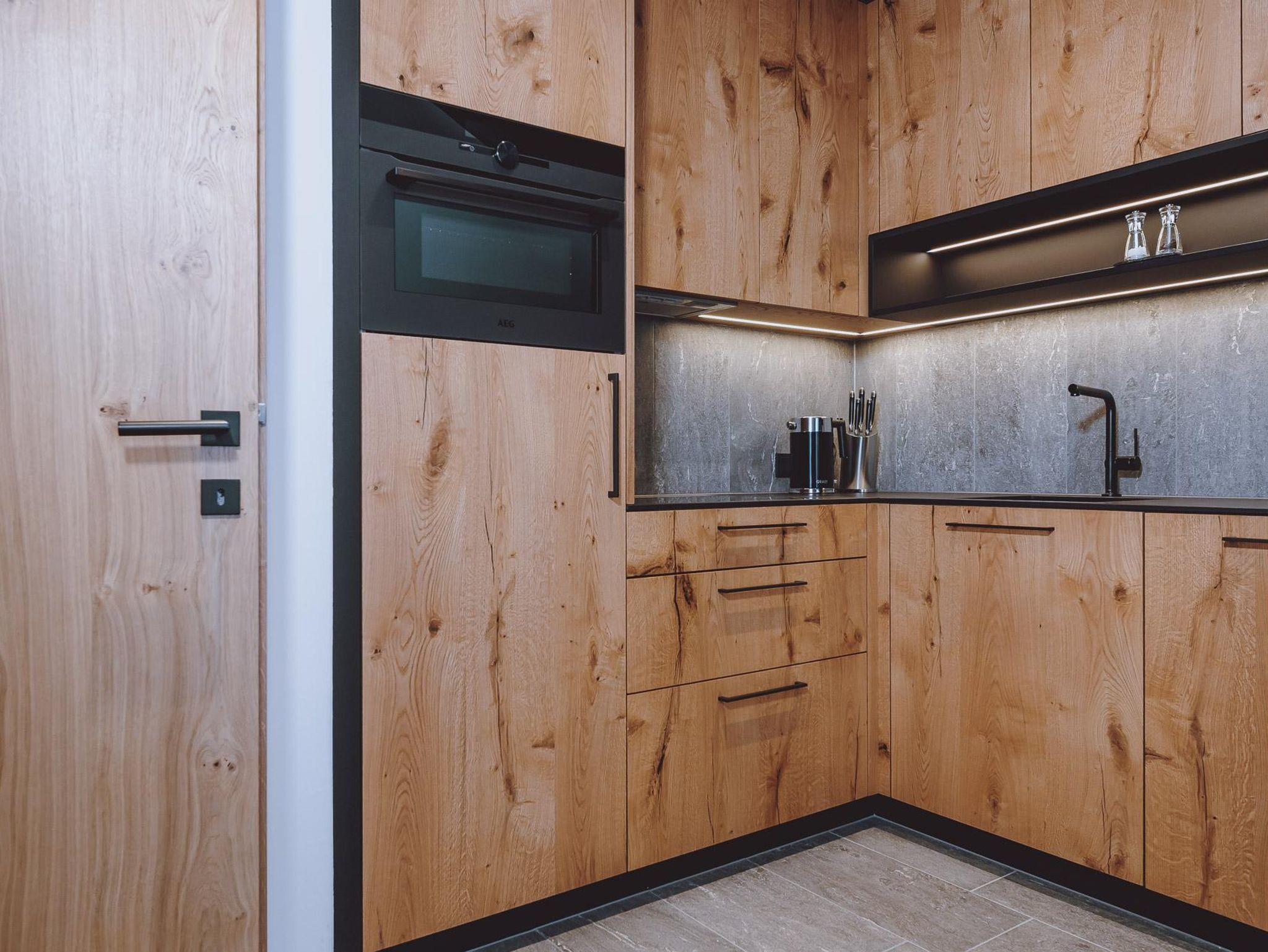 Die dreistöckigen Gletscher Spa Chalets bietet im Erdgeschoss eine vollausgestattete Küche, vom heimischen Tischler gefertigt mit Backofen samt Mikrowellenfunktion, Geschirrspüler, Induktionsherdplatten und Kühlschrank mit Tiefkühlfach sowie Kaffeemaschine und Wasserkocher. Der große Holz-Esstisch für gemeinsame Mahlzeiten grenz direkt an den Wohnbereich mit gemütlichem Kamin, Sofa ( auch als zusätzlicher Schlafplatz für 2 nutzbar) und einem Diwan (bequeme Liege) sowie ein Badezimmer mit Dusche & WC .