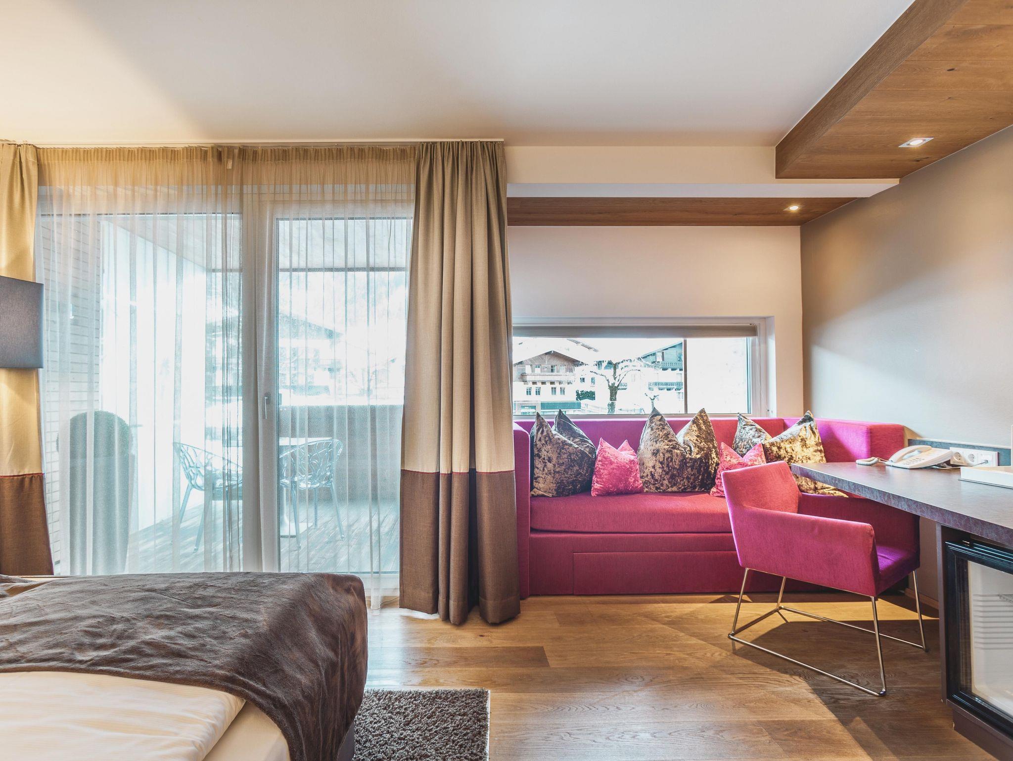 Unser Zimmer PREMIUM DORFPLATZ mit 30 Quadratmetern bietet allen, die gerne mitten im Geschehen sind und sich ins kunterbunte Leben stürzen, einen exklusiven Blick auf den Salzburger Platz, dem zentralen Platz in Kaprun. Und als Draufgabe wartet am Balkon noch die Aussicht auf die majestätische Silhouette des Kitzsteinhorns auf sie. Gemixt mit ganz viel Komfort, wie 32'' LED TV mit Kabelanschluss, kostenloses WLAN, Minibar, Espressomaschine, Safe, Badezimmer mit Regendusche, separates WC und großzügiger Balkon, erwartet sie ein Zimmercocktail der Extraklasse. Die Kuschel-Couch-Ecke kann zu einem Schlafsofa für den Nachwuchs vorbereitet werden.