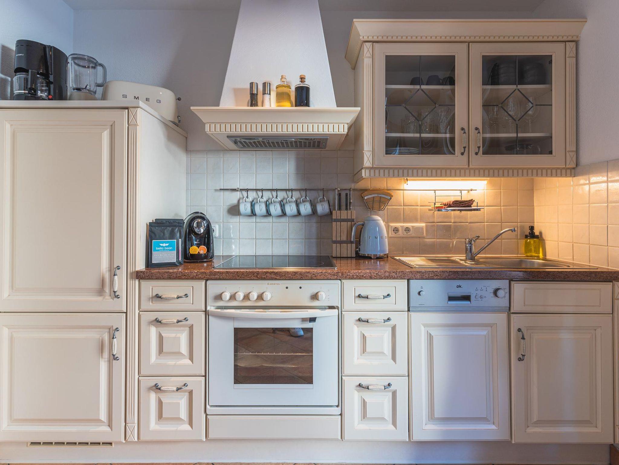 Ihr befindet euch quasi mitten im Blumen- und Kräutergarten von den Dorfchalets. Also zumindestens die Terrasse und der schöne Ausblick unserer Berta. Mit 3 Schlafzimmern mit je einem Doppelbett, 2 Bädern und 2 separaten Toiletten und das auf 2 Etagen ist für genügend Rückzugsort für bis zu 6 Personen gesorgt. Die im Landhausstil erstrahlende Küche bietet einen E-Herd, Kaffeemaschinen, Toaster, Wasserkocher, Geschirrspüler und noch vieles mehr. Neben einem großen Esstisch und einen Dänischen Ofen im Wohnbereich gibt's als Besonderheit für euch auch noch einen Schreibtisch, falls die Arbeit dann doch einmal ruft.