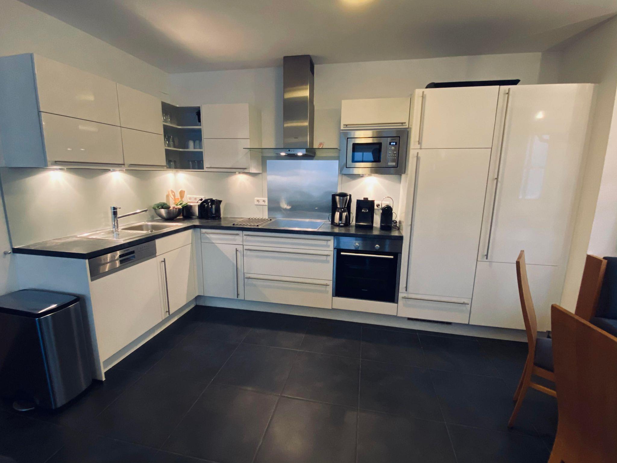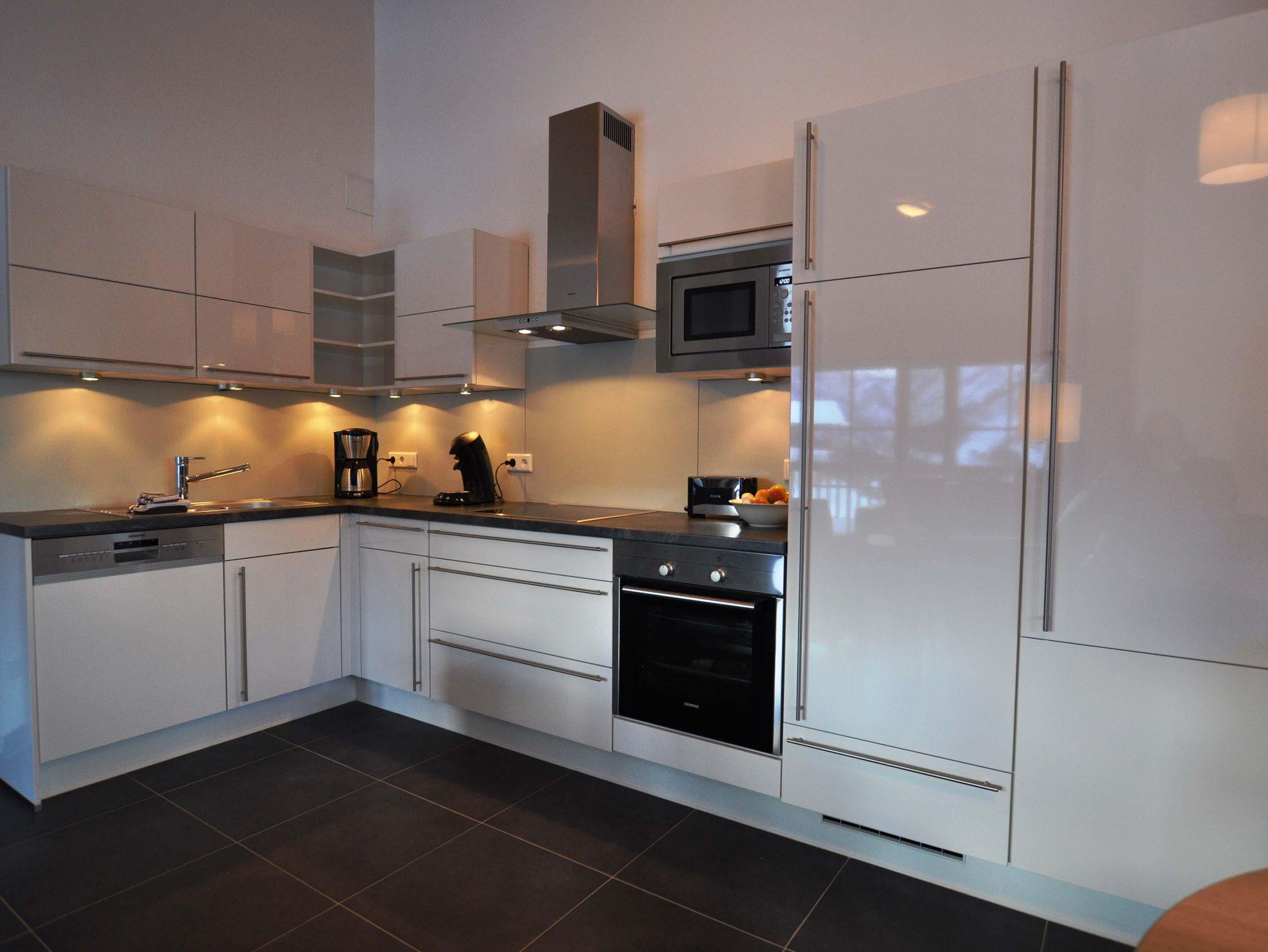 Hochwertige Küche mit Siemens-Geschirrspüler, Backofen, Keramikherd, Mikrowelle, Kühl- und Gefrierschrank sowie Philips-Wasserkocher, Toaster, Senseo, normale Kaffeemaschine und Nespresso