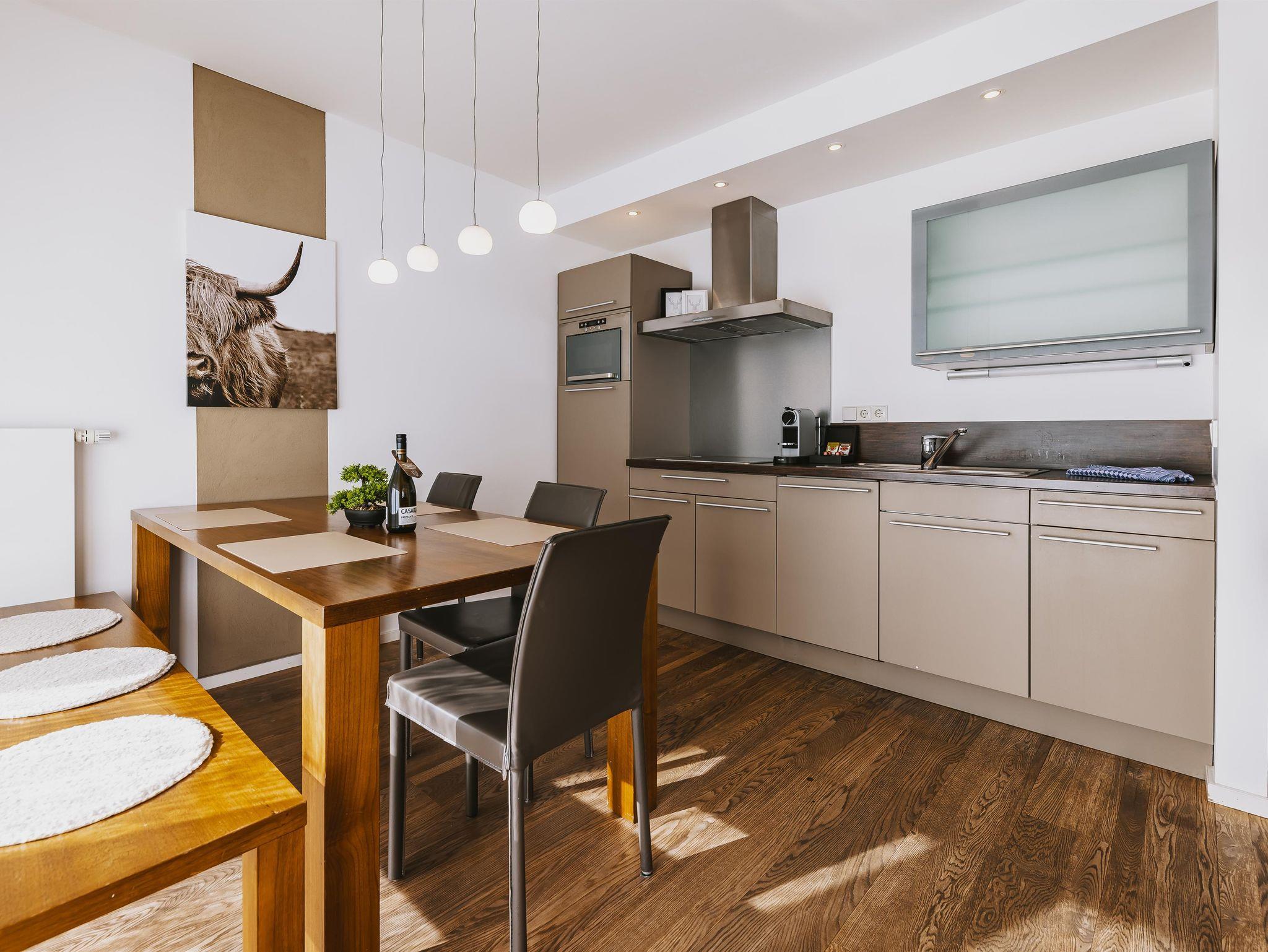 Dieses Apartment im Erdgeschoss bietet Platz für bis zu vier Personen. Es besteht aus zwei Schlafzimmern, einem mit Doppelbett und einem mit zwei Einzelbetten. Das geräumige Bad ist mit einer Dusche, einer Toilette und einem Handtuchwärmer ausgestattet. Ein großzügiger, heller Wohnbereich mit einer gemütlichen Sitzecke bietet reichlich Platz zum Entspannen. Die voll ausgestattete Küche und der große Esstisch ergänzen das Angebot. Auf der Terrasse bietet sich ein schöner Blick auf die Berge.