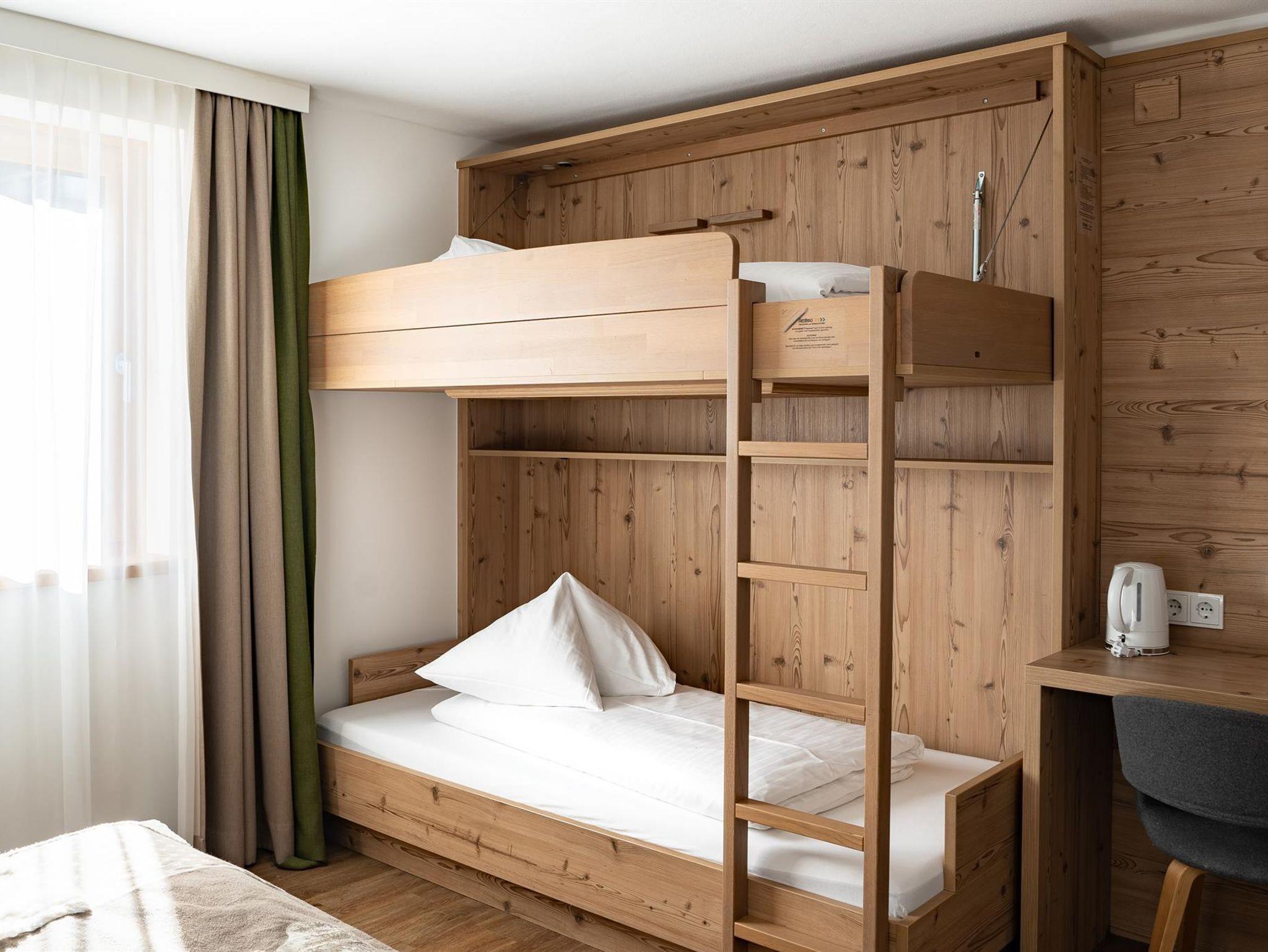 Das geschmackvoll ausgestattet und moderne Economy Zimmer hat eine Kapazität für 4 Personen und verfügt über 24 m² sowie Dusche. Diese Zimmerkategorie befindet sich im Souterrain, verfügt über direkten Zugang zum Garten und liegt in der Nähe der VIP-Sauna und Skiaufbewahrung. Es ist groß und ruhig, jedoch ohne Aussicht.