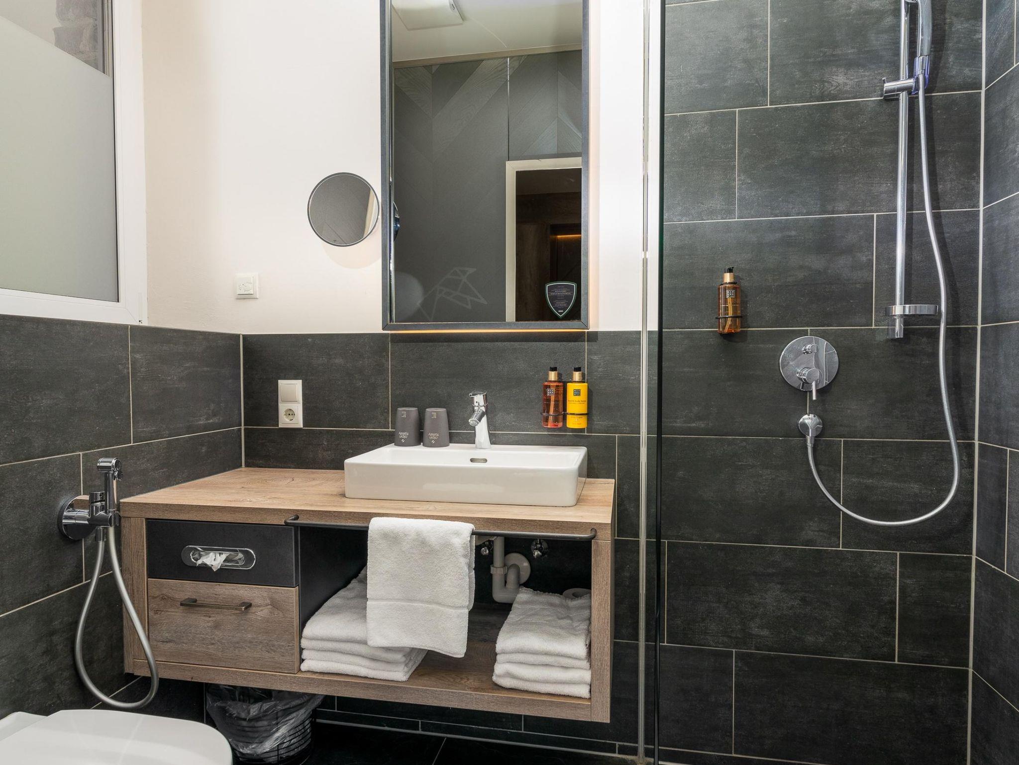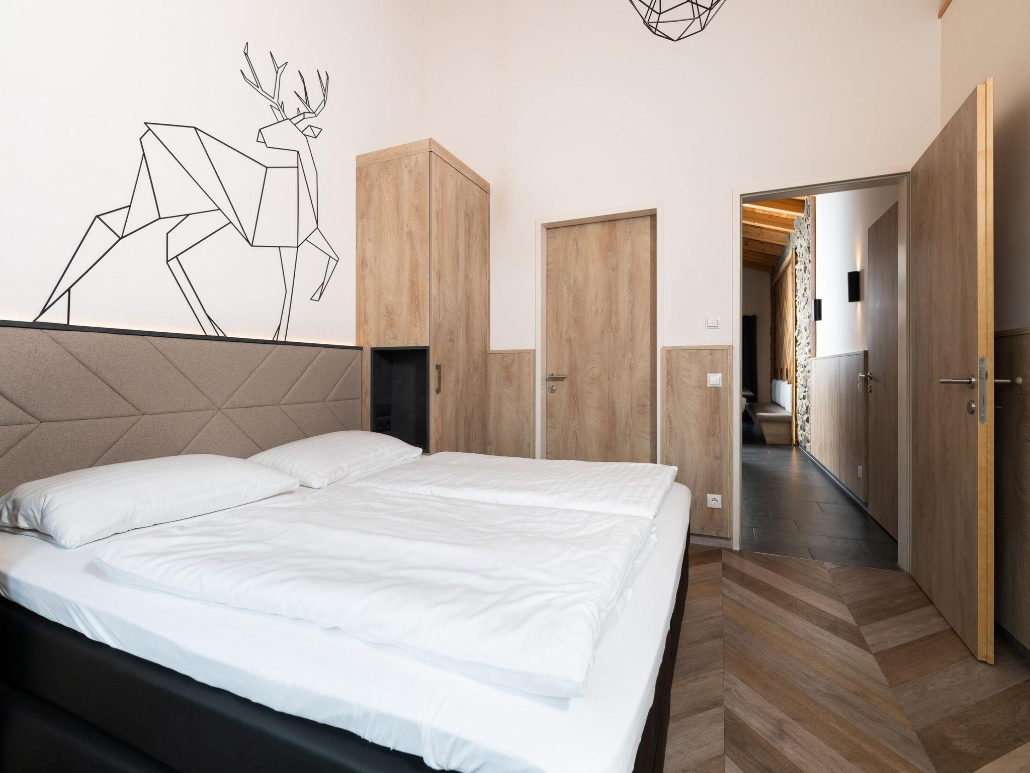 Unsere modern ausgestattete Suite besteht aus drei gemütlichen Schlafzimmern und drei Badezimmern mit Dusche und WC. Sie bietet genügend Platz für bis zu acht Personen. Der großzügige Wohnbereich verfügt über eine voll ausgestattete Küche, einen großen Esstisch und eine Schlafcouch. Die in der ganzen Suite verbauten Holzdetails lassen Sie den alpinen Lebensstil verspüren. Vom Wohnzimmer aus gelangen Sie direkt auf die private Terrasse, auf der Sie entspannen können.