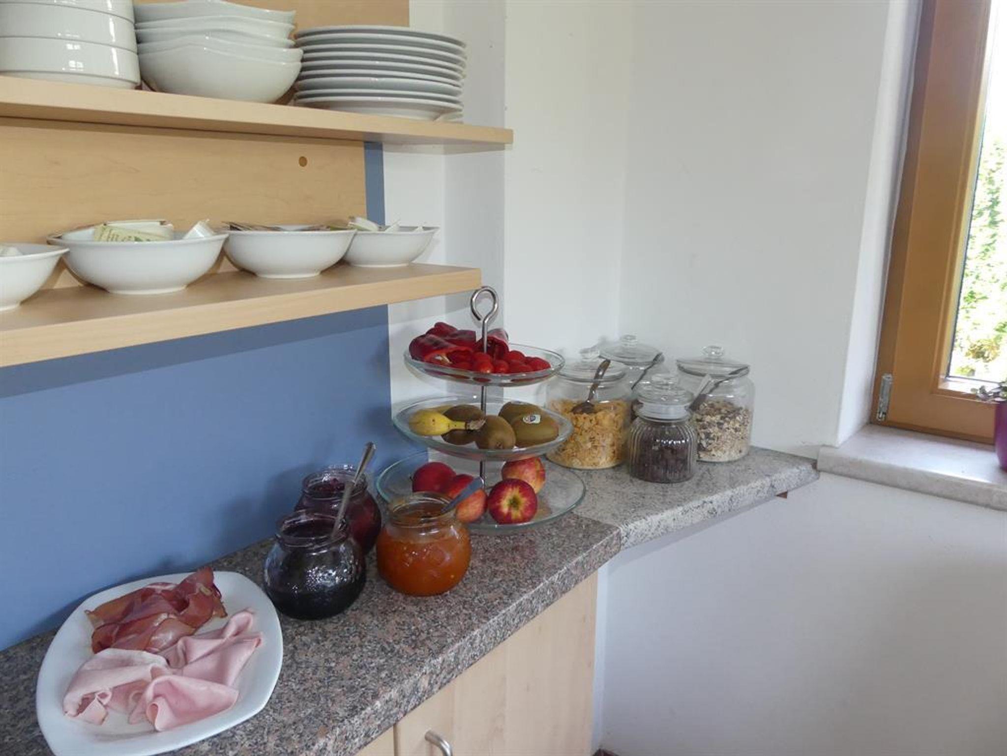 Reichhaltiges Frühstücksbuffet mit hausgemachten Marmeladen und Schinken.