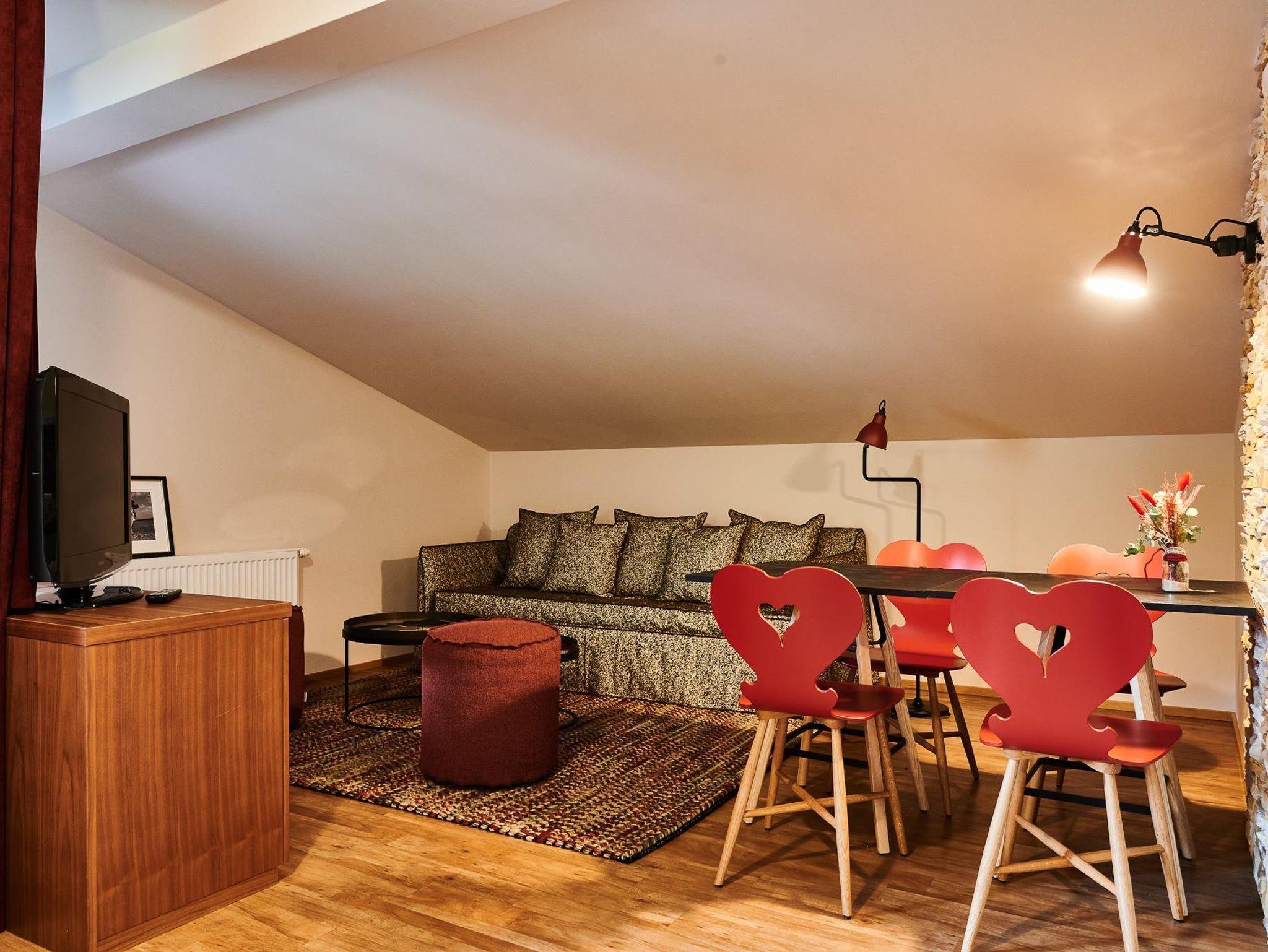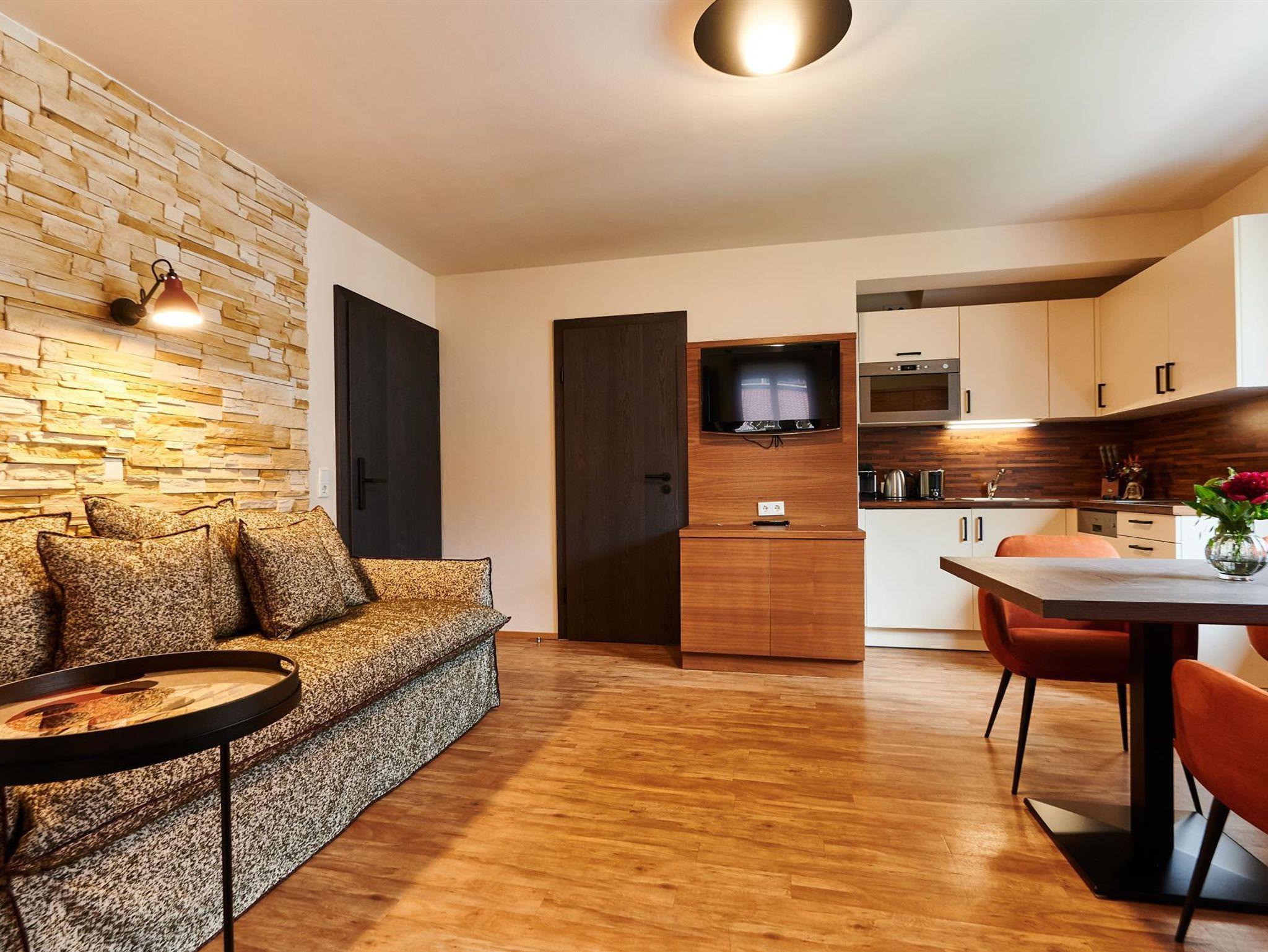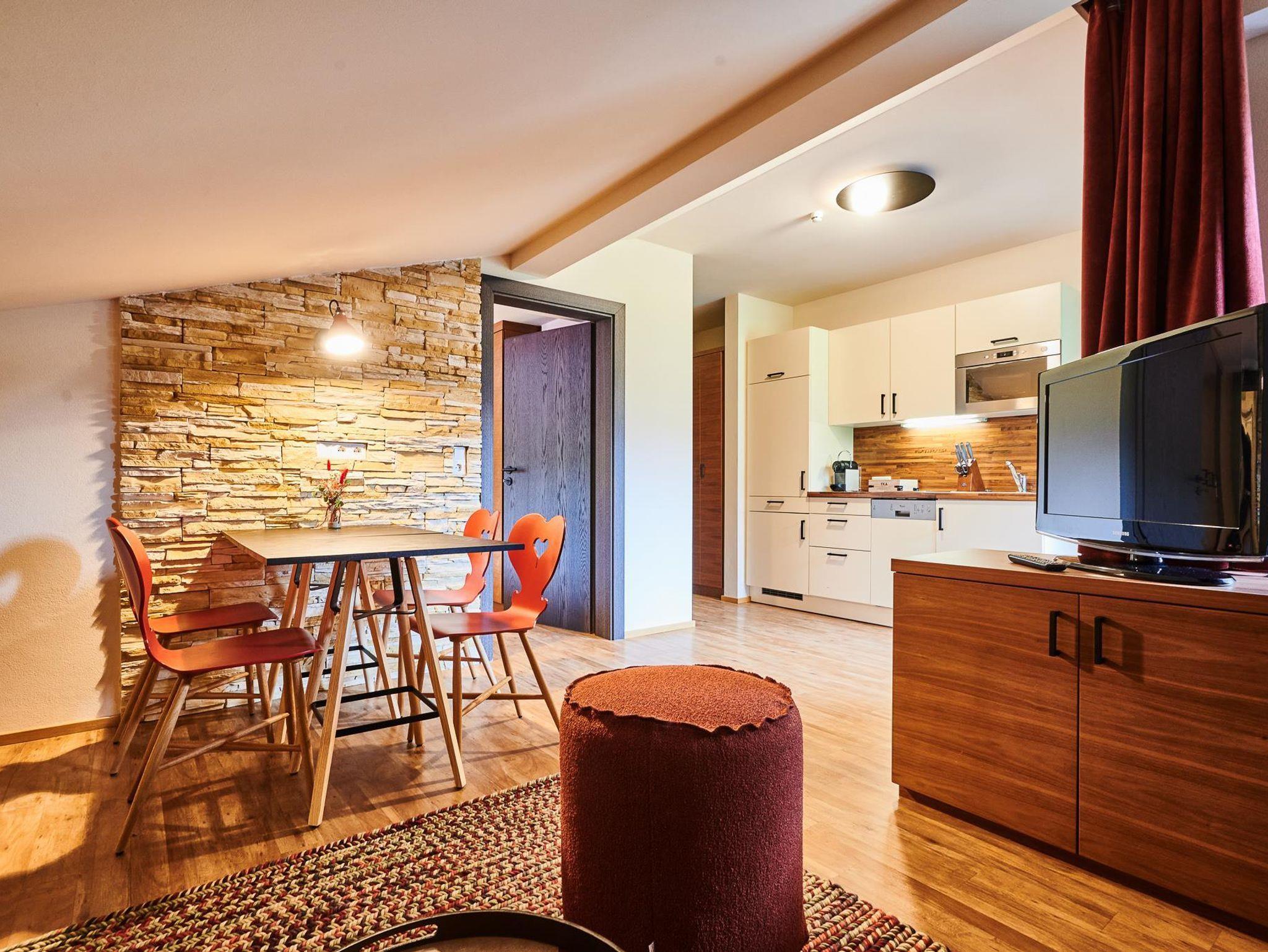 Die exzellent ausgestattete Küche befindet sich im Wohnzimmer: Besteck, Geschirr, Mikrowelle sowie eine Kühl- Gefrierkombination. Über den Geschirrspüle freuen sich alle, die so wie wir im Urlaub nicht gerne abwaschen. Selbstverständlich haben wir eine Kaffeemaschine, Wasserkocher und Toaster im Apartment, um für den perfekten Start in einen erlebnisreichen Tag zu garantieren. Am Abend verwöhnt ihr eure Liebsten mit allem was ihr an Küchenzubehör für eure leckersten Speisen benötigt. All jene, die den Abend gerne im Freien verbringen, finden einen kleinen Grillplatz im Garten.