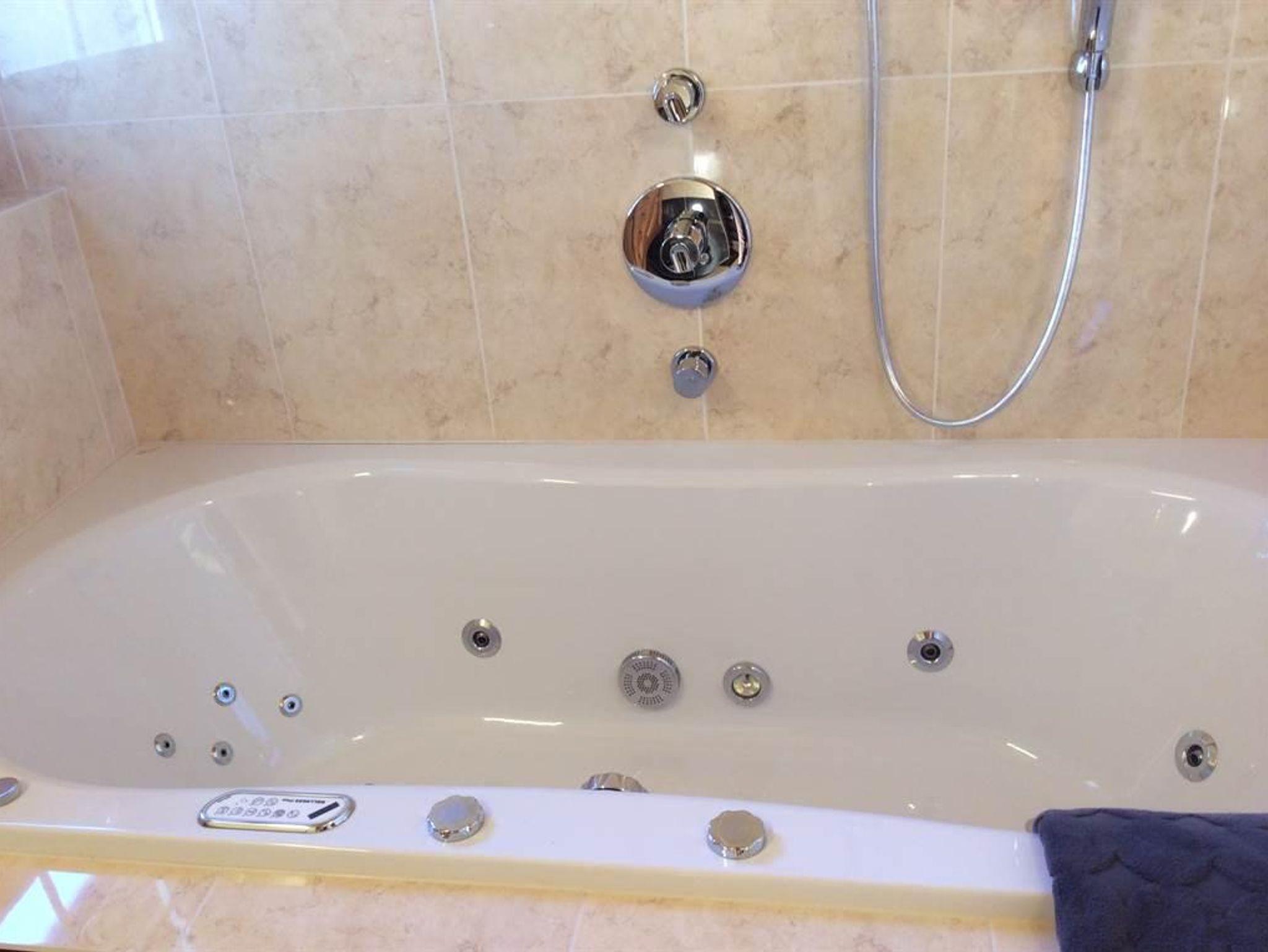 • 1 Badezimmer mit Doppelwaschbecken, Whirlpool, Regenwalddusche, Haarfön