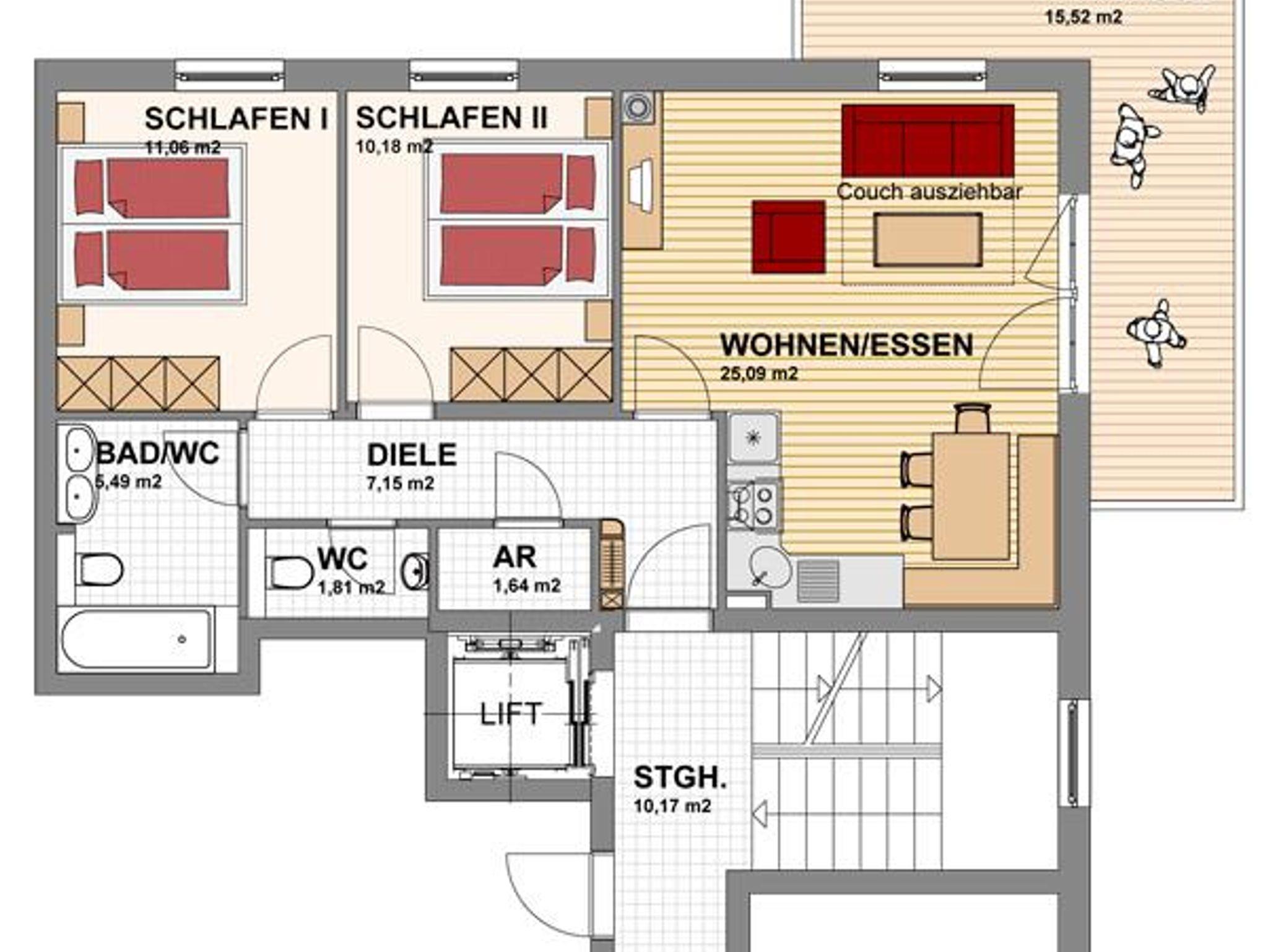 Geschmackvoll eingerichtetes Appartement für 4-6 Personen im 1.Stock mit Lift, Größe 72m², 2 getrennten Schlafzimmern, sehr großer Wohnraum mit voll ausgestatteter Küche, Esstisch für bis zu 6 Personen, Doppelauszieh-Sofa, TV, WLAN, 1 Badezimmer mit Badewanne(Dusche),Waschtisch & WC, und einem zusätzslichen getrenntem WC, sonniger großer Balkon!