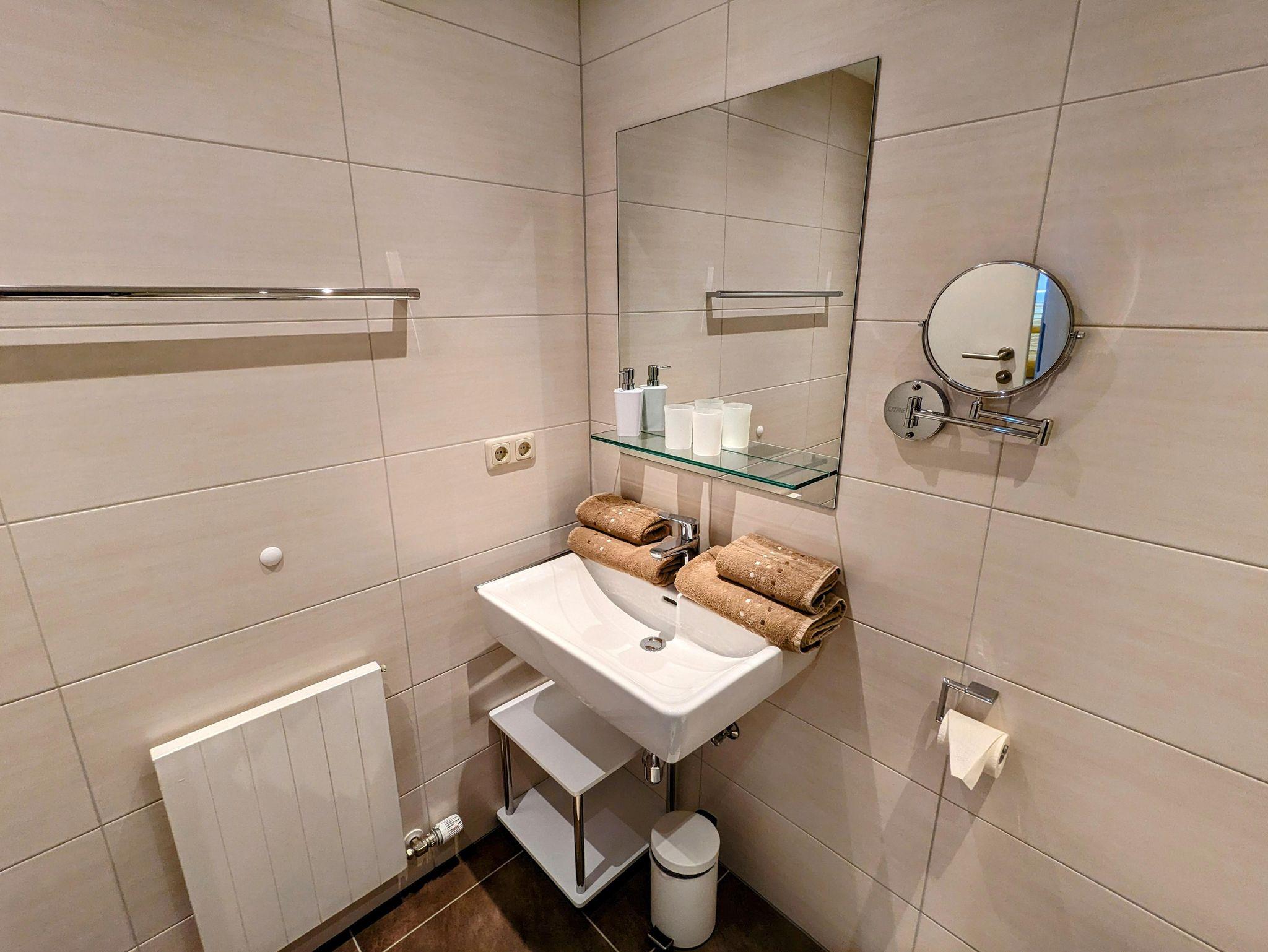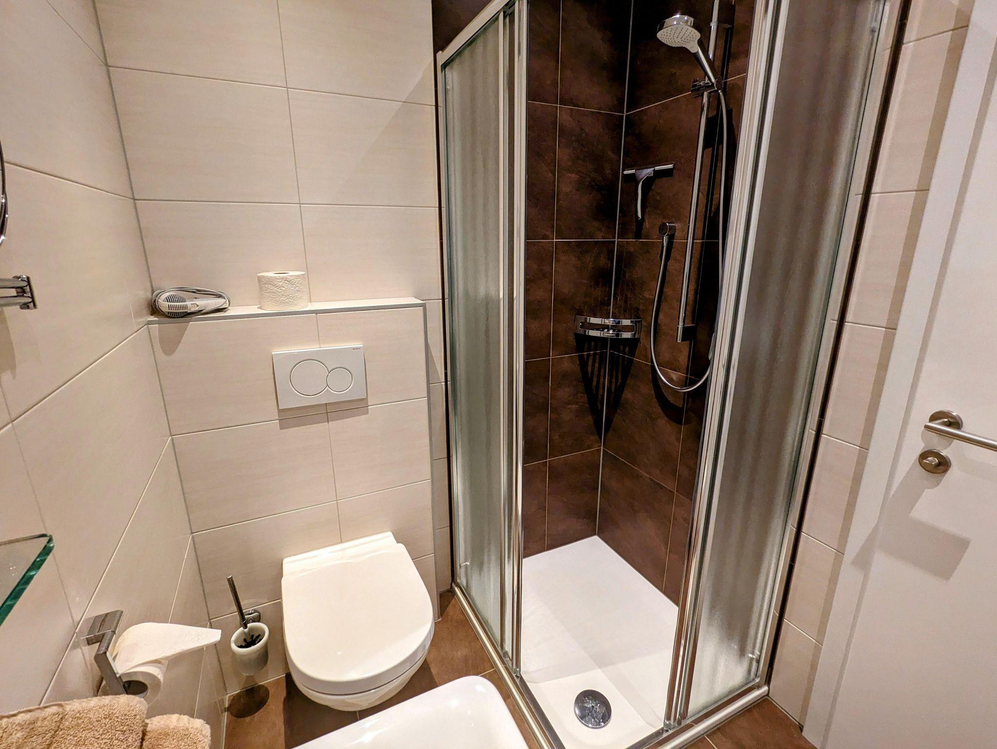 Apartment für 2-5 Personen – 55 qm, zwei separate Schlafzimmer jeweils mit DU/WC (Kosmetikspiegel und Föhn), beide Schlafzimmer mit Flatscreen TV, gemütlicher Wohnraum mit komfortabler Sitzecke (ausziehbar zu einem Doppelbett) und Flatscreen TV, gratis WI-FI, gemütliche Essecke, komplett ausgestattete Küche mit Geschirr, Kühlschrank, (Geschirrspüler und Backofen ab 17.6.17), 4-Platten-Induktionsherd, Kaffeemaschine, Wasserkocher, Toaster, Mikrowellenherd, Vorraum, privater Balkon mit wunderschönem Panoramablick.