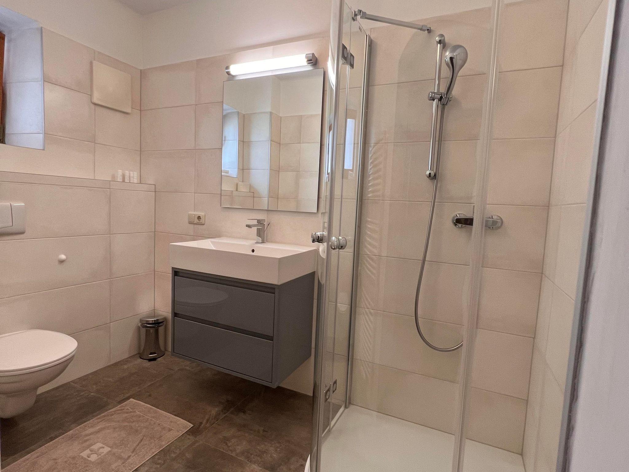 • 1 Badezimmer mit Dusche, WC, Handtuchtrockner und Haarföhn