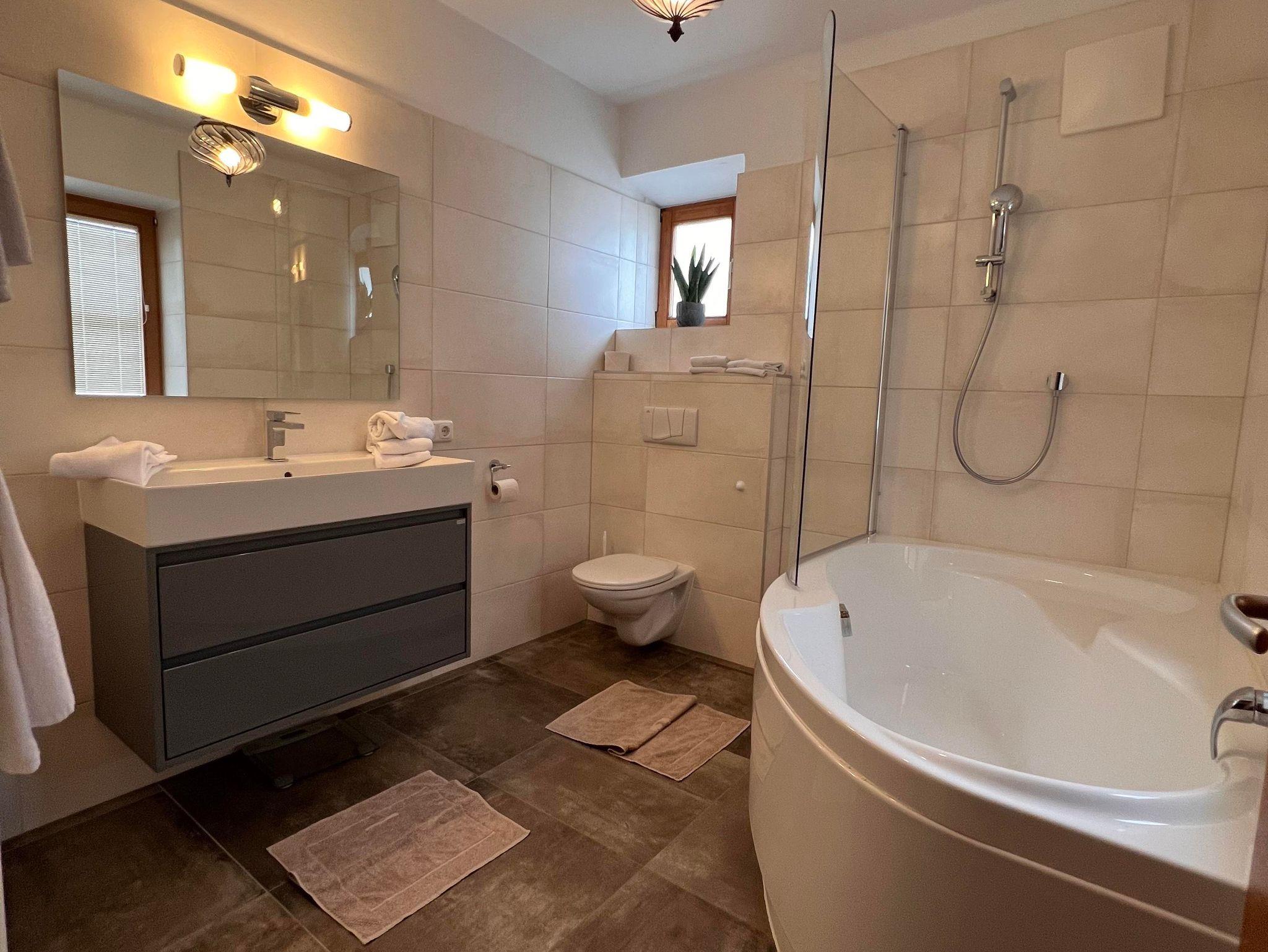 • 1 Badezimmer mit Duschbadewanne, WC, Handtuchtrockner und Haarföhn