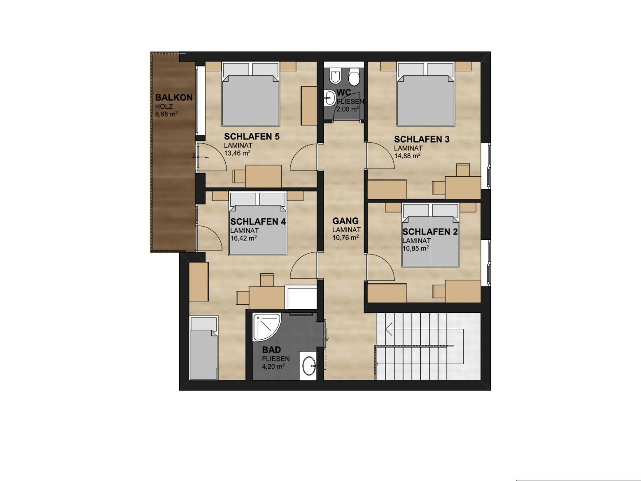 Einrichtung: 4 Schlafzimmer für 2 Personen, 1 Schlafzimmer für 4 Personen, 2 Bäder mit Dusche und WC