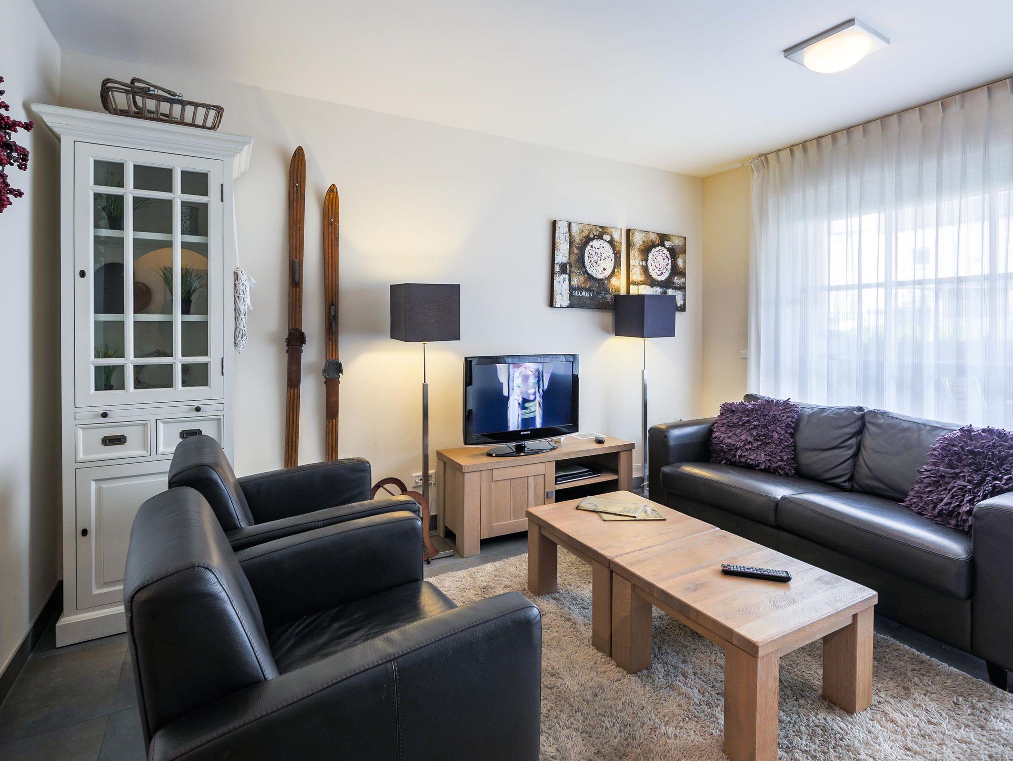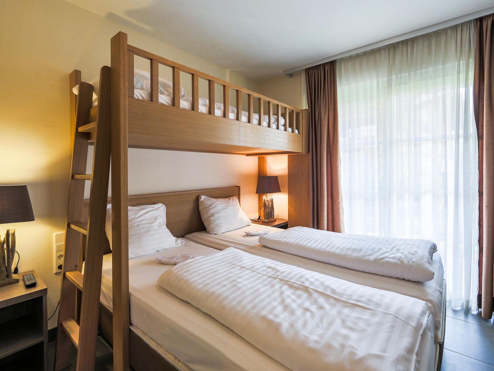 Dieses gemütliche Apartment liegt im Erdgeschoss und besteht aus zwei großen Schlafzimmern mit zwei Badezimmer. Eines der Schlafzimmer ist mit einem Doppelbett sowie einem Etagenbett und einem Badezimmer mit Dusche ausgestattet. Das andere Schlafzimmer beinhaltet ein Doppelbett und ein Badezimmer mit Badewanne und separater Dusche. Der Wohnbereich ist großzügig konzipiert mit einem Esstisch, einer offenen Design-Küche und einem schönen Sitzbereich. Zur großen Terrasse gelangt man direkt vom Wohnzimmer aus.