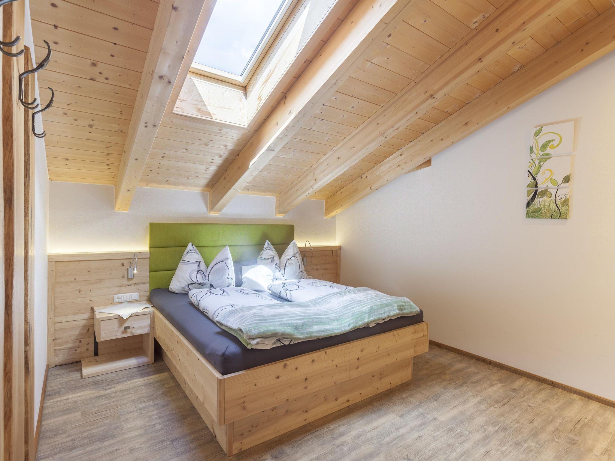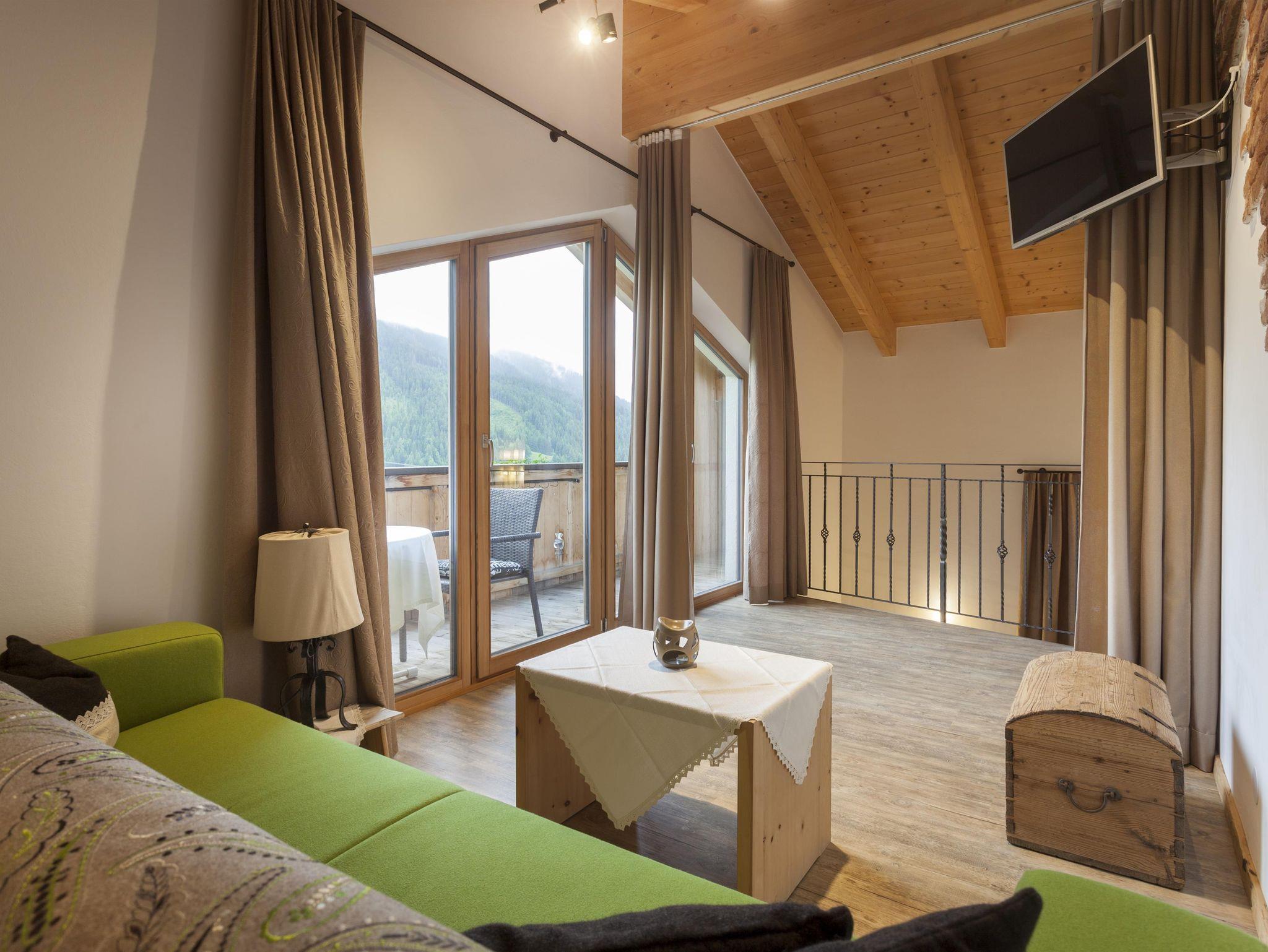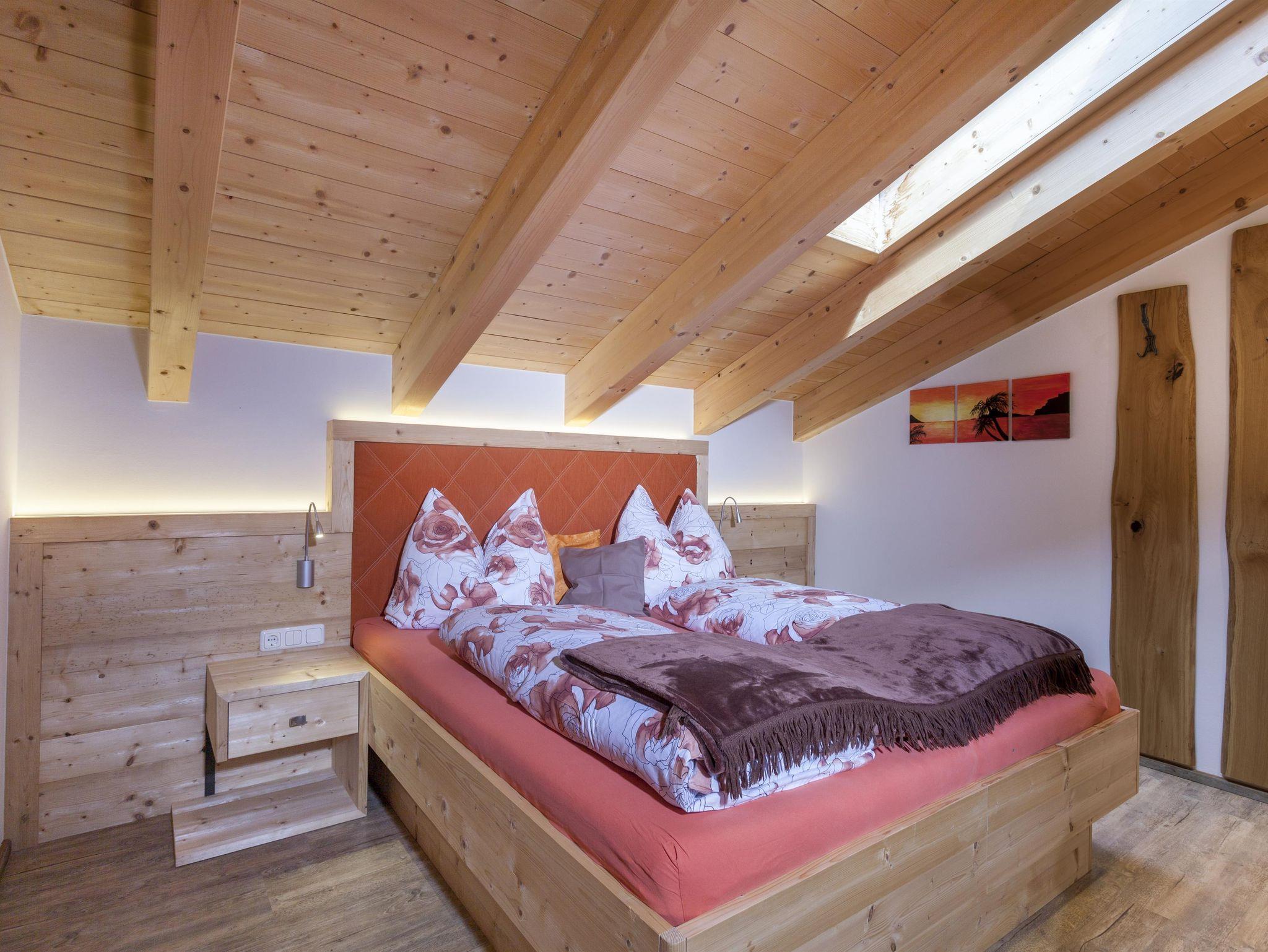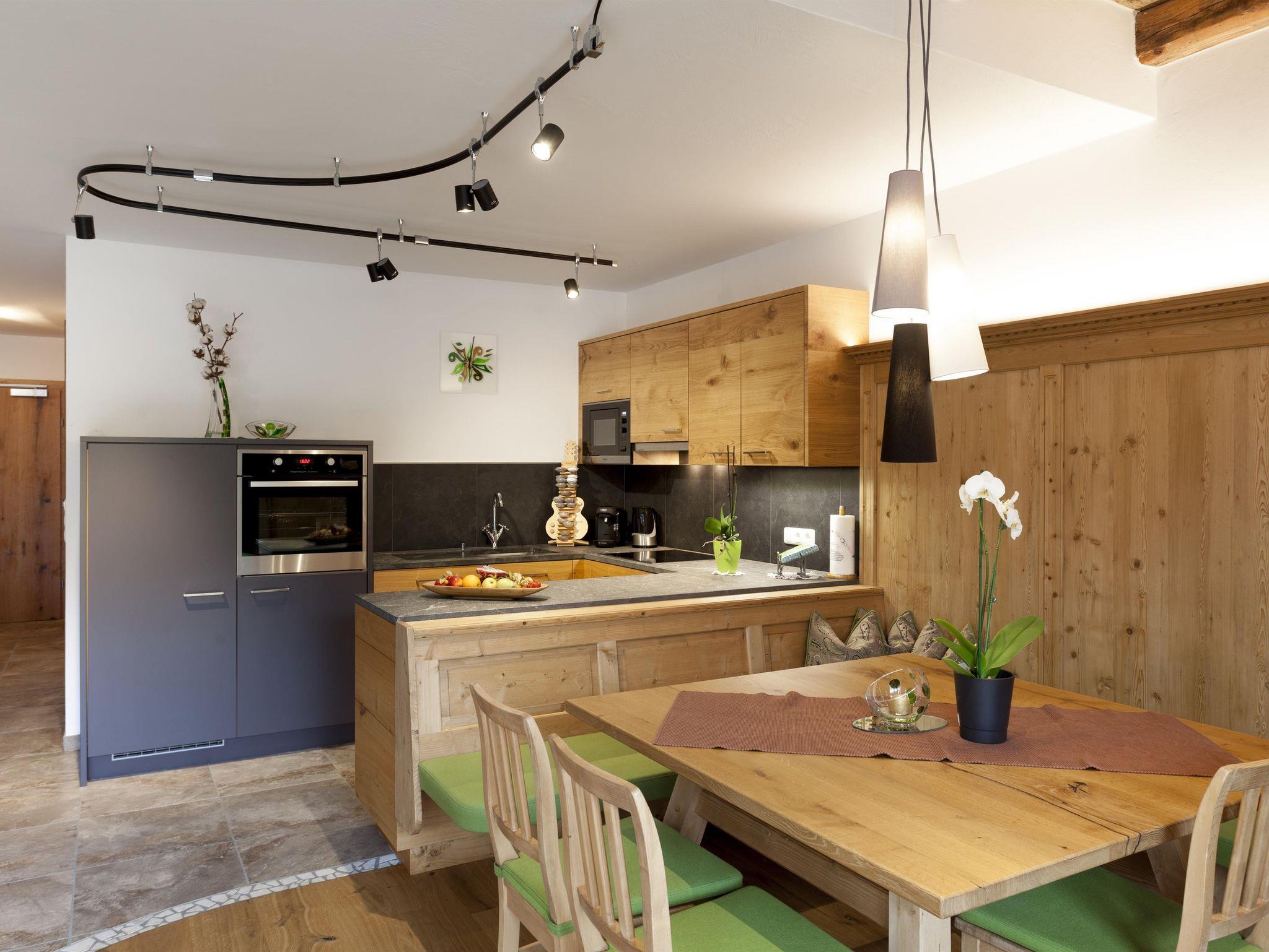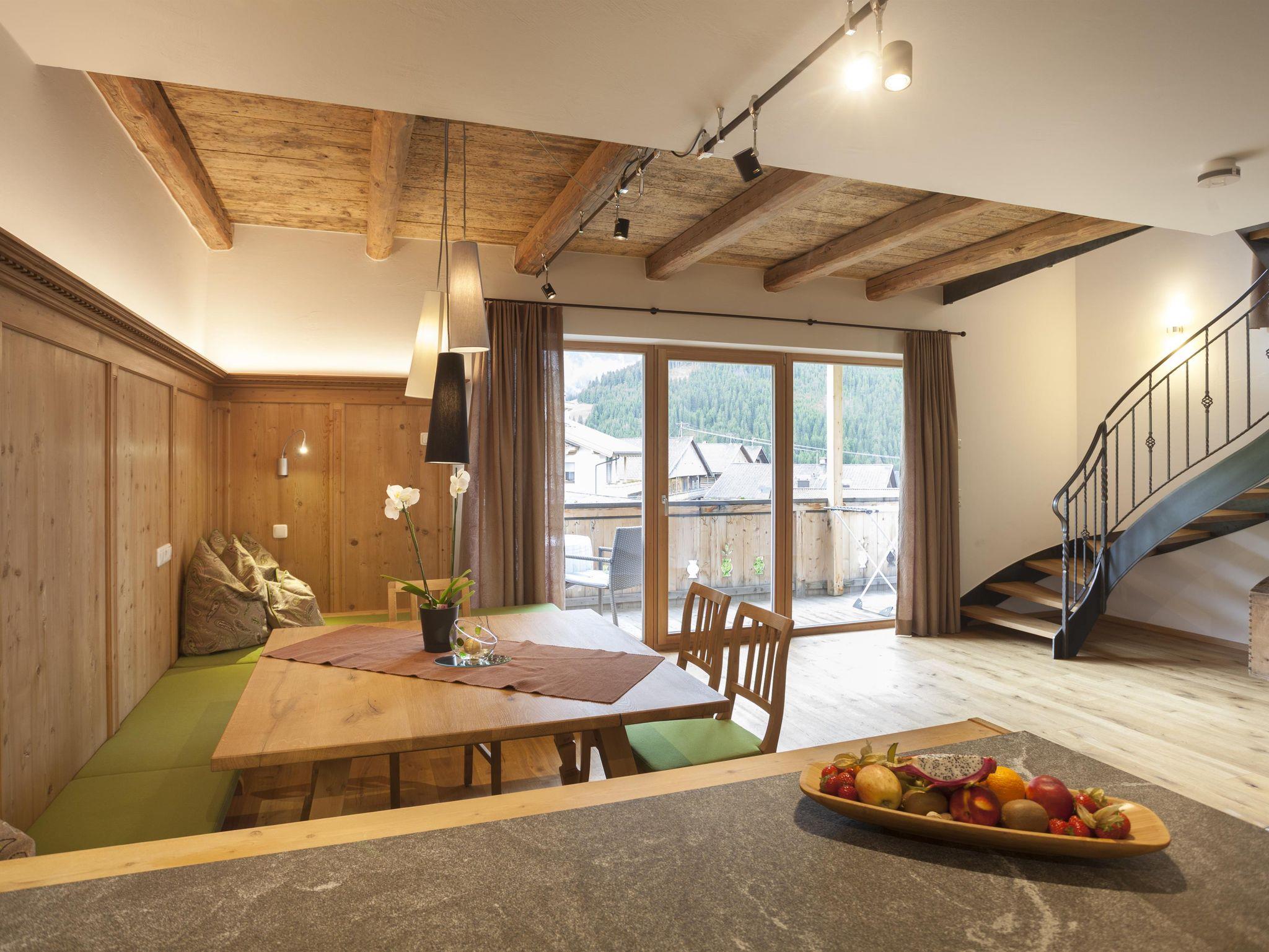 Die Wohnung liegt südöstlich, misst 130 m², hat 3 Altholz-Schlafzimmer mit Sat-TV, eine urige Wohnküche mit Stubencharakter, 3 Bäder, eines mit Whirlpool und Bidet, ein separates WC, ein offenes Wohnzimmer im oberen Stock und 2 große Balkone.