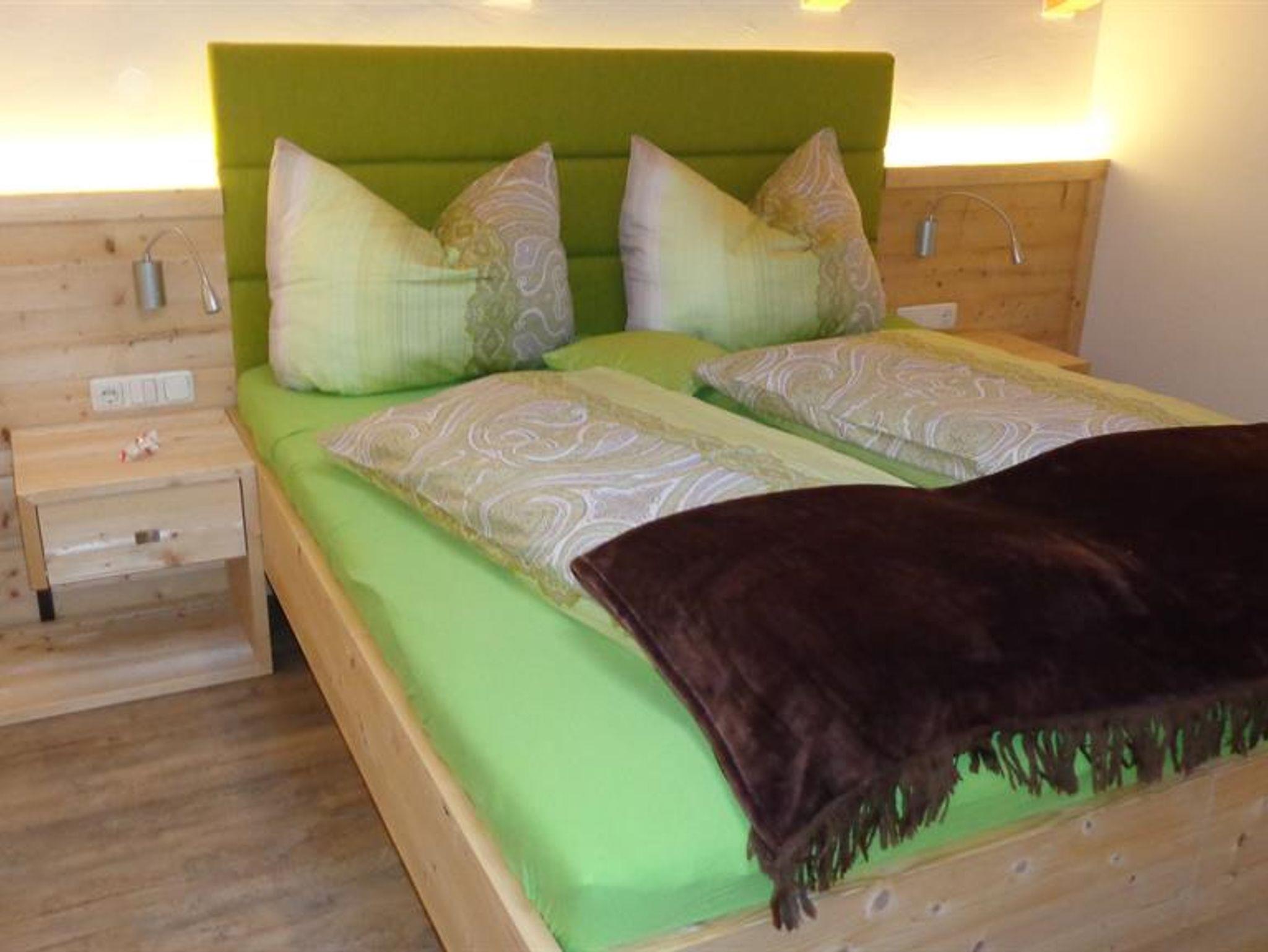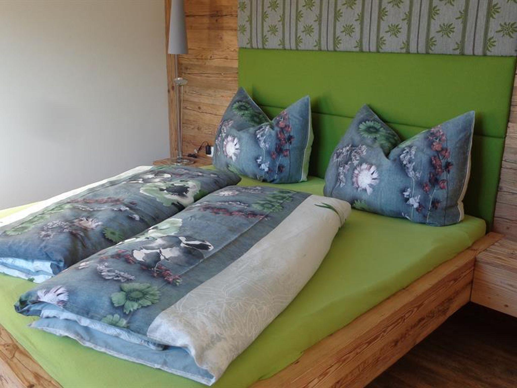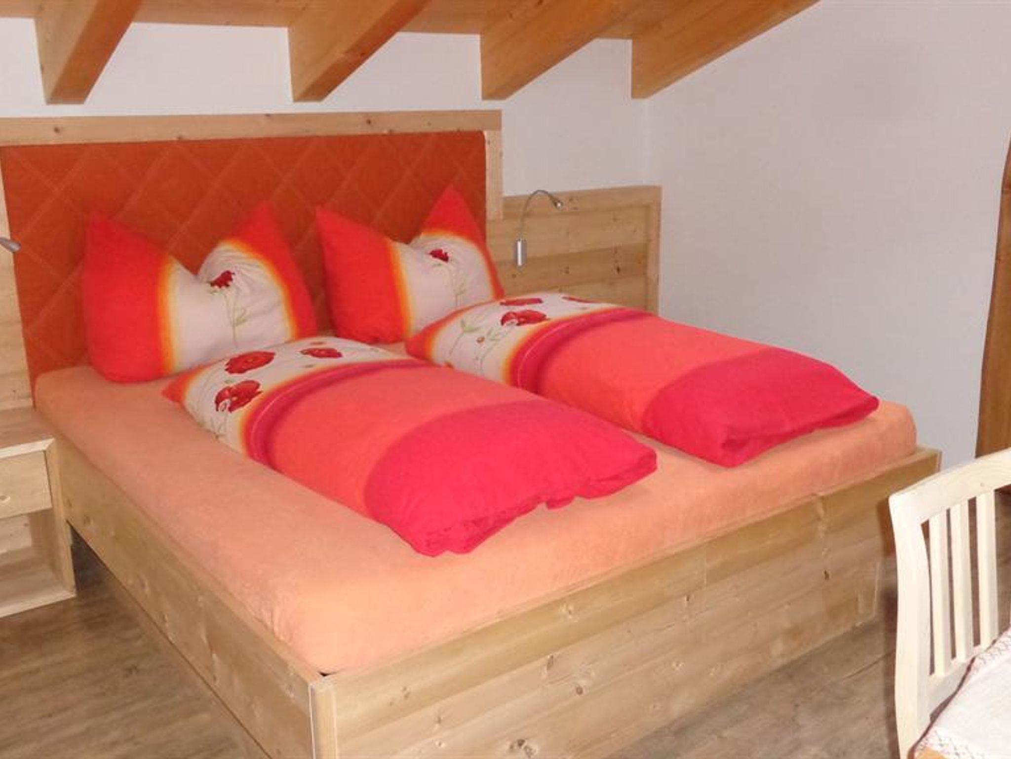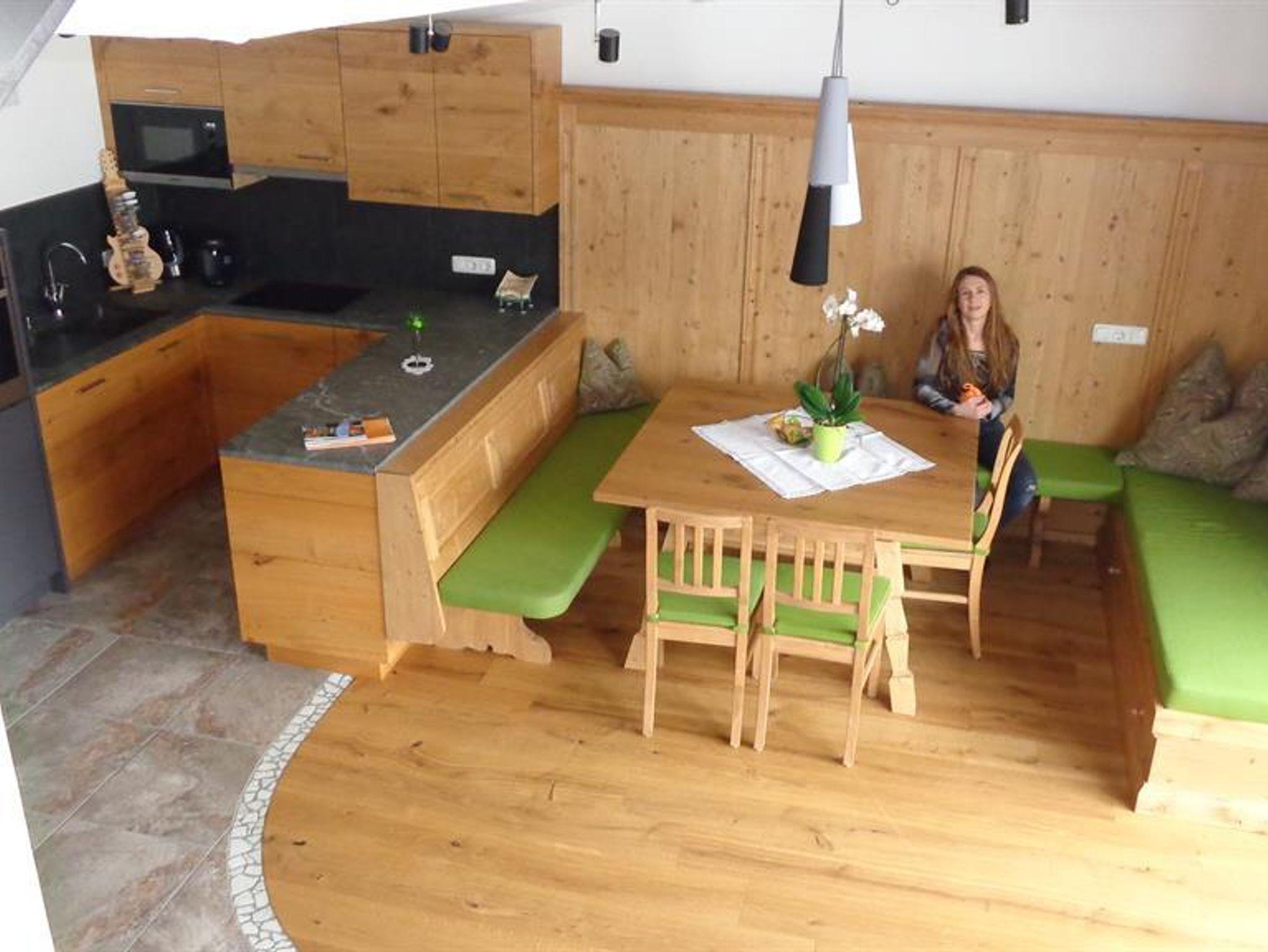 Die Wohnung liegt südöstlich, misst 130 m², hat 3 Altholz-Schlafzimmer mit Sat-TV, eine urige Wohnküche mit Stubencharakter, 3 Bäder, eines mit Whirlpool und Bidet, ein separates WC, ein offenes Wohnzimmer im oberen Stock und 2 große Balkone.