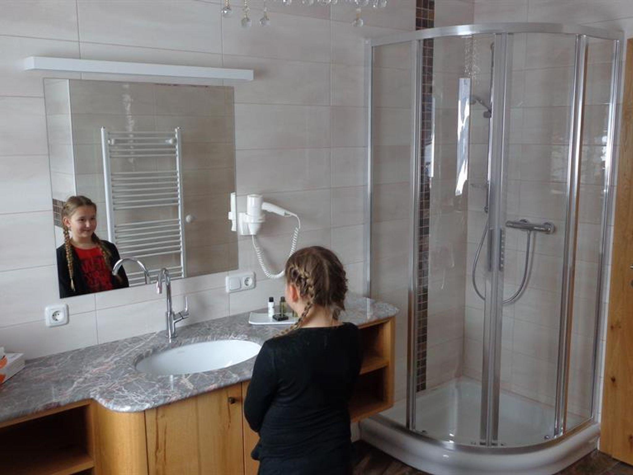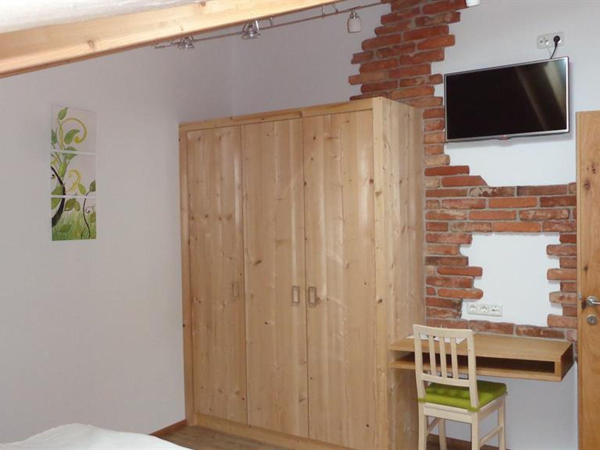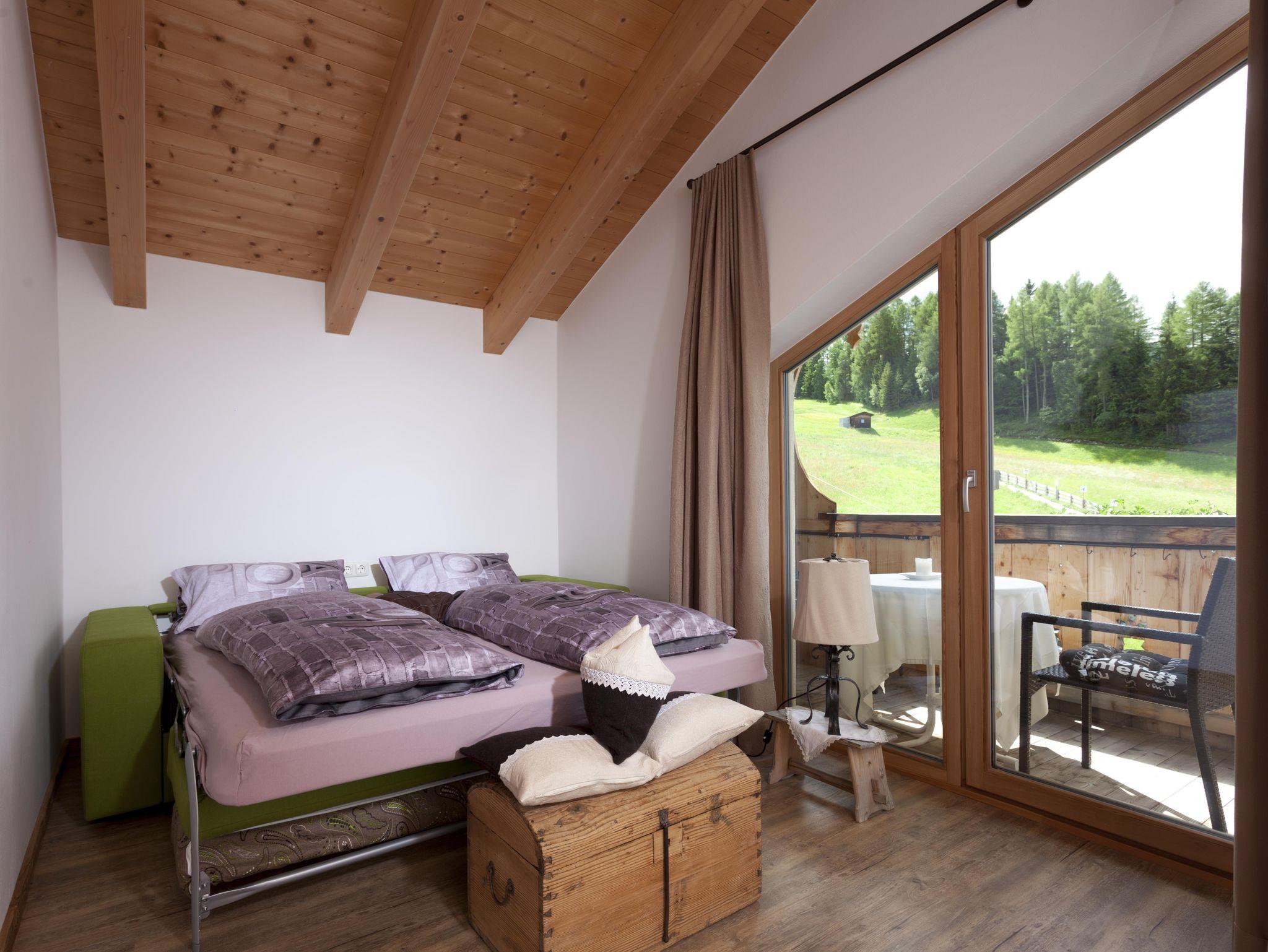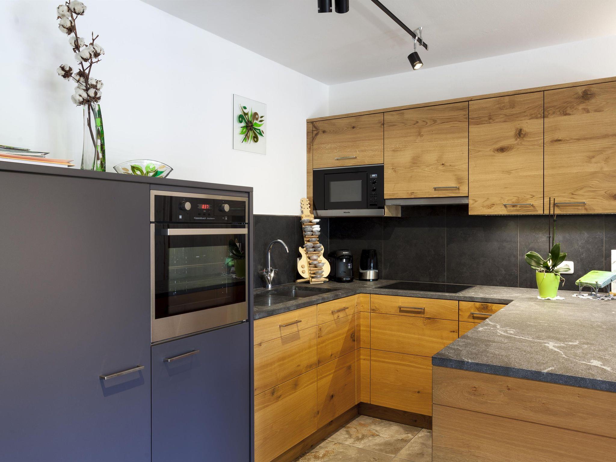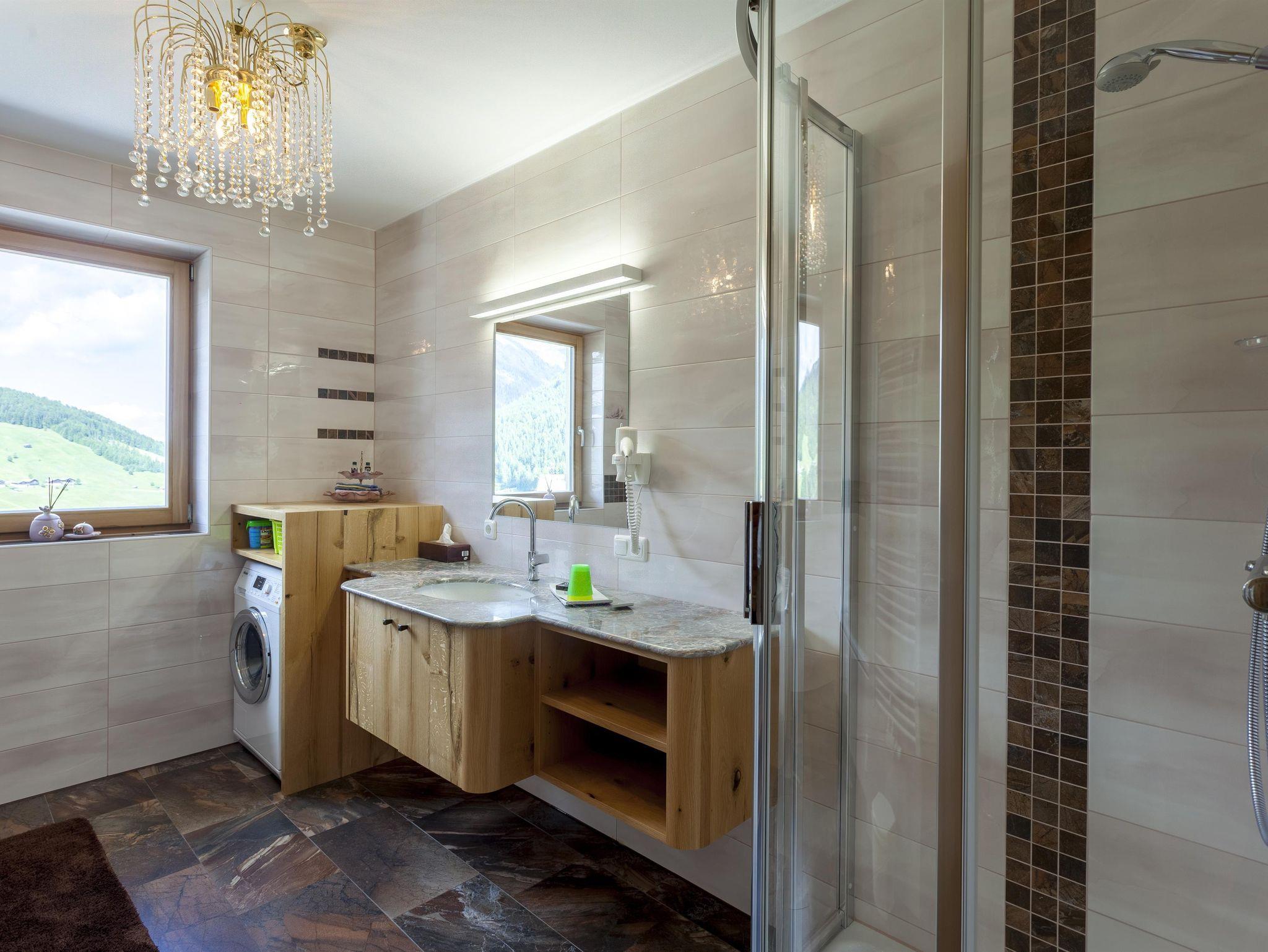 Die Wohnung liegt südöstlich, misst 130 m², hat 3 Altholz-Schlafzimmer mit Sat-TV, eine urige Wohnküche mit Stubencharakter, 3 Bäder, eines mit Whirlpool und Bidet, ein separates WC, ein offenes Wohnzimmer im oberen Stock und 2 große Balkone.
