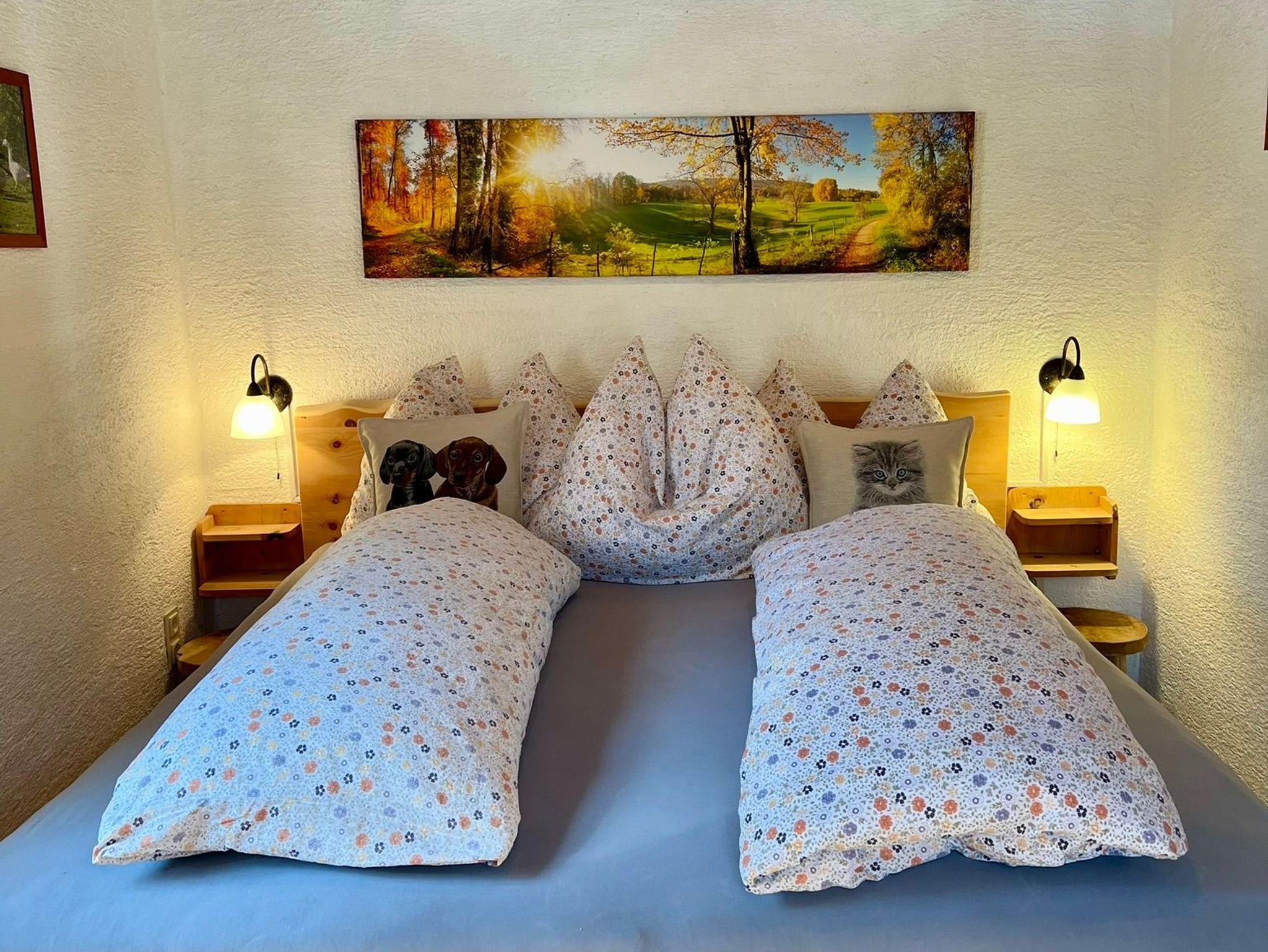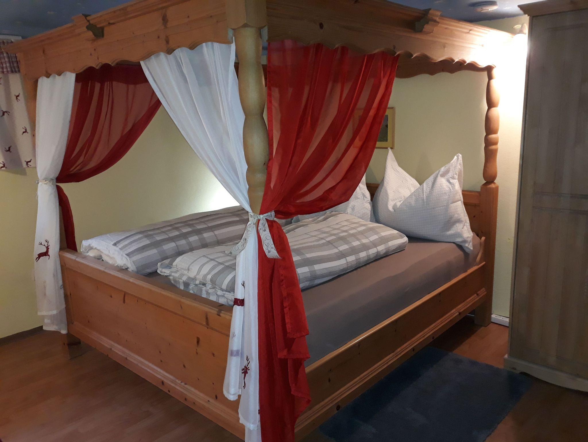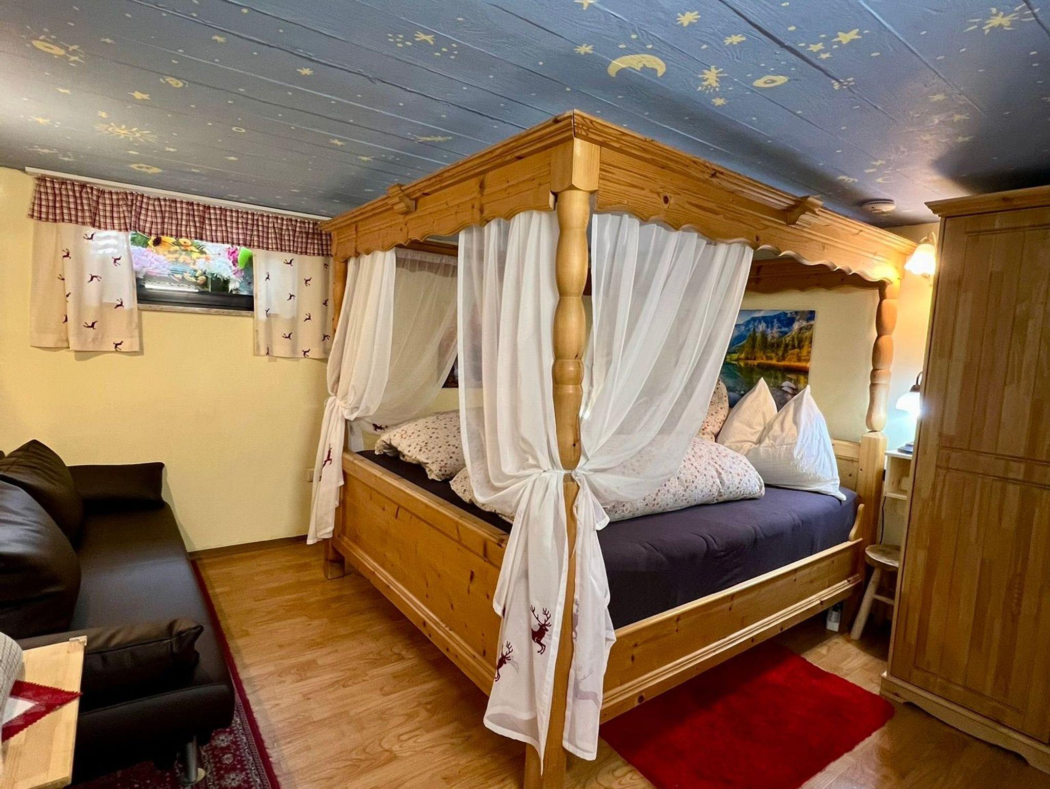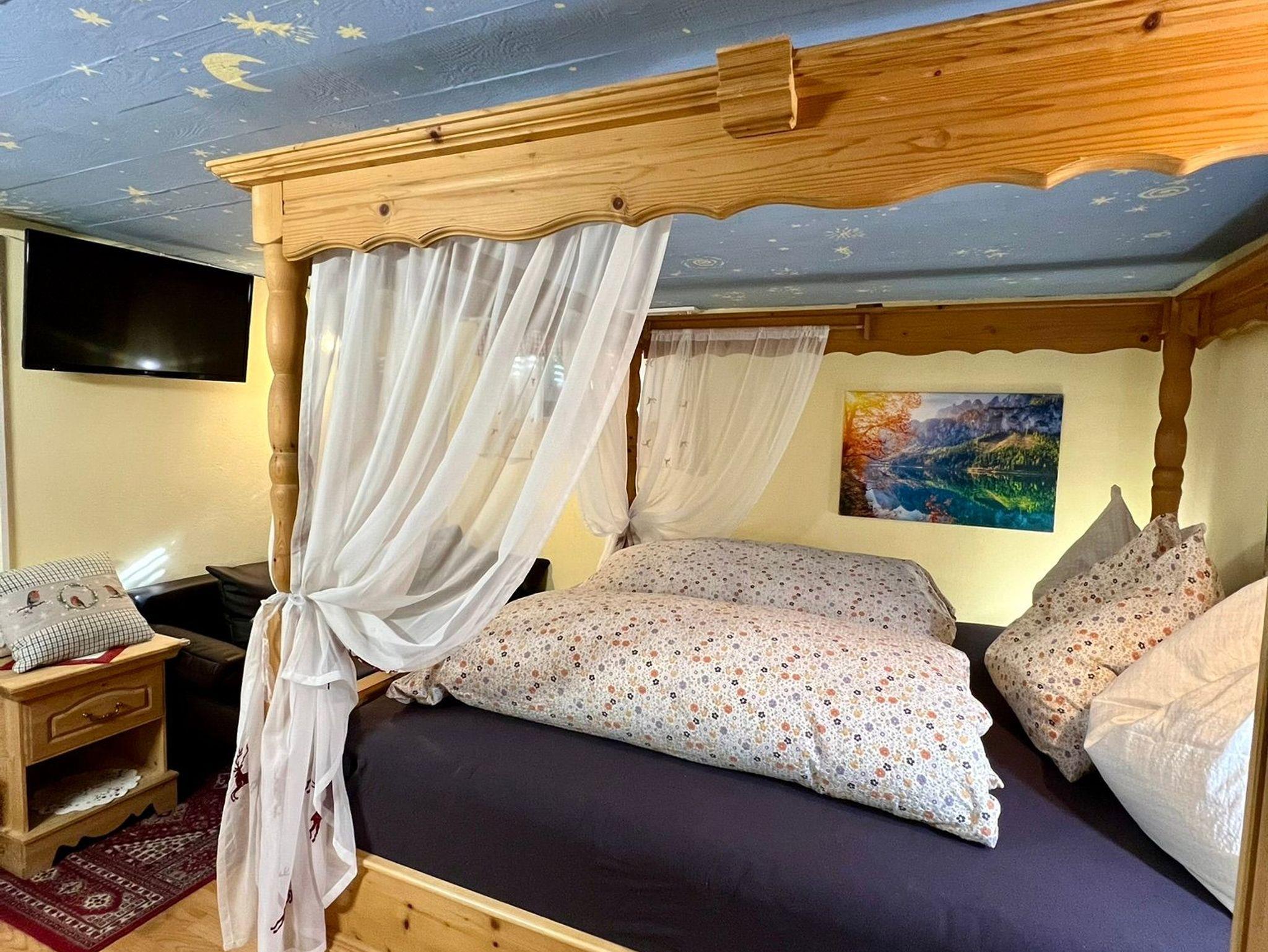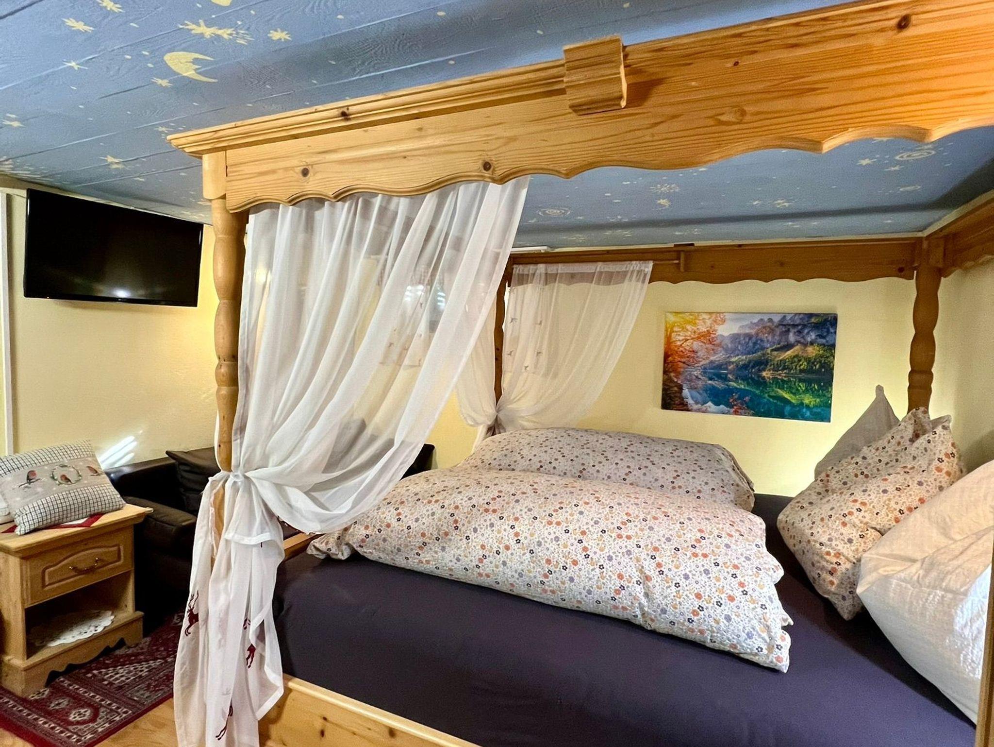 Zweibettzimmer mit Himmelbett, Flachbild-TV, Radio mit Bluetooth Lautsprecher, Landhausschrank, Nachtkästchen und Waschbecken.