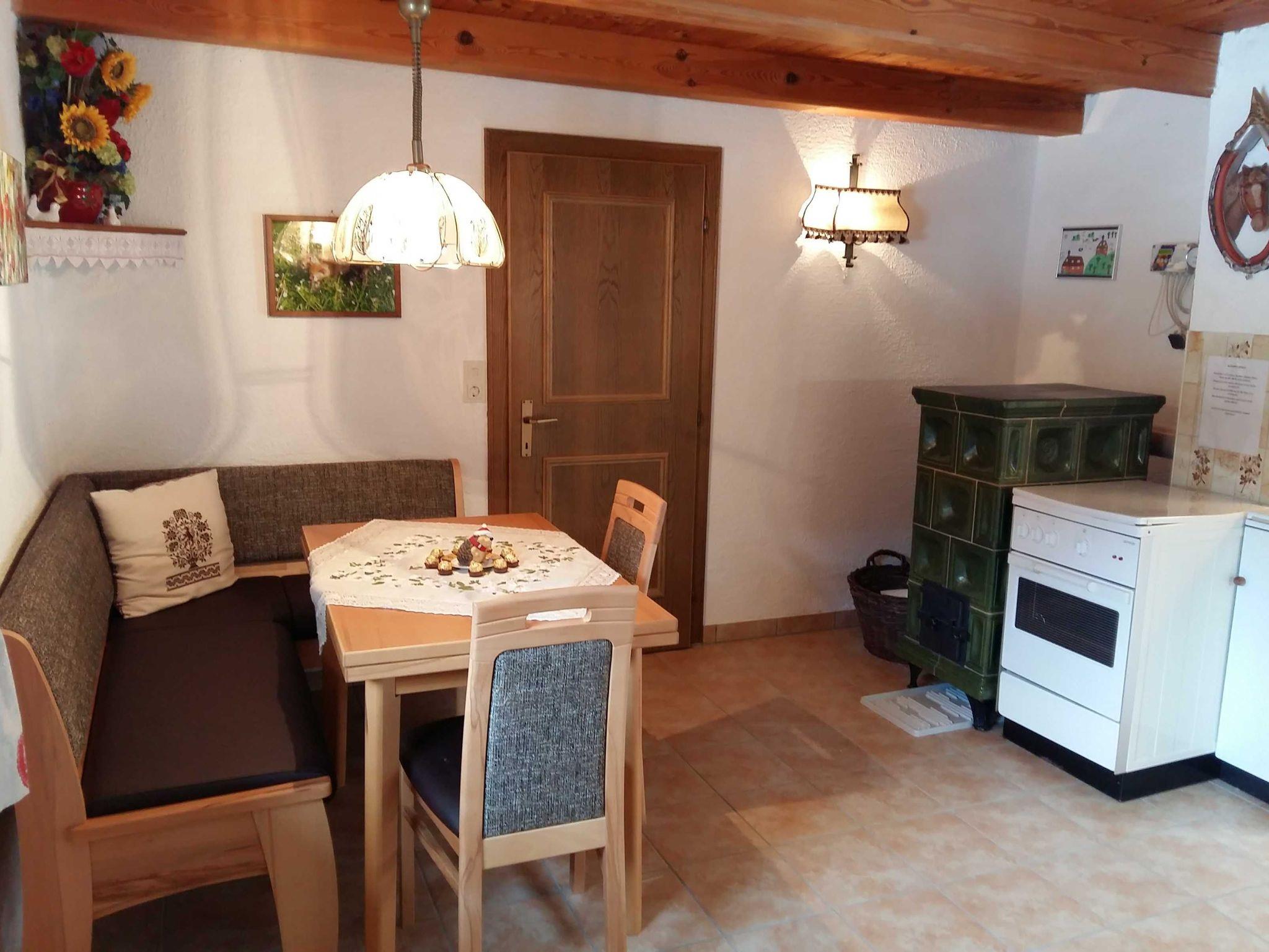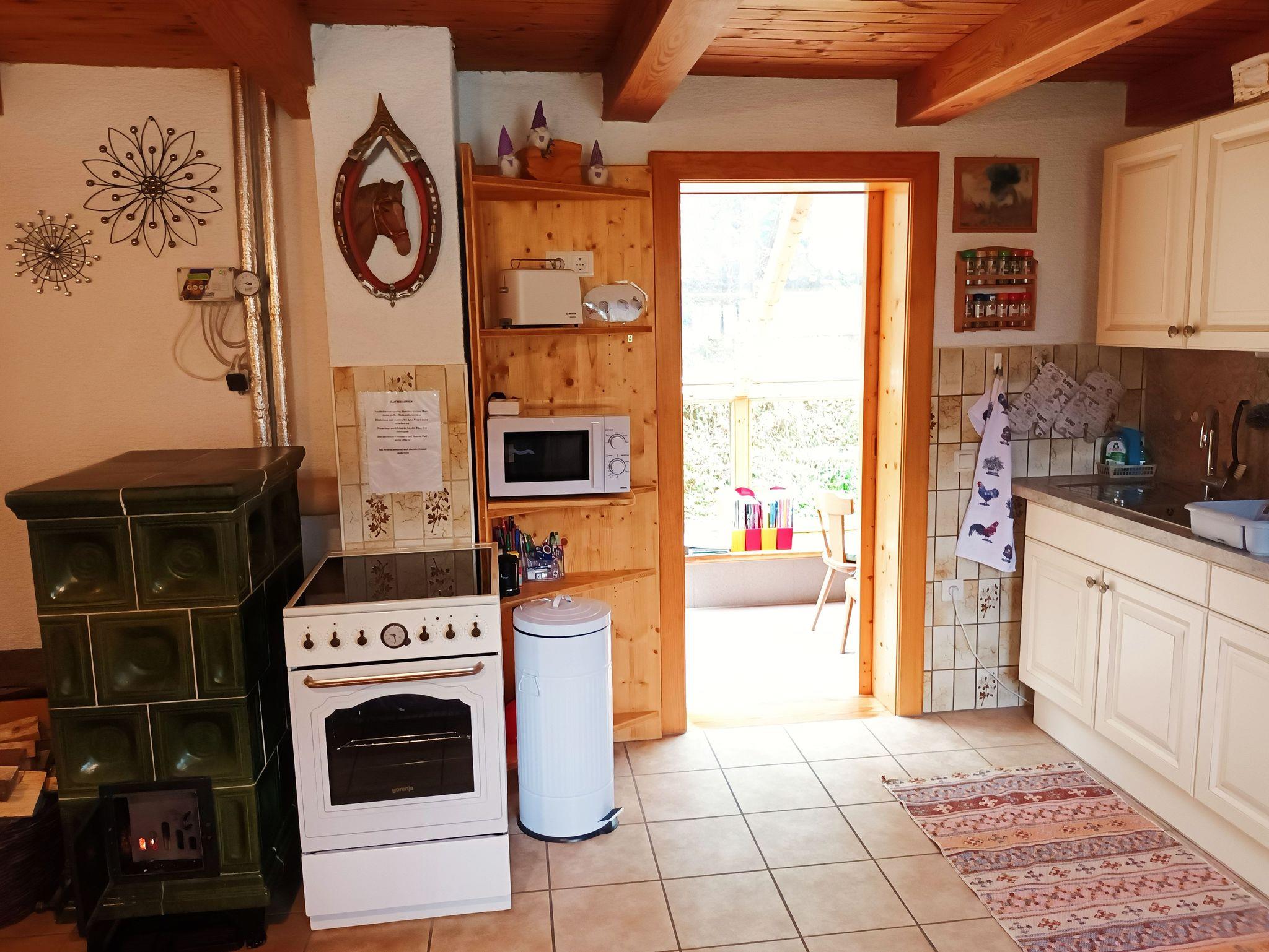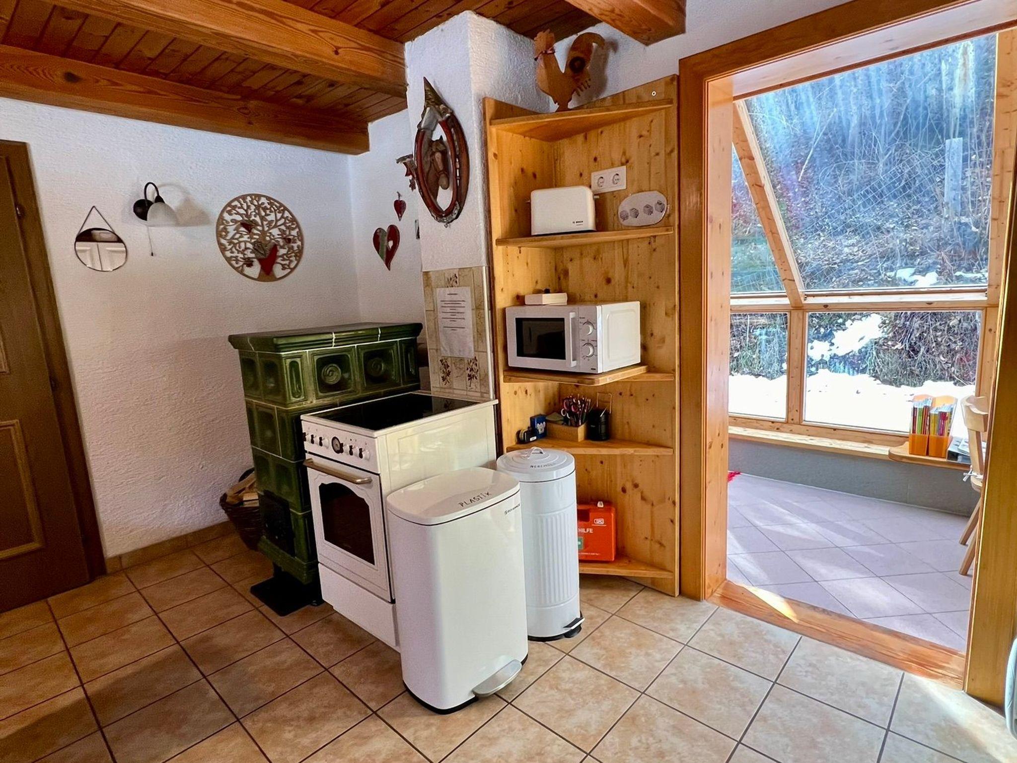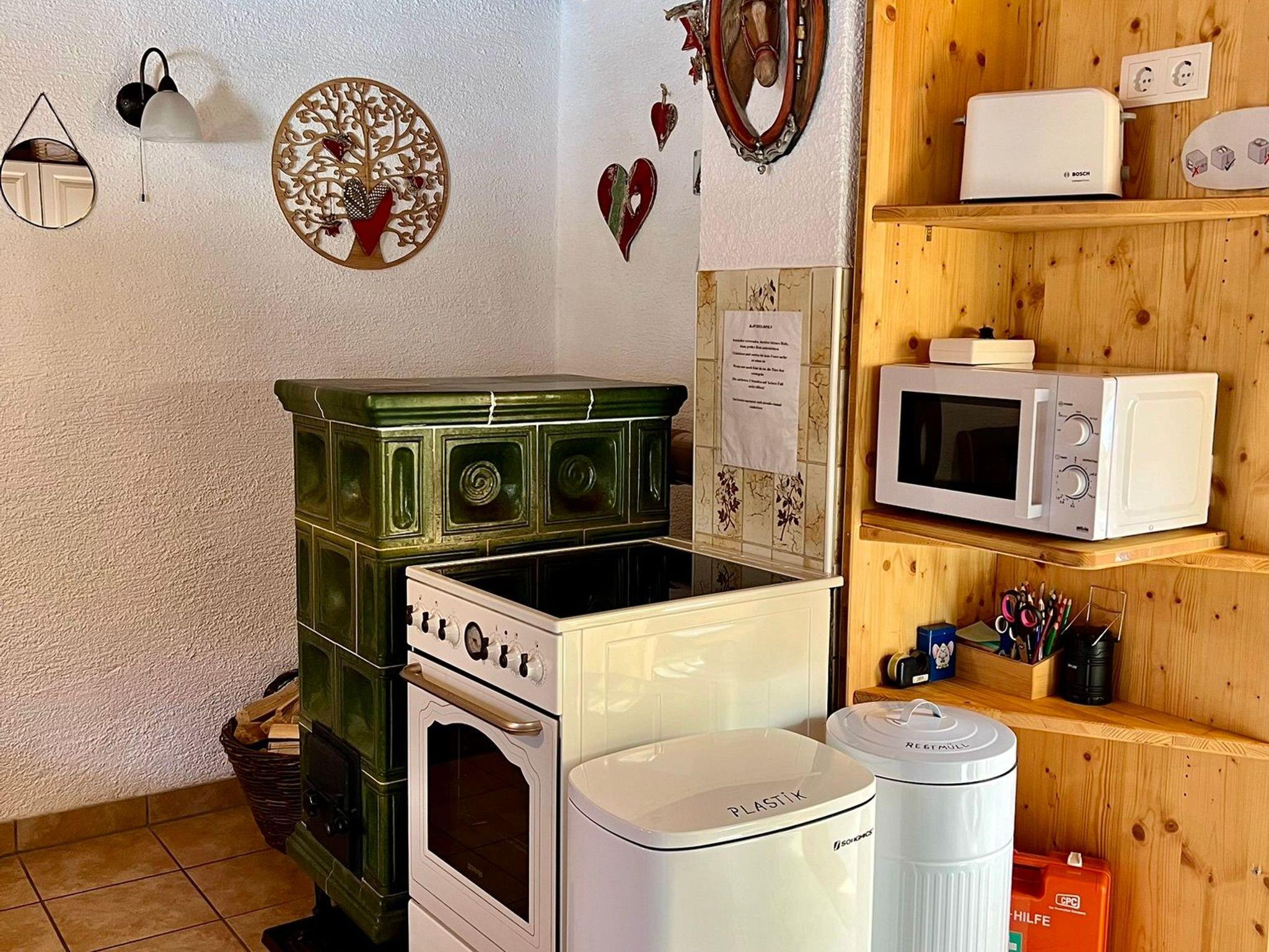 Wohnküche mit voll ausgestatteter Küchenzeile, E-Herd, Mikrowellenherd, Geschirrspüler, Kachelofen und Sitzecke. Genug Geschirr für 6 Personen.