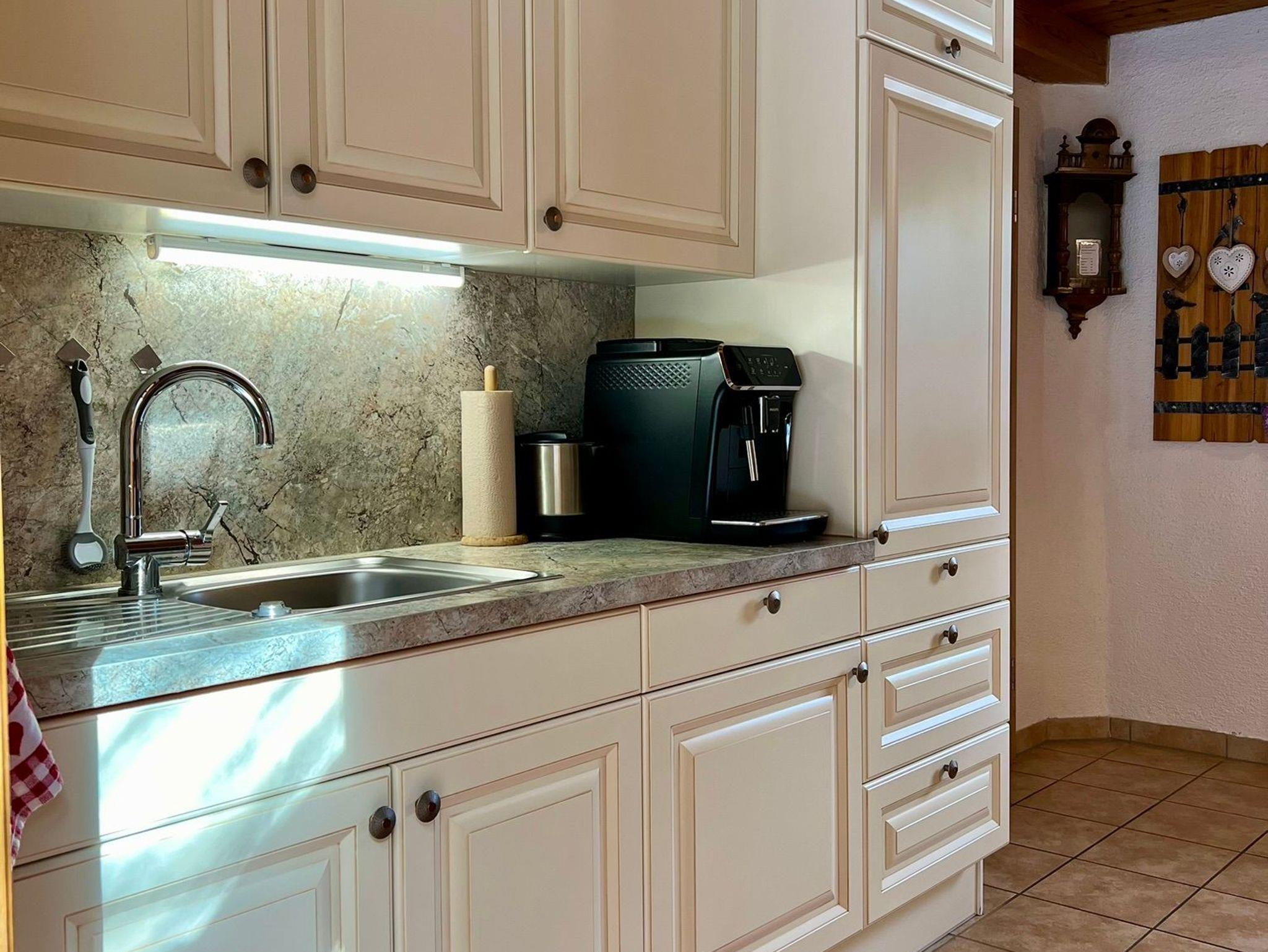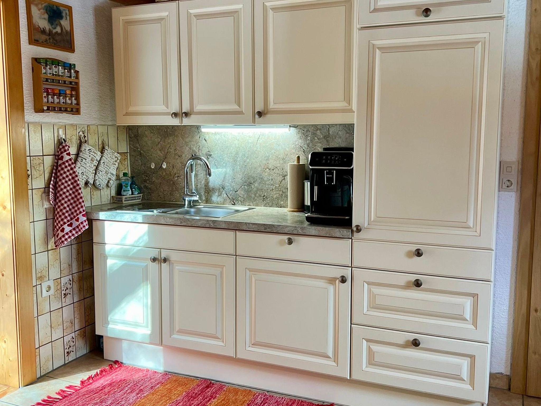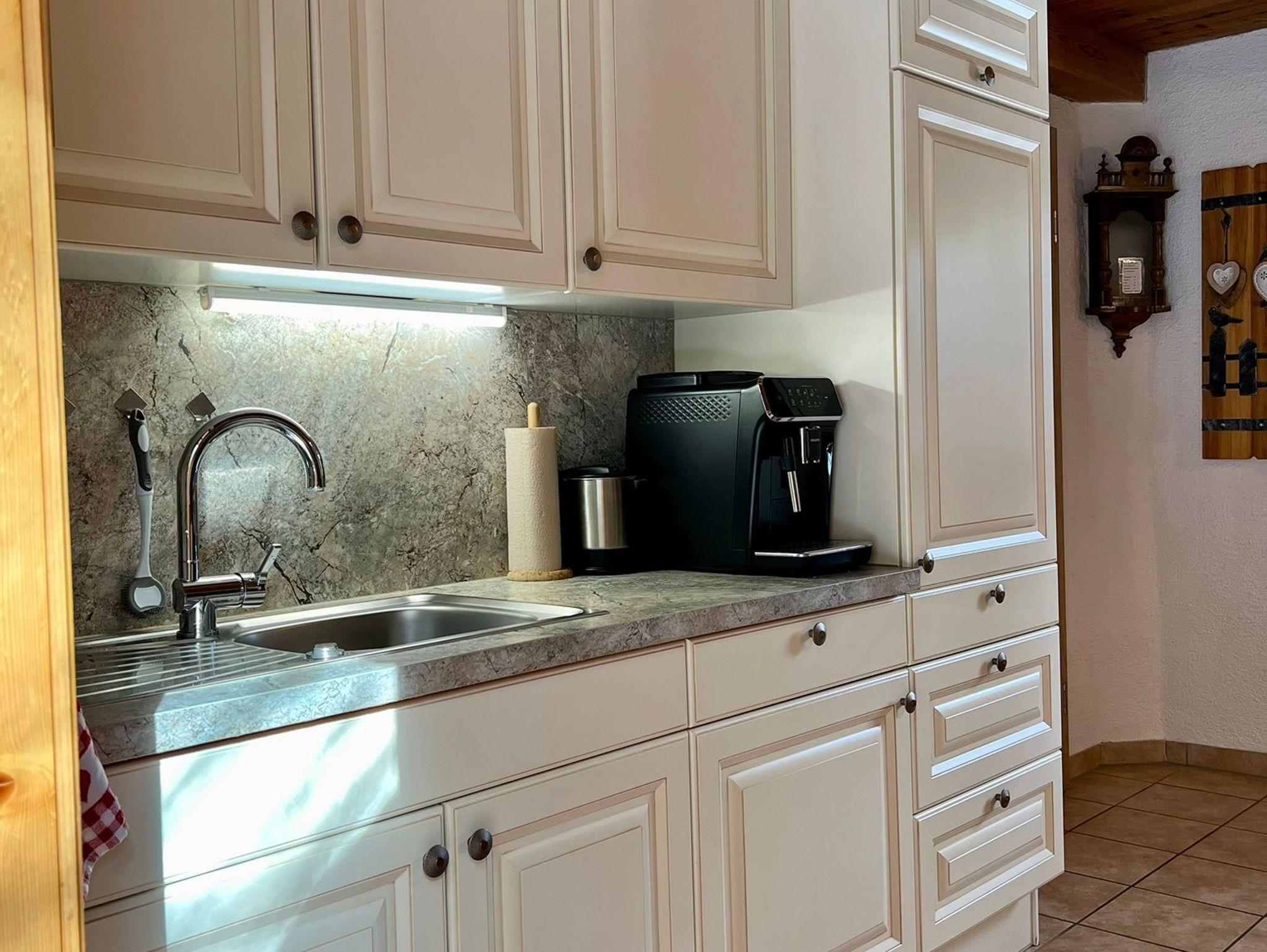 Wohnküche mit voll ausgestatteter Küchenzeile, E-Herd, Mikrowellenherd, Geschirrspüler, Kachelofen und Sitzecke. Genug Geschirr für 6 Personen.