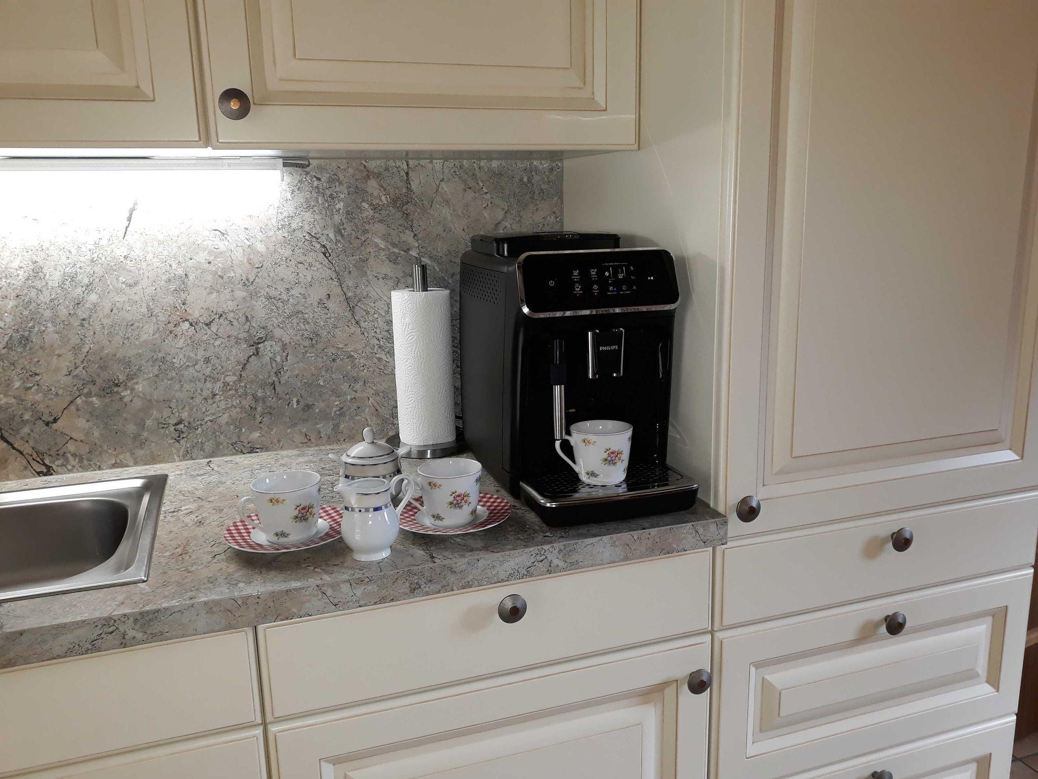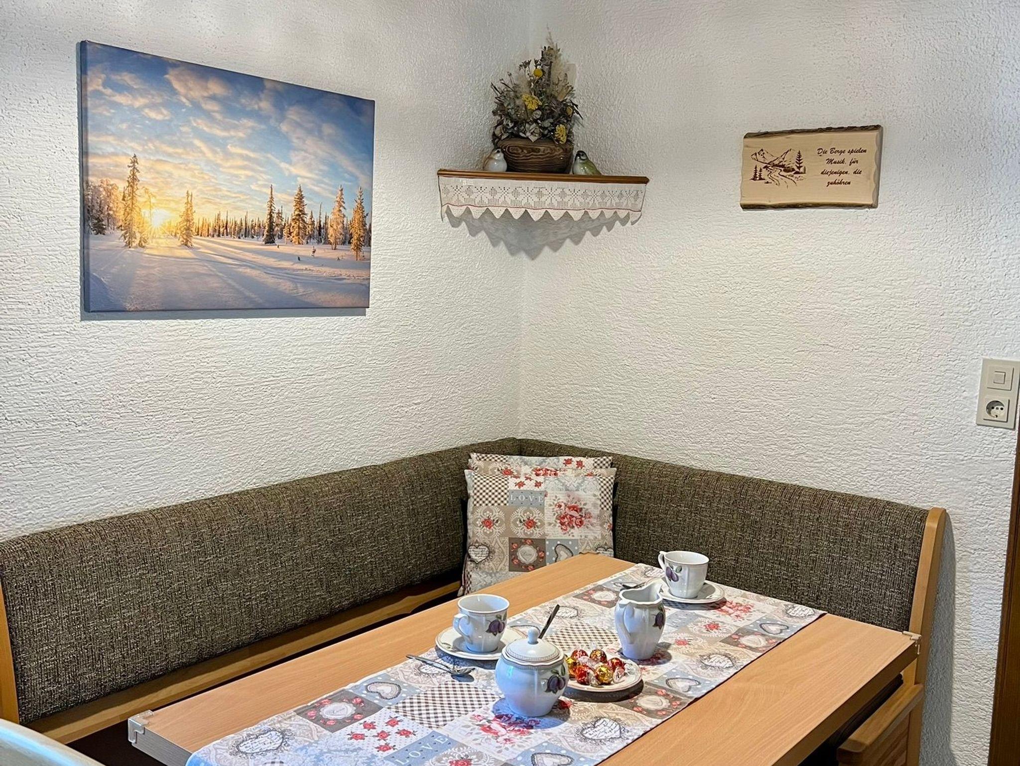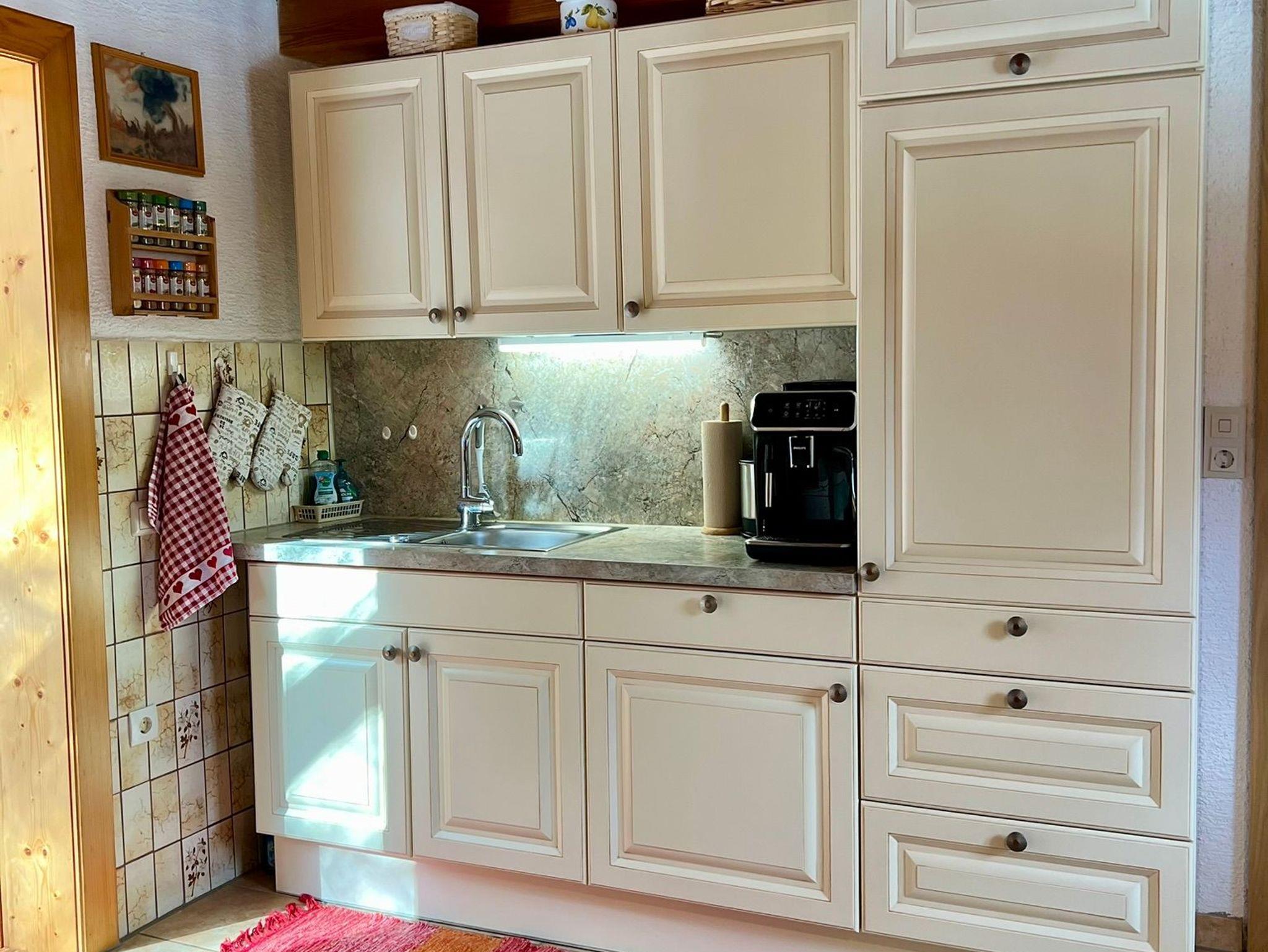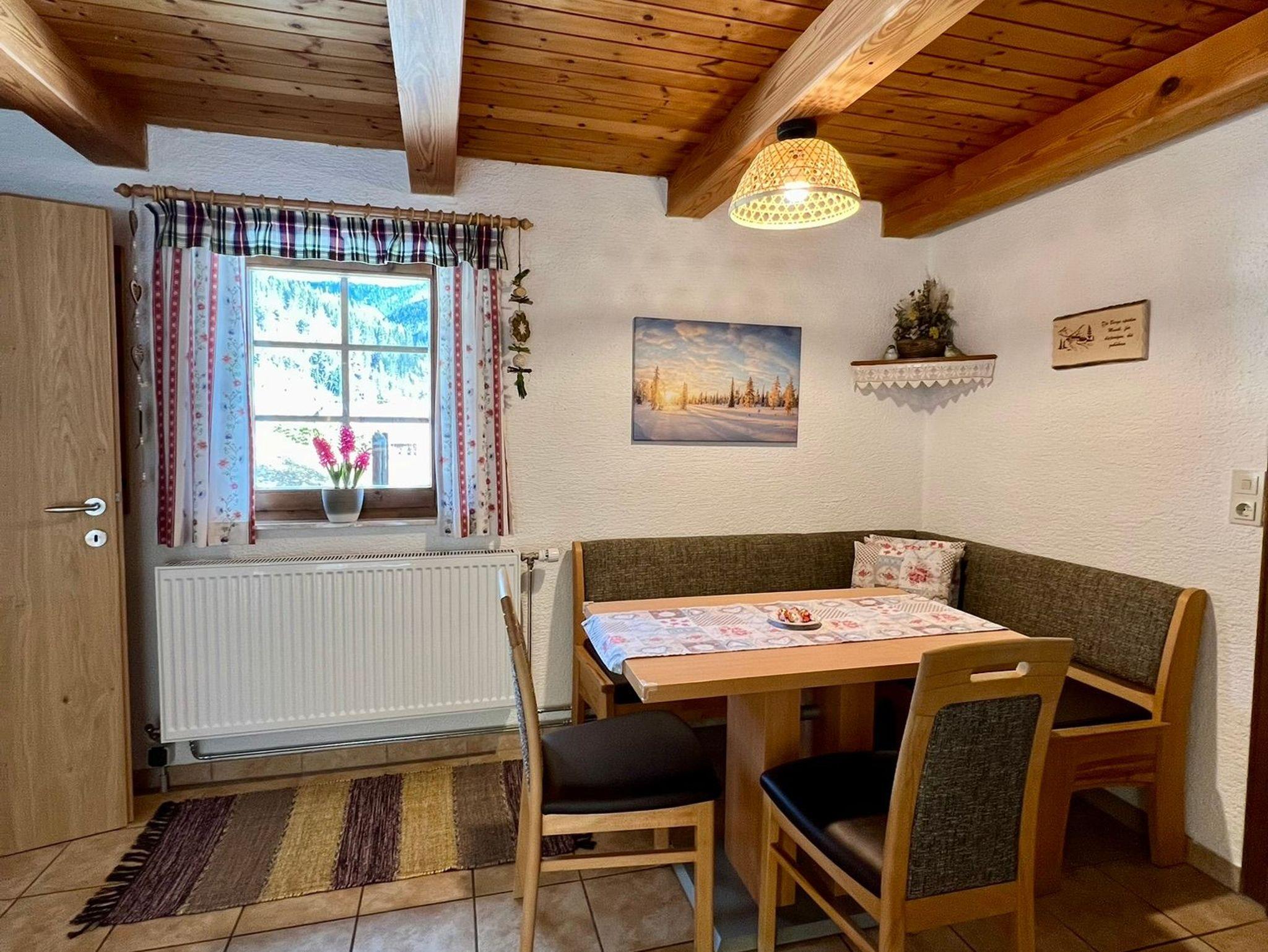 Wohnküche mit voll ausgestatteter Küchenzeile, E-Herd, Mikrowellenherd, Geschirrspüler, Kachelofen und Sitzecke. Genug Geschirr für 6 Personen.