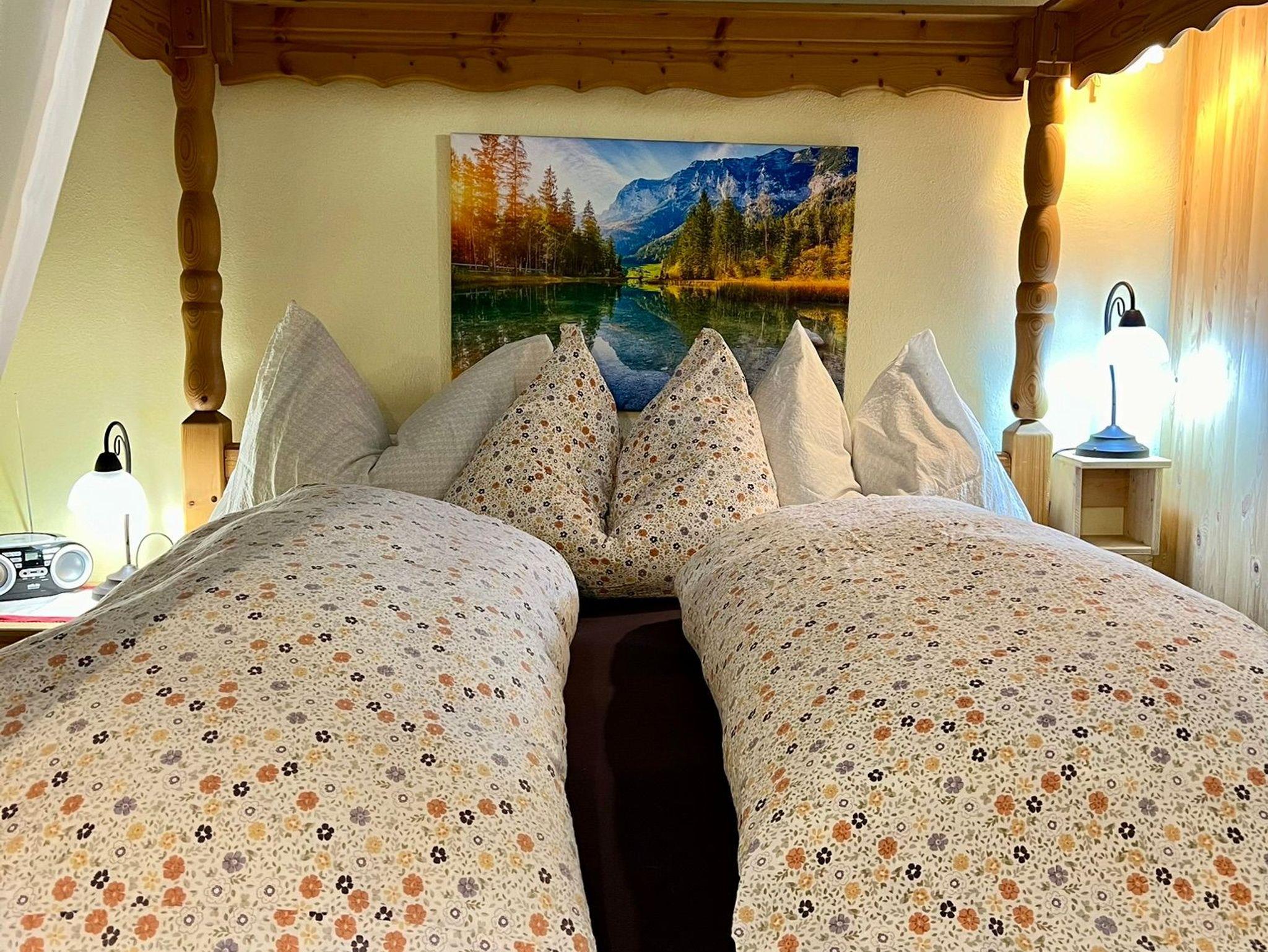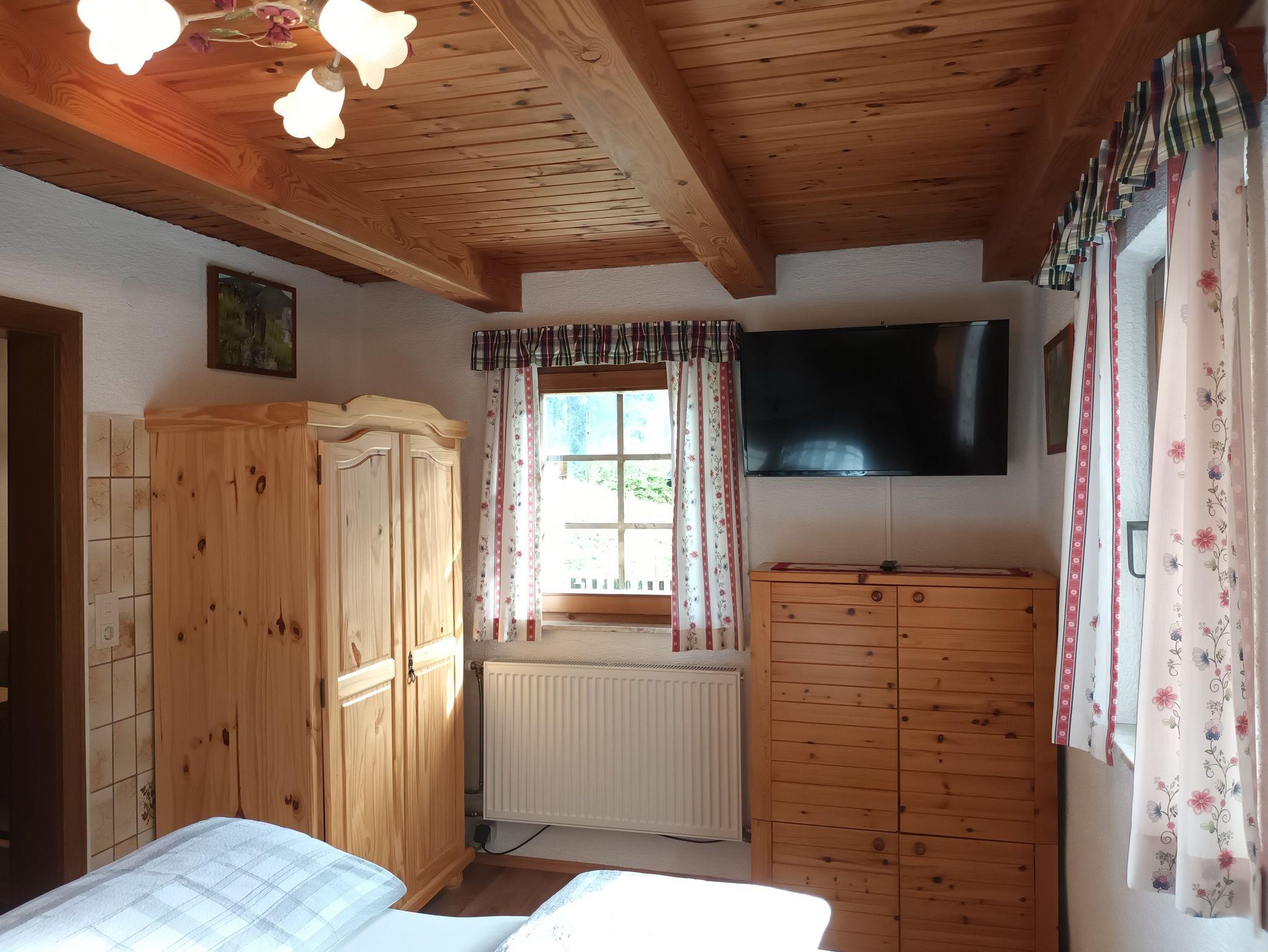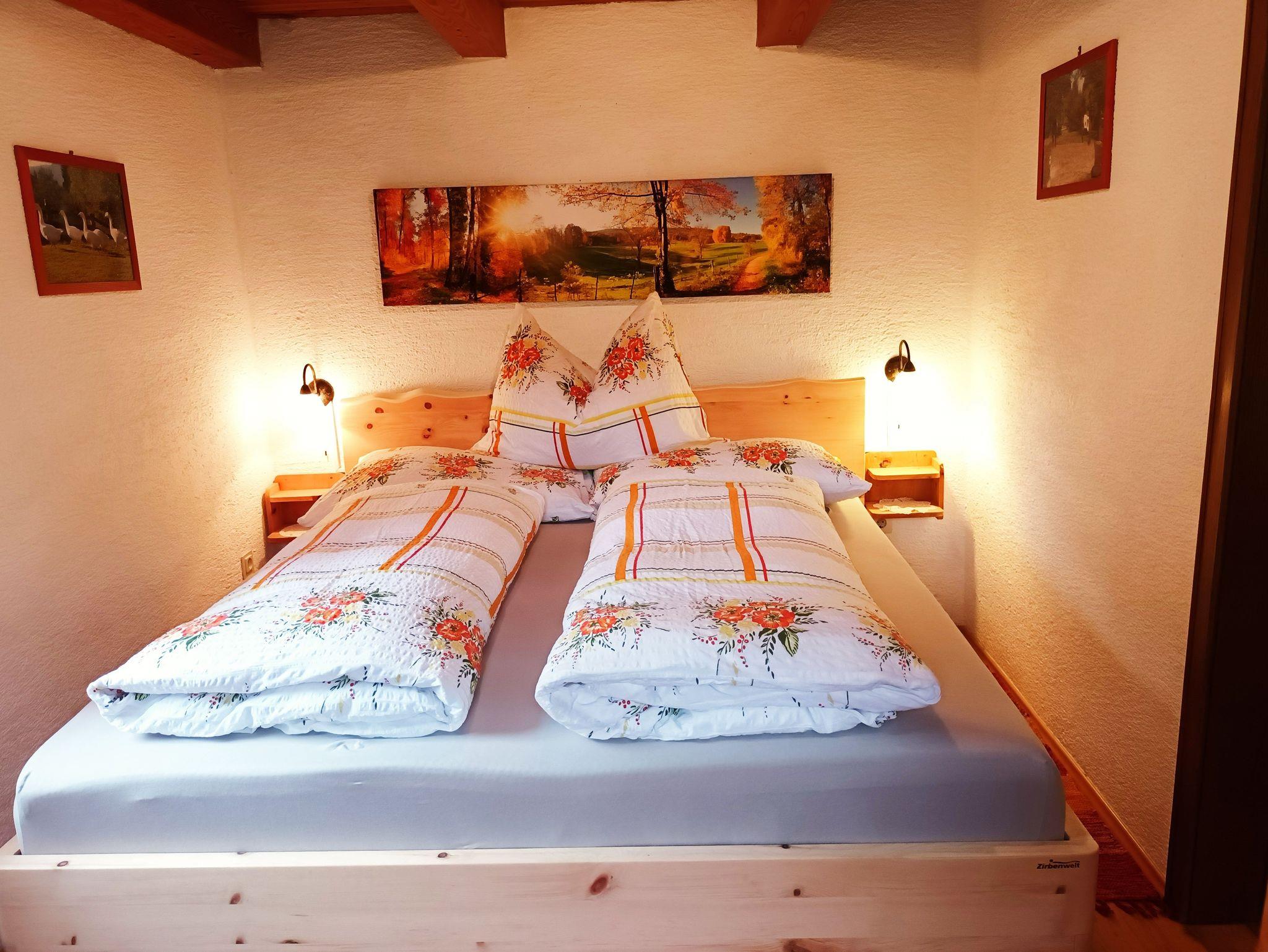 Zweibettzimmer mit Zirbenbett, Kommode, Schrank und Flachbild-TV.