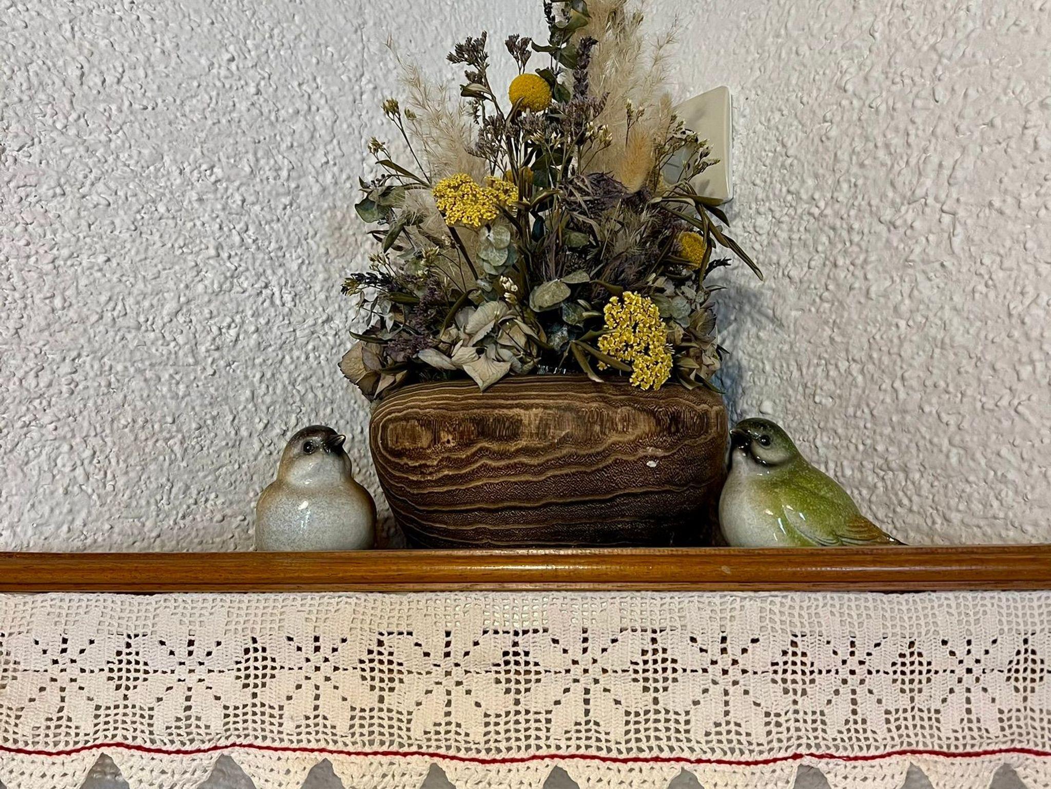 Wintergarten mit schöner Sitzecke in Holz und Radio mit Bluetooth Lautsprecher.