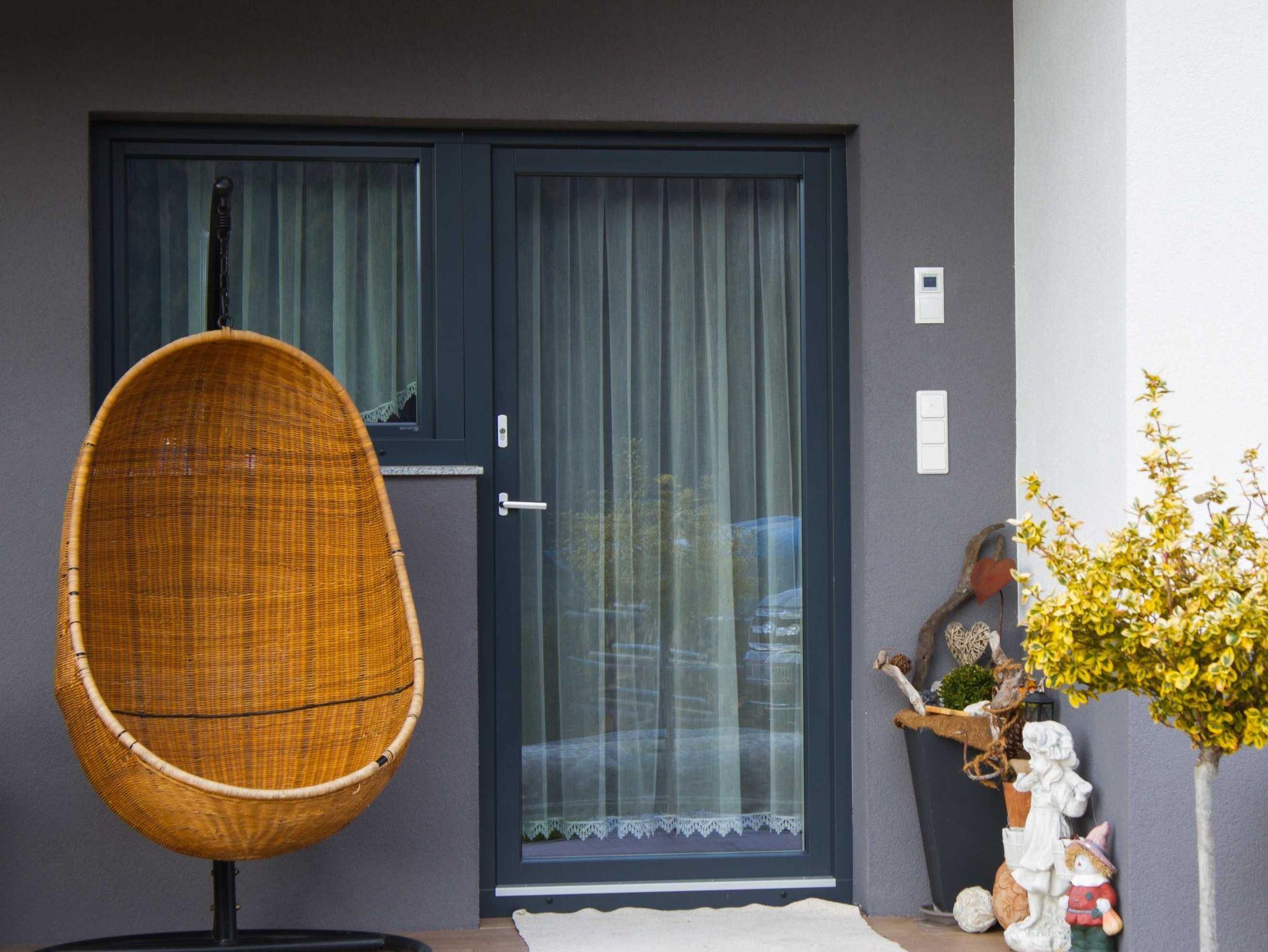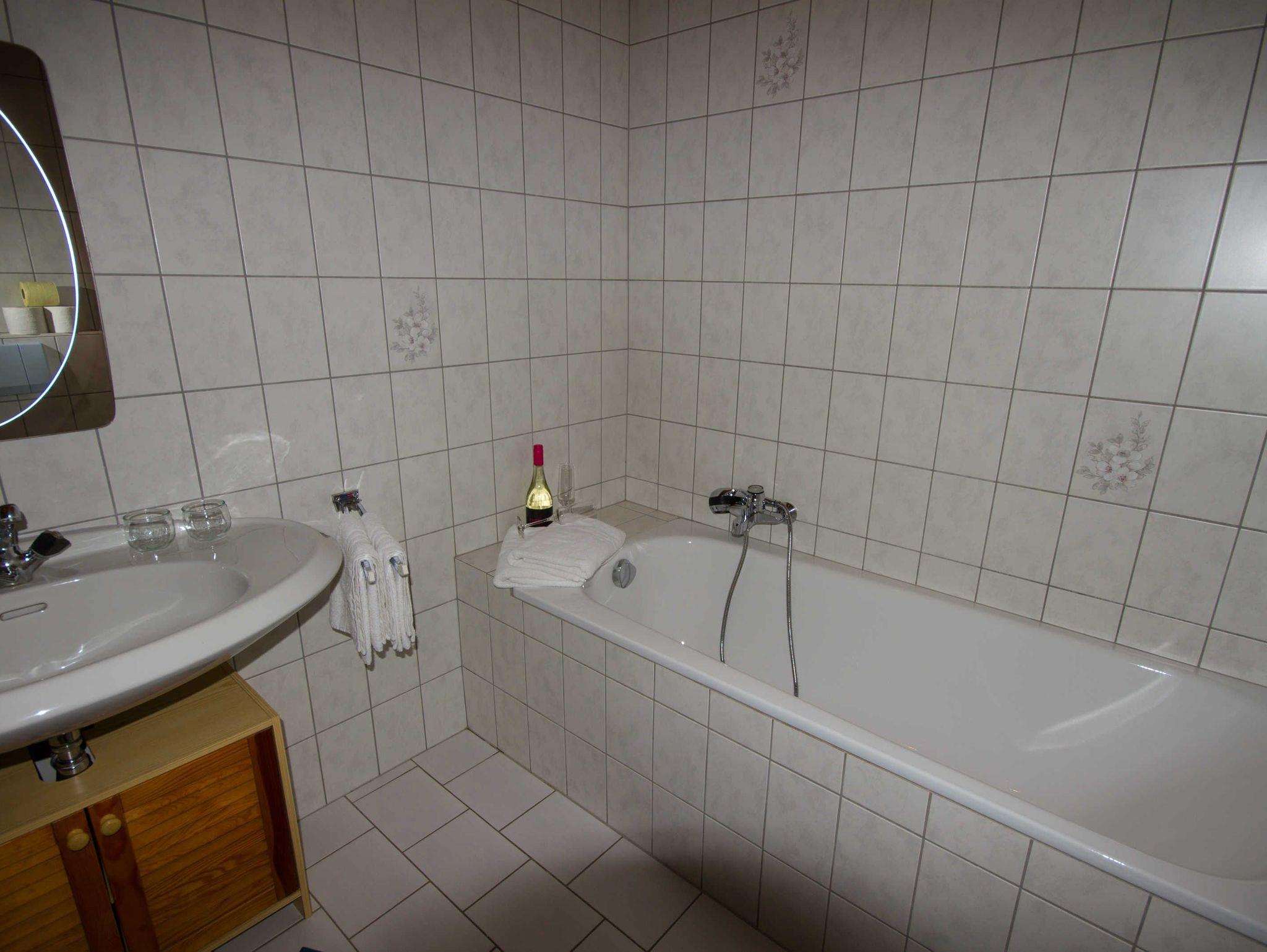 Der Eingang unserer Ferienwohnung befindet sich ebenerdig. Der Zugang erfolgt direkt über unsere Gartenanlage. In unserem Garten befindet sich ein Teich mit kleinem Bachlauf und Beleuchtung. Vom Eingang kommt man direkt in die Wohnküche. Links und rechts davon sind zwei abgeschlossene Schlafzimmer und ein Badezimmer mit Dusche, WC und Badewanne. In den Schlafzimmern befindet sich jeweils ein Doppelbettzimmer. In einem der Zimmer steht zudem ein drittes Bett. Vor dem Wohnungseingang gibt es einen großen Tisch mit Sitzbänken. Auch ein Gartengrill steht Ihnen zur Verfügung.