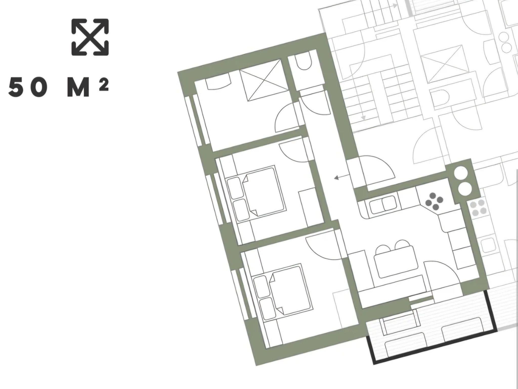 • Möbel sind fix eingebaut und lassen sich nicht verschieben.