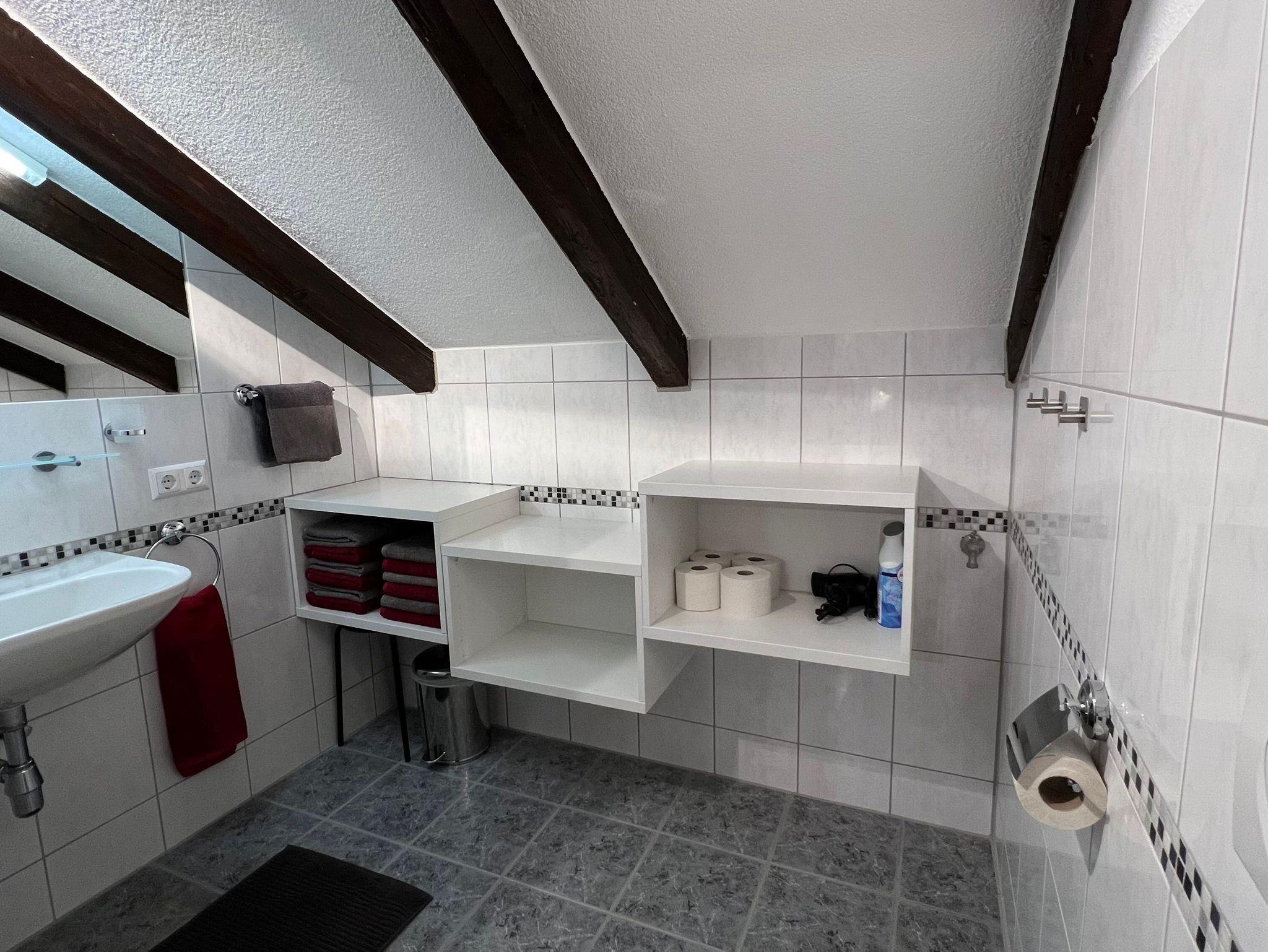 Das Badezimmer ist mit Dusche, Waschbecken und WC ausgestattet.