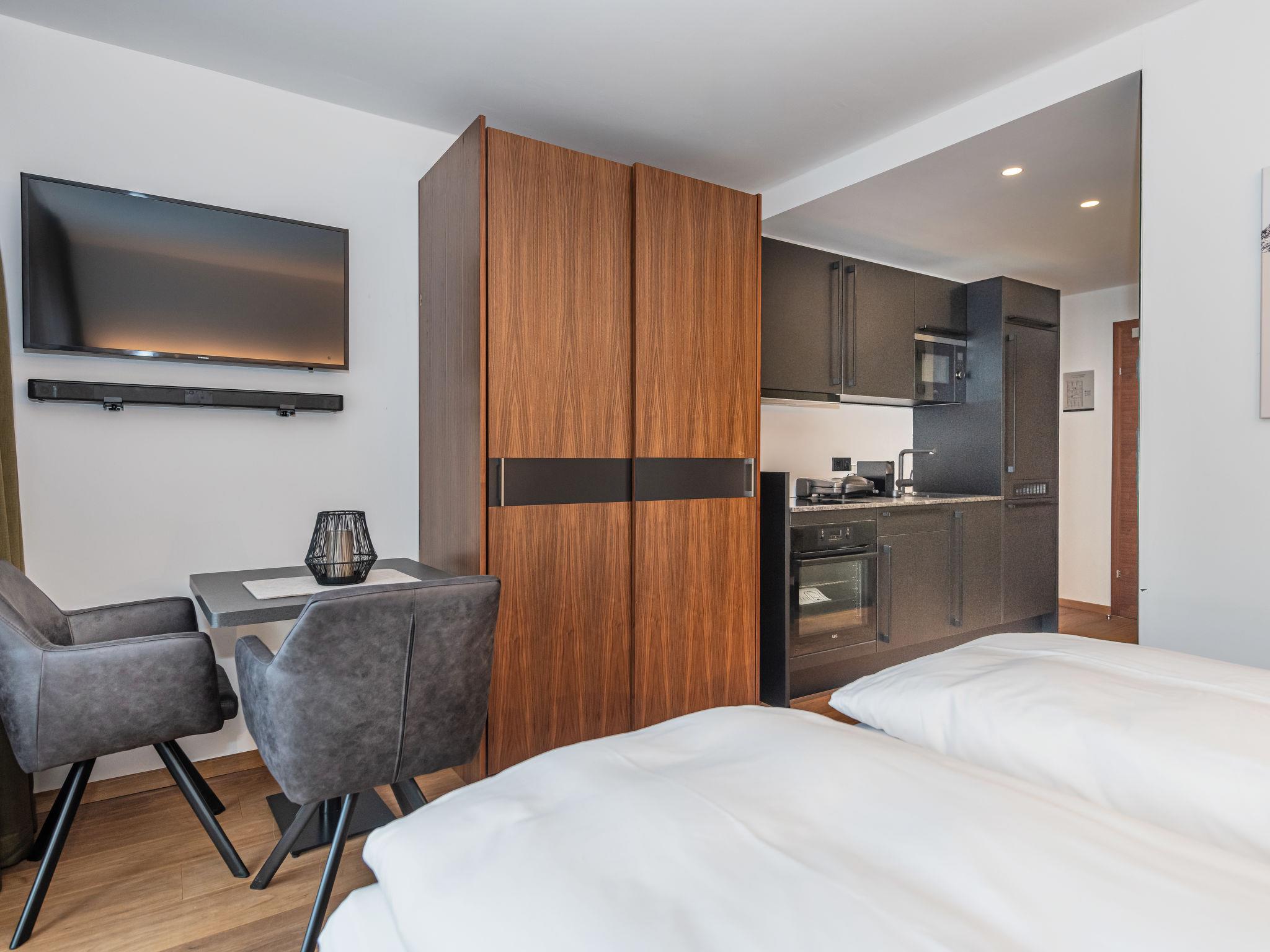"Studio Taxacher", 1-room studio 31 m2. Modern and tasteful furnishings: living/sleeping room with 1 double sofabed, 1 double bed, dining nook and satellite TV (flat screen). (oven, 4 ceramic glass hob hotplates, toaster, kettle, microwave, electric coffee machine). Shower, sep. WC. Heating. Balcony or terrace. Terrace furniture. Beautiful view of the mountains. Facilities: hair dryer. Internet (WiFi, free). Please note: non-smokers only. The property is one of a type of property or apartment.