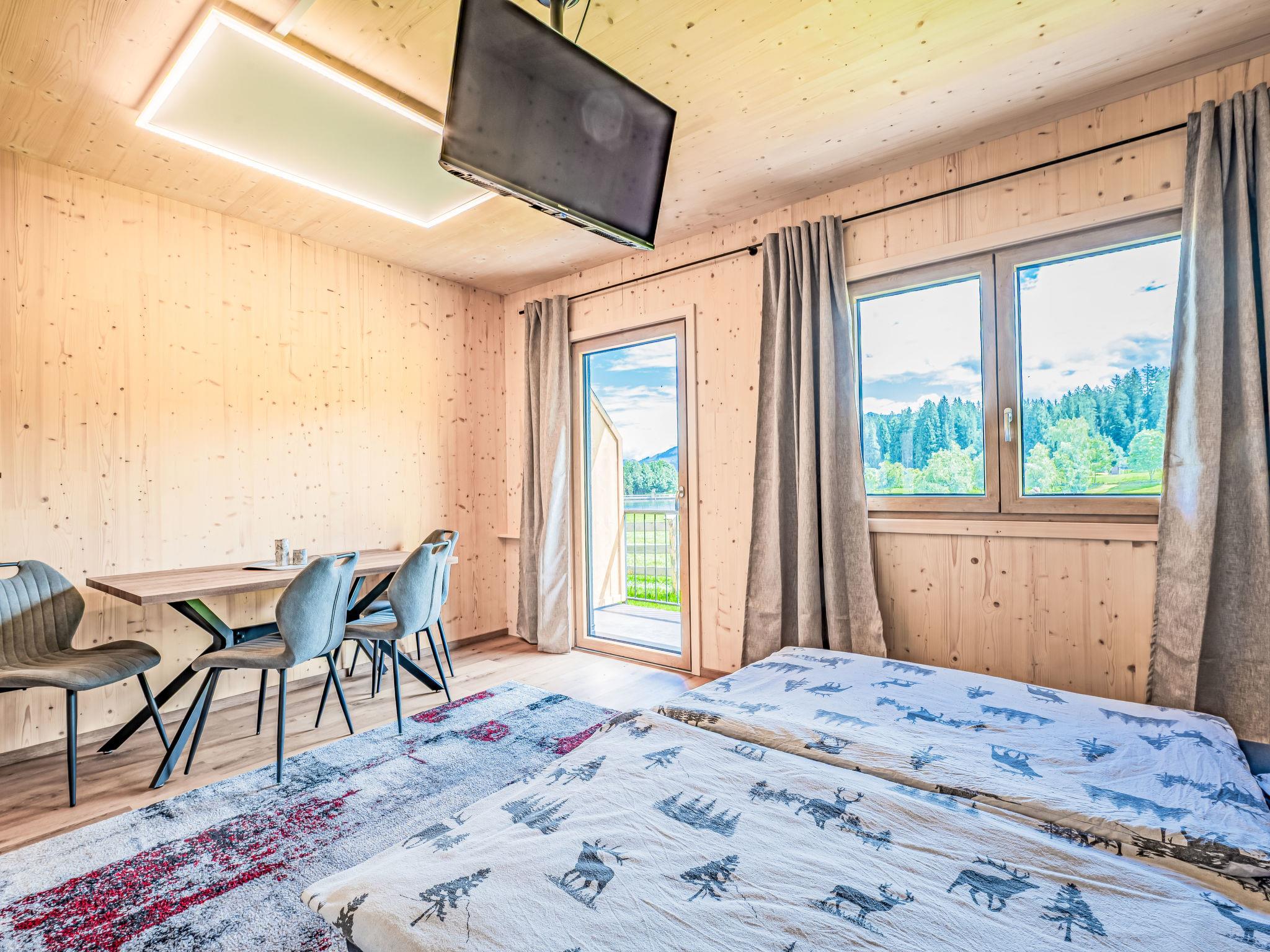 "2 Zimmer", 2-room apartment 30 m2. Beautiful and cosy furnishings: living/sleeping room with 1 double bed (180 cm, length 200 cm), dining table and TV (flat screen). Open kitchen in the entrance (oven, 2 ceramic glass hob hotplates, toaster, kettle, electric coffee machine). Shower/WC. Heating. Balcony. Balcony furniture. Beautiful panoramic view of the lake and the mountains. Free. Please note: non-smokers only. Smoke alarm.