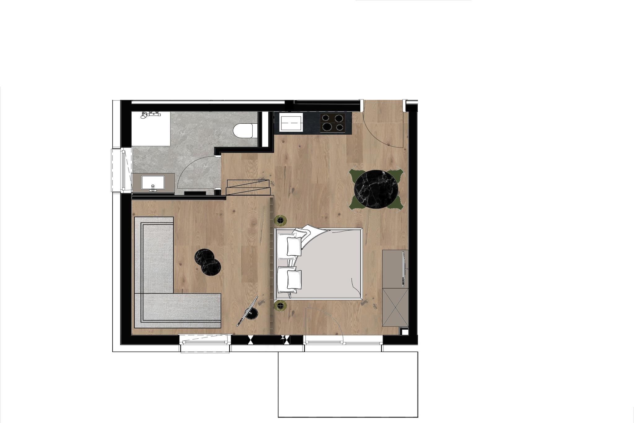 , Stue(enkeltsovesofa, Fjernsyn, spisebord), åbent køkken(kogeplade, elkedel, brødrister, komfur, kaffemaskine, ovn, opvaskemaskine , køleskab), soveværelse(dobbeltseng, Fjernsyn), badeværelse(bruser, toilet, føntørrer), Internetadgang, balkon, terrasse, parkering, elevator, Ladestation til el-biler,